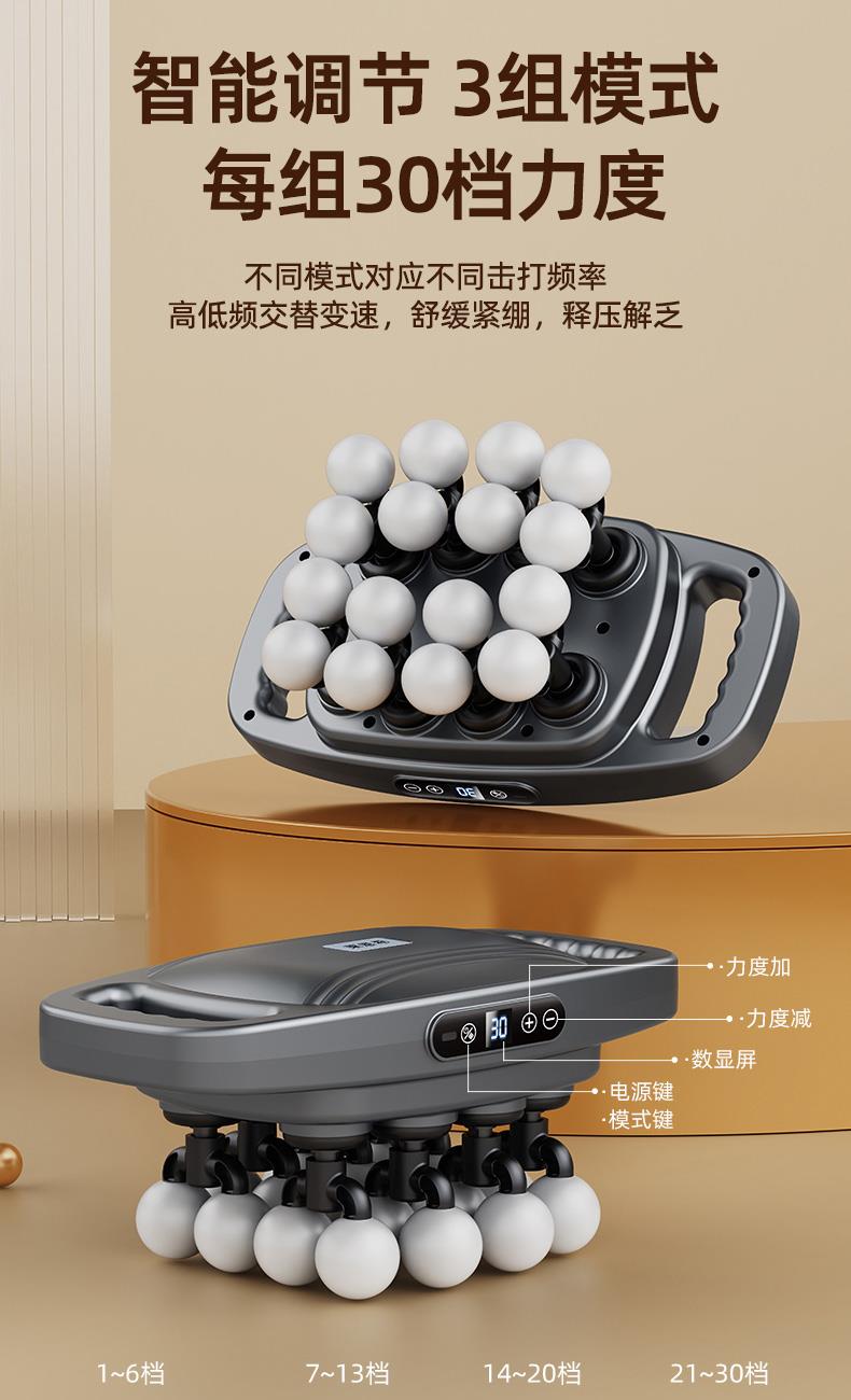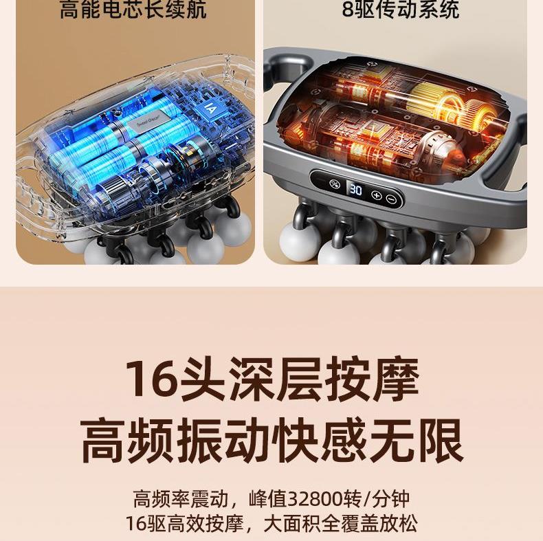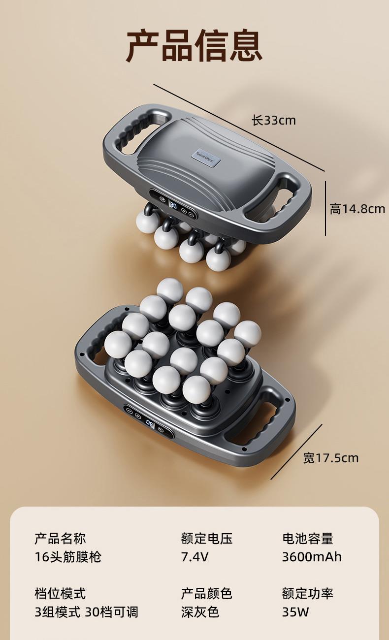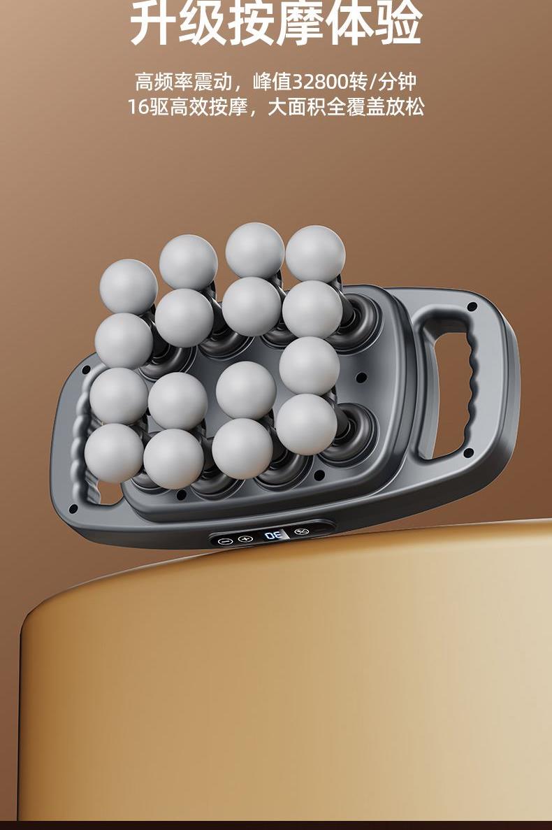 电池容量:3600mAh 控制方式:触摸屏按键操作 功率:7.4W 适用部位:全身 材质:ABS 颜色:灰色 净重:1.22K 毛重: 1.4Kg 产品尺寸:32x17x11cm 48KG 大推力搭配 8 驱传动系统,动力输出稳定可控,能轻松穿透表层肌肉,直击深层肌群痛点,告别浅层按摩的 “表面功夫”,快速瓦解颈肩腰背的顽固紧绷感。 16 头多维按摩矩阵,实现大范围肌群包裹式按摩,无论是肩颈、腰背、大腿还是小腿,都能做到无死角贴合,告别传统按摩仪 “局部照顾不到” 的弊端,全身肌群都能享受到深度舒缓。 峰值可达 32800 转 / 分钟的高频率震动,结合高低频交替变速技术,模拟专业按摩师的轻重捶打手法,层层松解肌肉粘连,快速释放运动后乳酸堆积,缓解日常久坐久站带来的肌肉酸胀。 内置 3 组专属按摩模式,每组模式下配备 30 档力度调节,不同模式对应不同击打频率,可根据肩颈、腰背、四肢等不同部位的耐受度,以及放松、释压、恢复等不同需求,匹配专属方案,全家都能找到舒适节奏。搭载高能耐用电芯,一次充电可满足多次高频使用,无需频繁找插座,不管是居家躺卧放松、办公室工位舒缓,还是出差旅行随身带,都能开启按摩 “续命” 模式,续航无焦虑