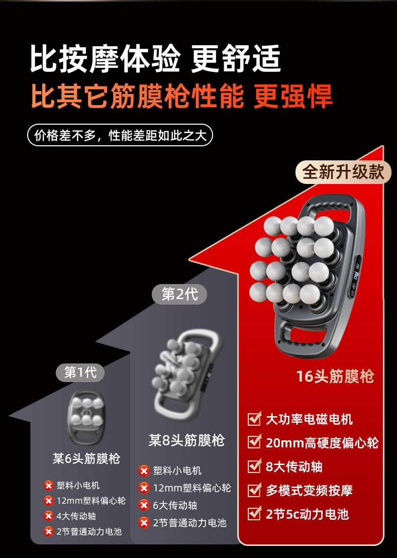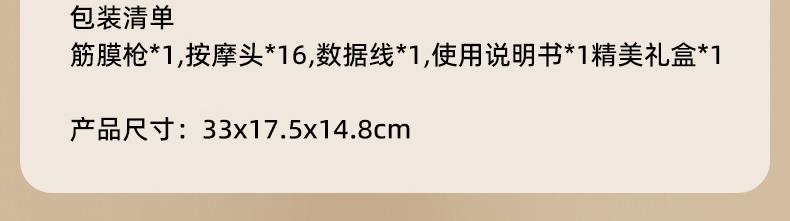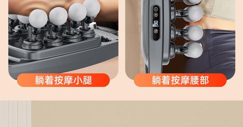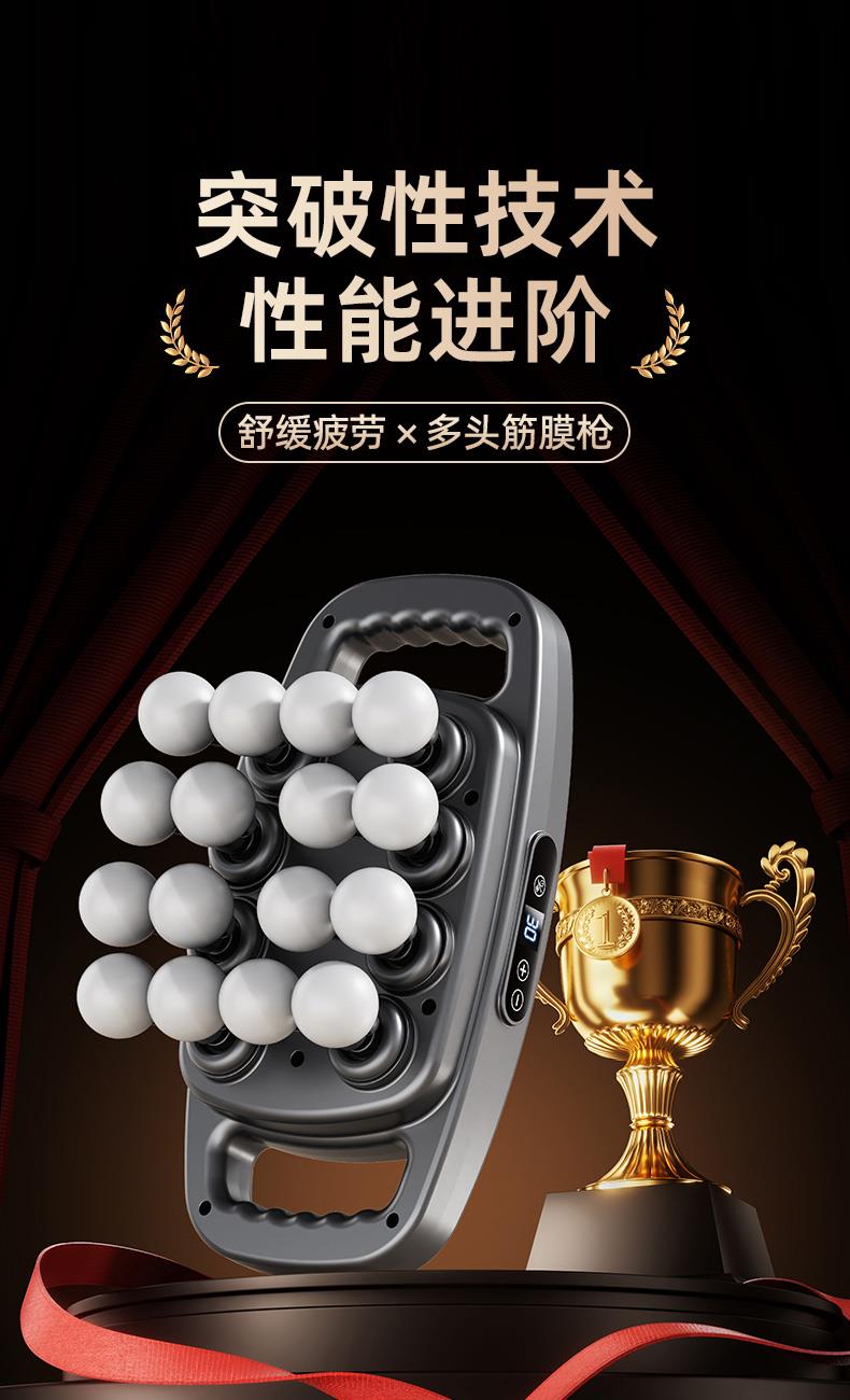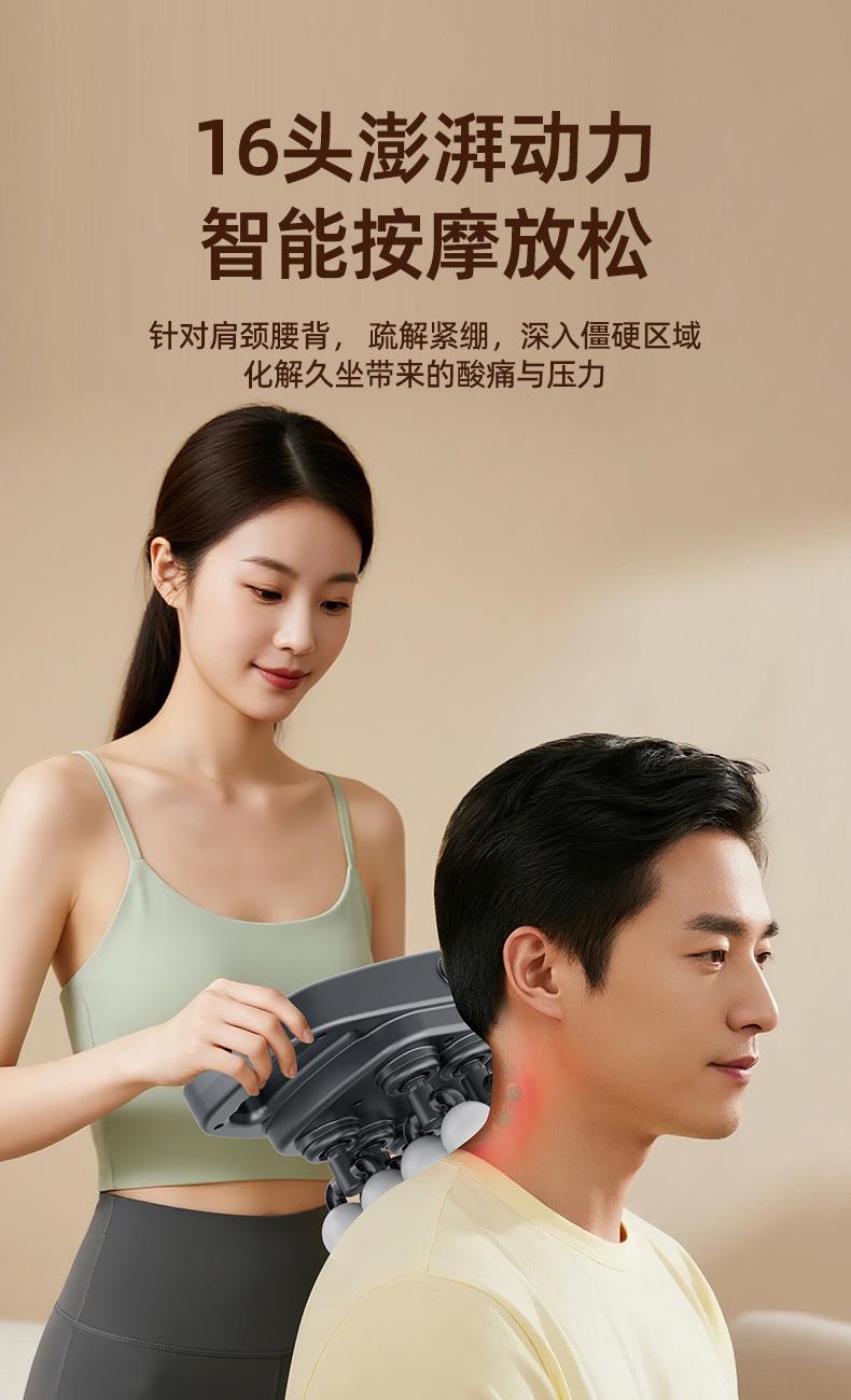 电池容量:3600mAh 控制方式:触摸屏按键操作 功率:7.4W 适用部位:全身 材质:ABS 颜色:灰色 净重:1.22K 毛重: 1.4Kg 产品尺寸:32x17x11cm 48KG 大推力搭配 8 驱传动系统,动力输出稳定可控,能轻松穿透表层肌肉,直击深层肌群痛点,告别浅层按摩的 “表面功夫”,快速瓦解颈肩腰背的顽固紧绷感。 16 头多维按摩矩阵,实现大范围肌群包裹式按摩,无论是肩颈、腰背、大腿还是小腿,都能做到无死角贴合,告别传统按摩仪 “局部照顾不到” 的弊端,全身肌群都能享受到深度舒缓。 峰值可达 32800 转 / 分钟的高频率震动,结合高低频交替变速技术,模拟专业按摩师的轻重捶打手法,层层松解肌肉粘连,快速释放运动后乳酸堆积,缓解日常久坐久站带来的肌肉酸胀。 内置 3 组专属按摩模式,每组模式下配备 30 档力度调节,不同模式对应不同击打频率,可根据肩颈、腰背、四肢等不同部位的耐受度,以及放松、释压、恢复等不同需求,匹配专属方案,全家都能找到舒适节奏。搭载高能耐用电芯,一次充电可满足多次高频使用,无需频繁找插座,不管是居家躺卧放松、办公室工位舒缓,还是出差旅行随身带,都能开启按摩 “续命” 模式,续航无焦虑