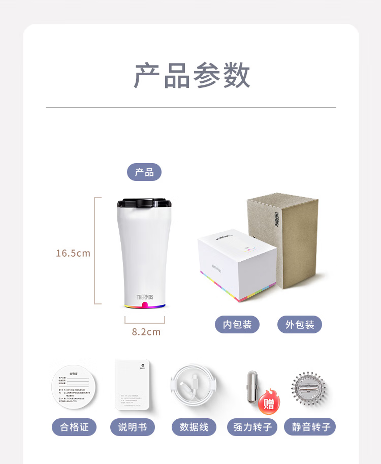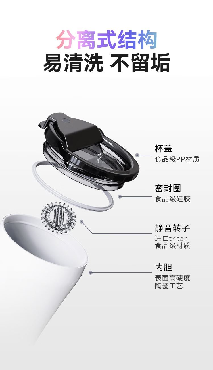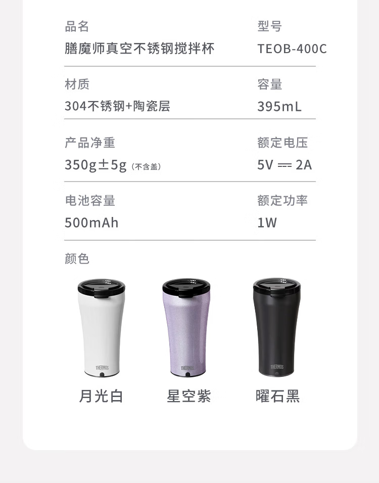 颜 色:黑色 白色 紫色 容 量:395ml 类 型:智能搅拌杯 材 质:304不锈钢+陶瓷涂层 电池容量:500mAH 额定功率:1W 额定电压:5V==2A