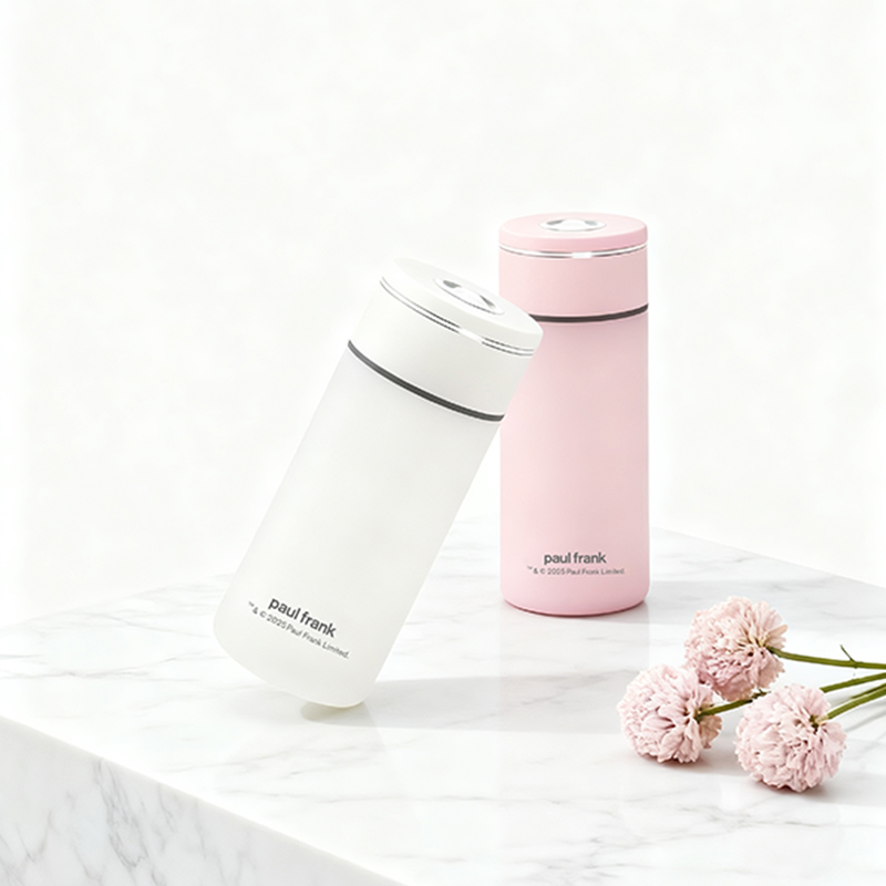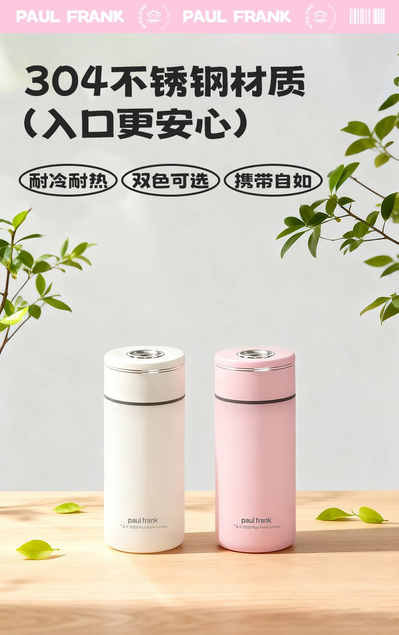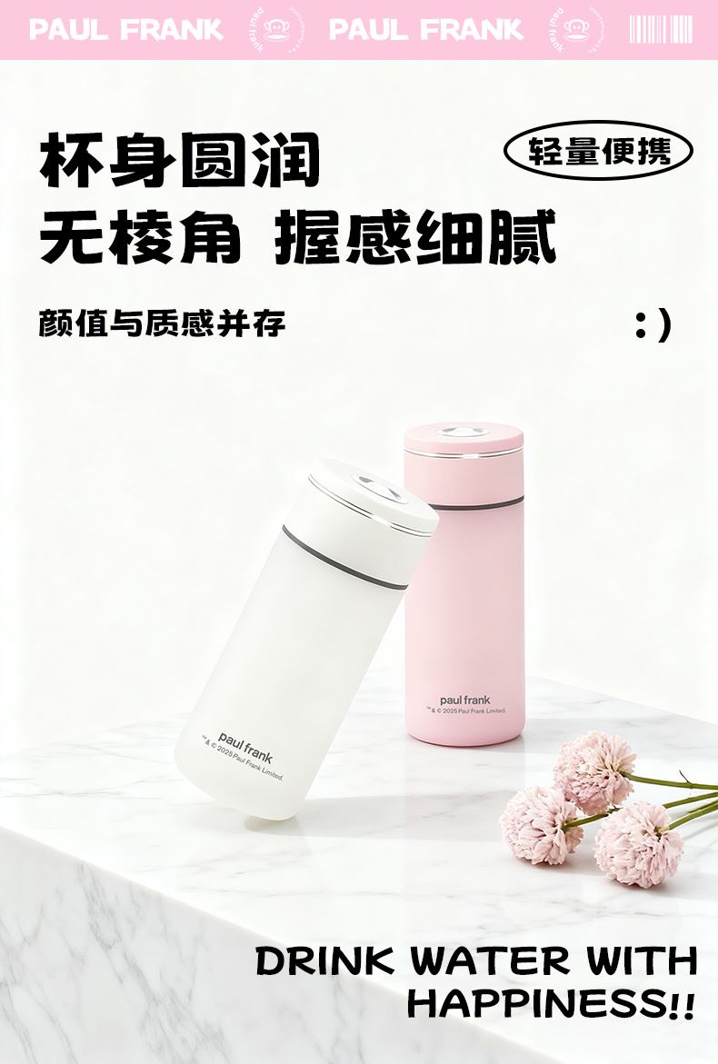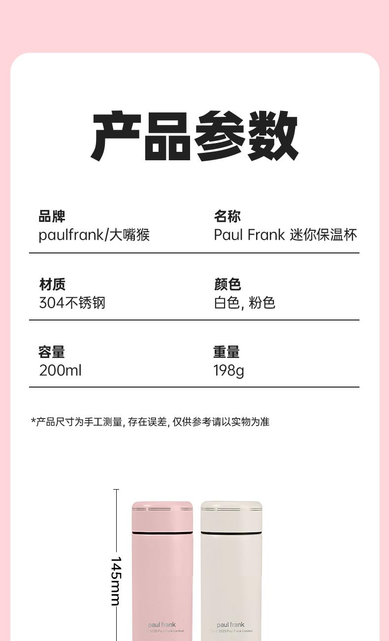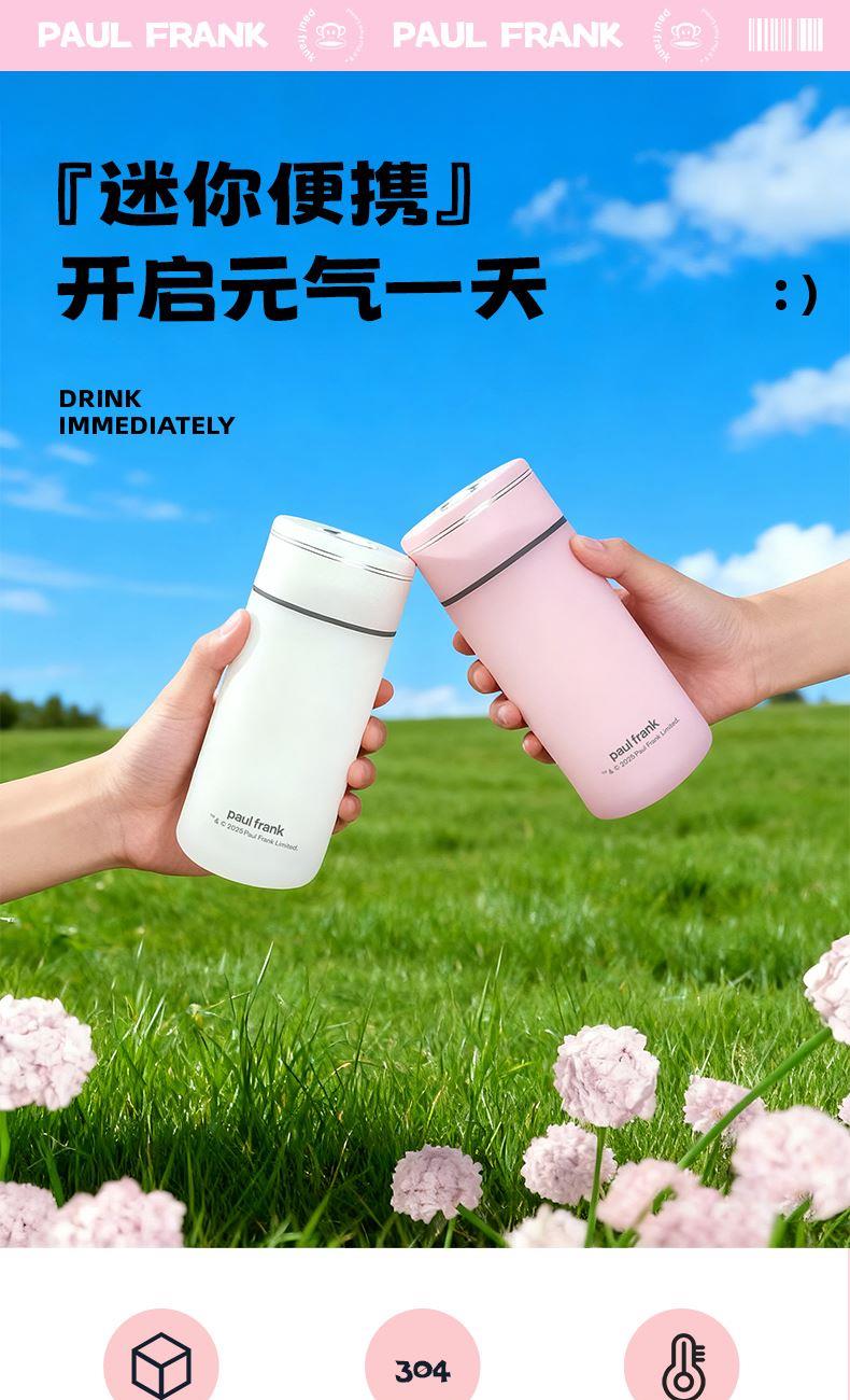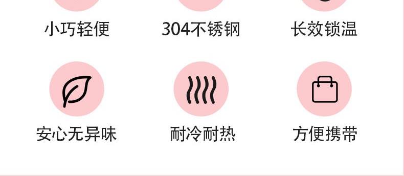 型 号:PF1005 颜 色:白色,粉色 材 质:304不锈钢 容 量:200ml 产品重量:198g 彩盒尺寸:6*6*15.5 69码:6978198831727 体型316不锈钢,符合安全标准,环保卫生; 2.携带自如,轻松装口袋,及时补水; 3.双色可选,底部硅胶垫设计,防止刮花杯底; 4.食品级多层硅胶圈,360度摇晃不漏水;