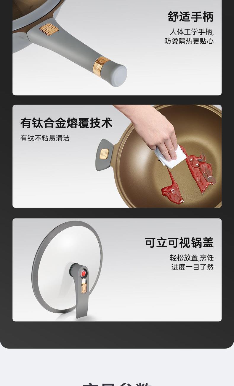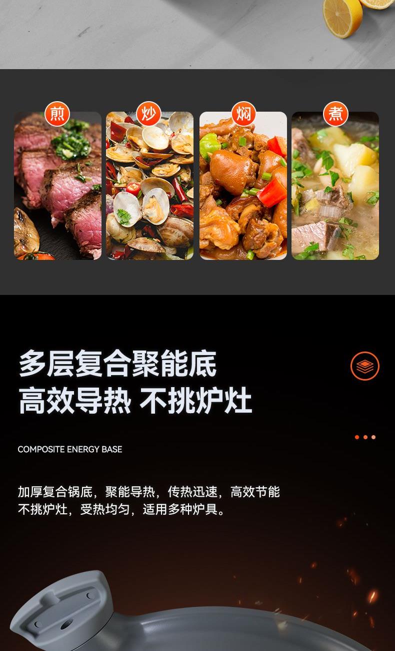 锅身直径:32cm 材质:铝压铸 将自身抗粘材料(具有低表面性能的非晶材料)通过熔覆技术与锅身内表面结合,形成微观凹凸结构,配合油膜达到抗粘效果; 钛合金广泛应用于航空航天及YIXUE领域具有密度小、强度高、耐腐蚀、耐高温等优点; 微压聚能快炖,20分钟炖出一锅靓汤节约30-60%的炖煮时间; 底部加厚聚能环科技防止糊锅,减少油烟,受热均匀。