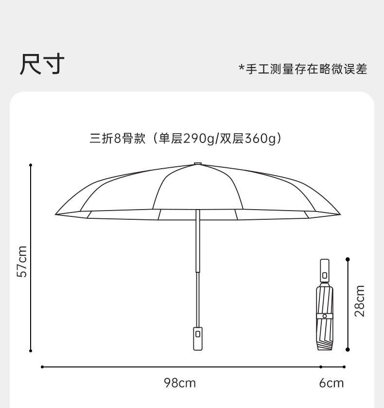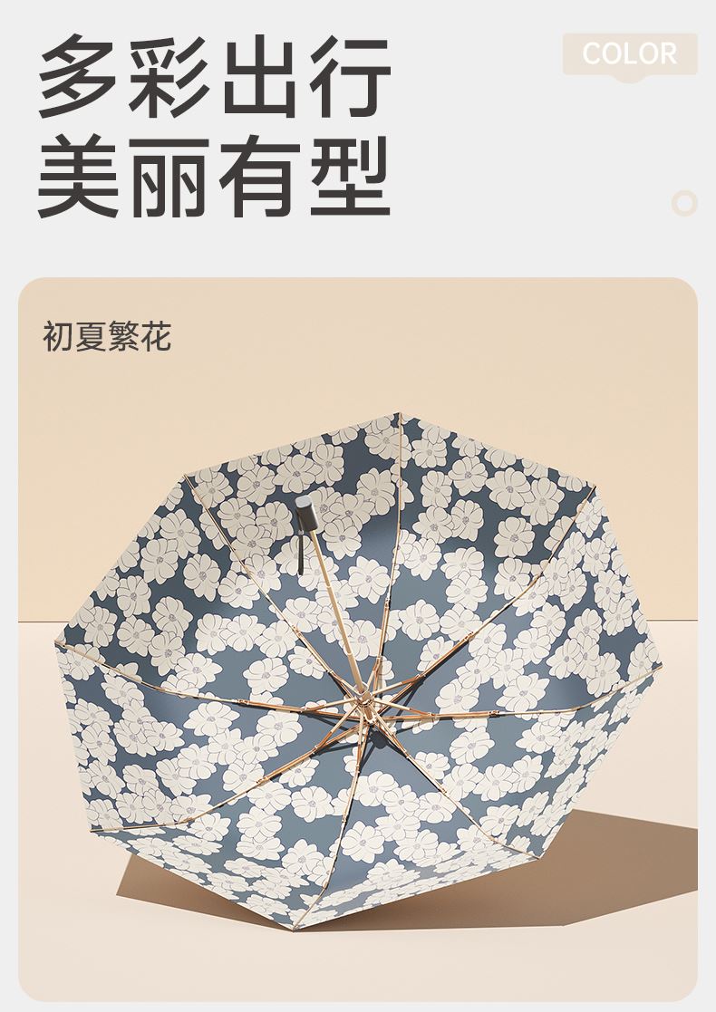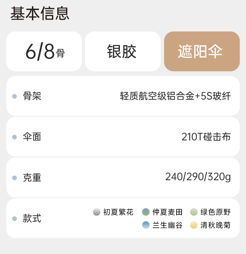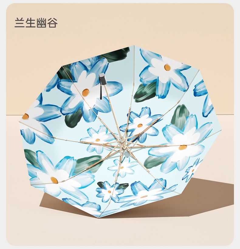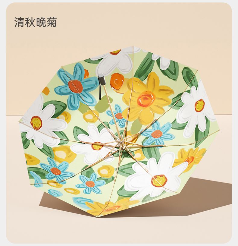 商品货号:ZD147 伞架材质:玻纤,铝合金 伞面材质:数码钛银 款式:手动三折遮阳伞 商品参数:直径:98cm 高度:57cm 收拢直径:6cm 收拢高度:27cm 商品毛重:310克 商品颜色:ZD147-油画-初夏繁花 ZD147-油画-仲夏麦田 ZD147-油画-绿色原野 ZD147-兰生幽谷 ZD147-清秋晚菊 商品包装:本布伞套