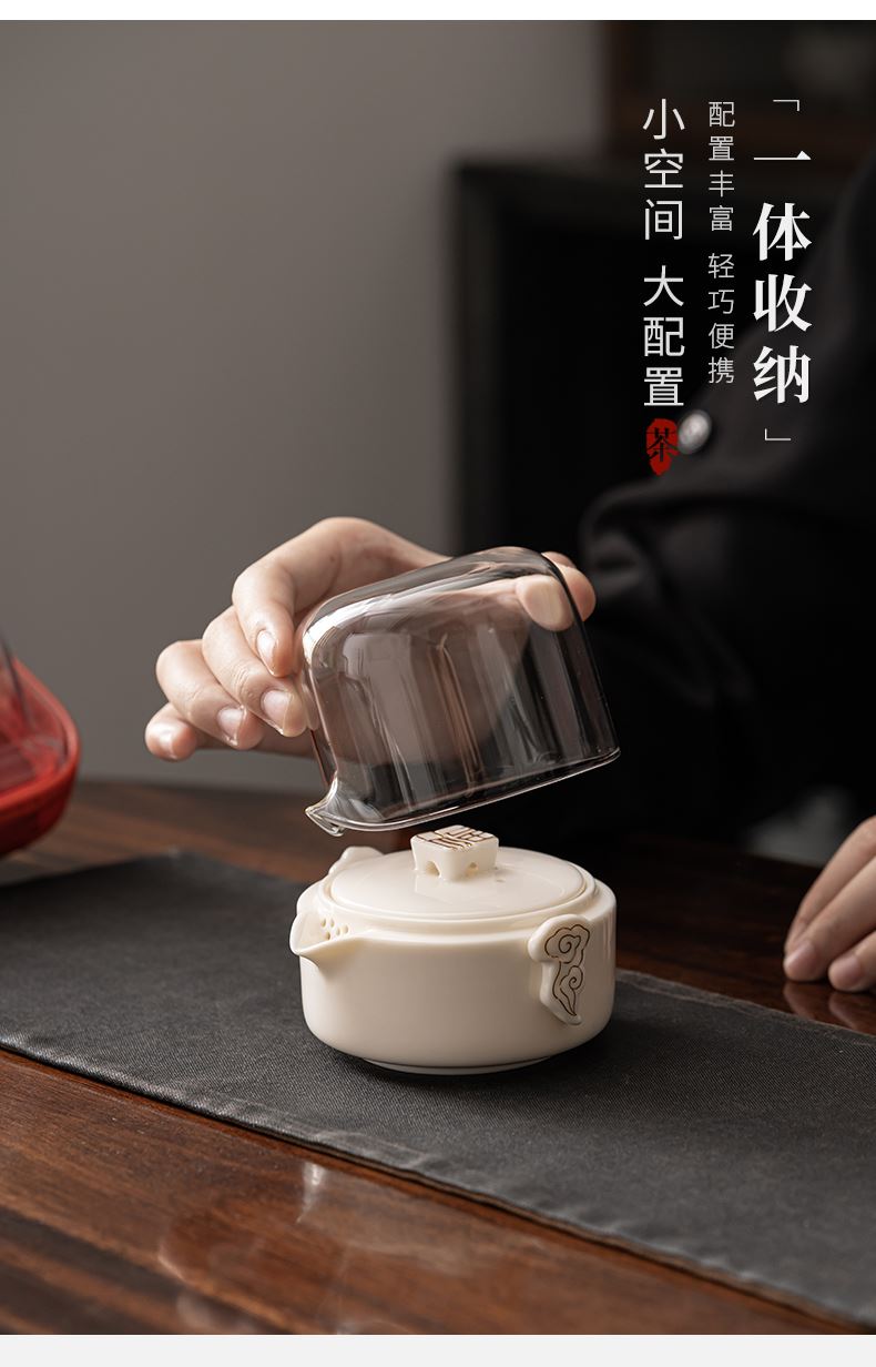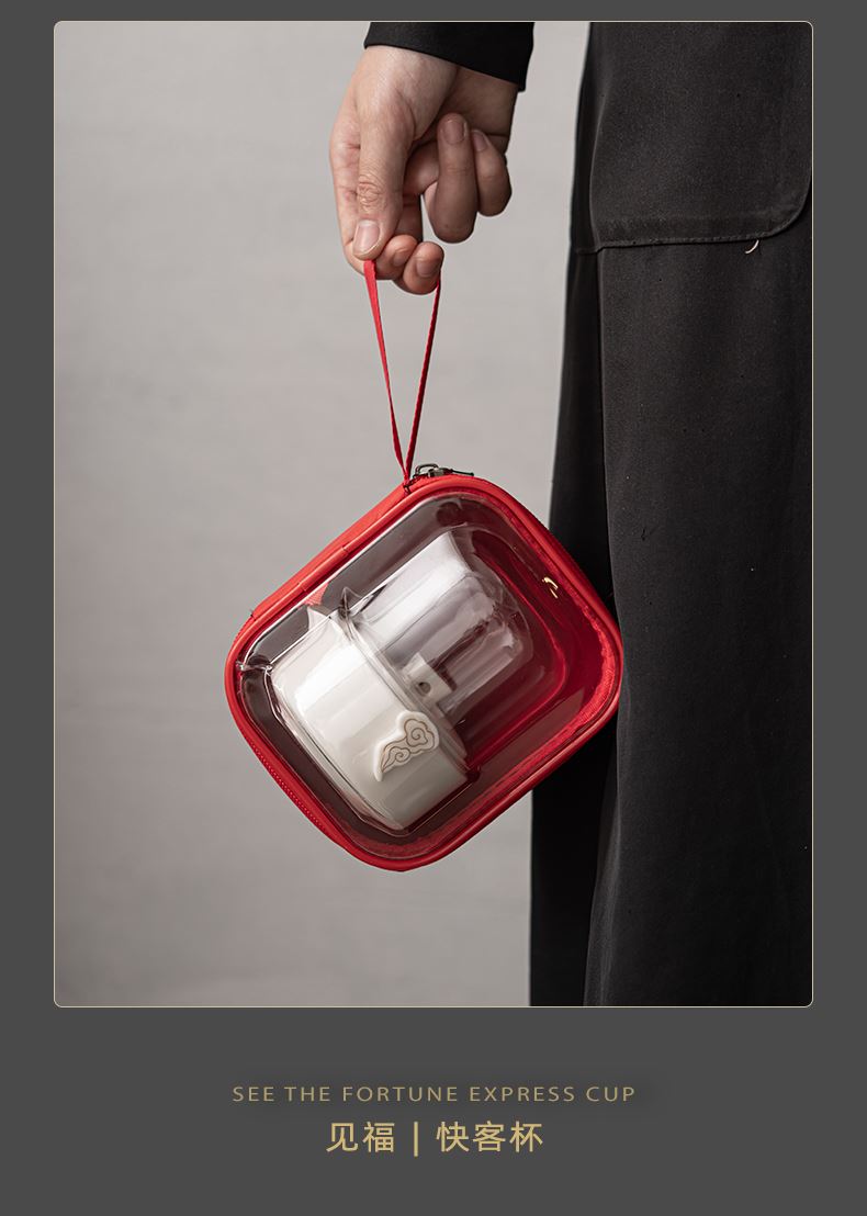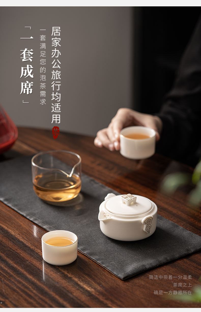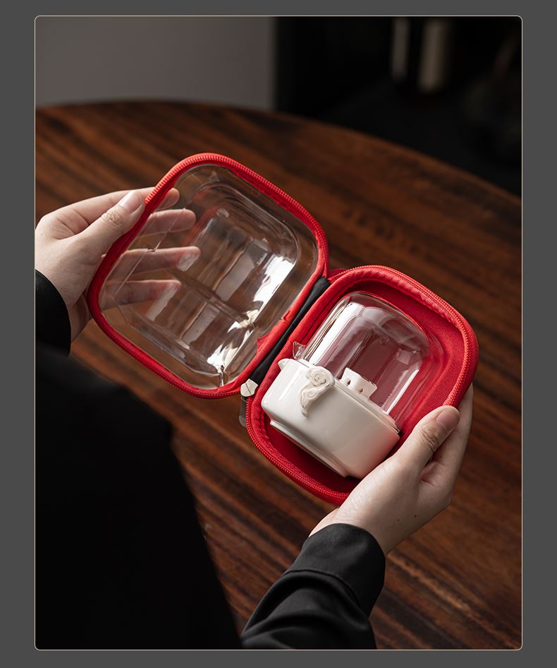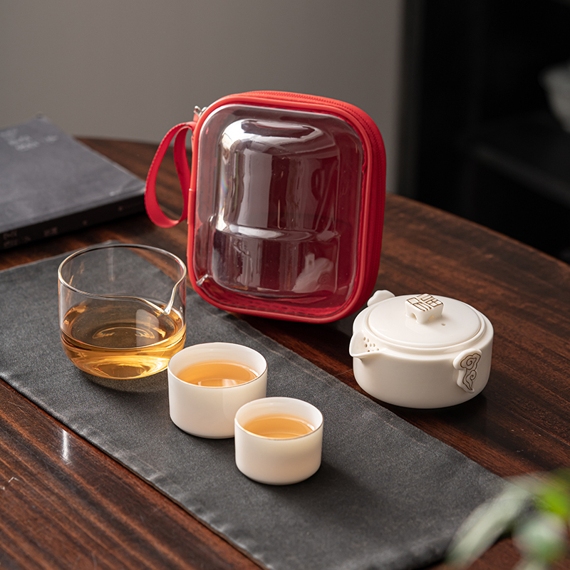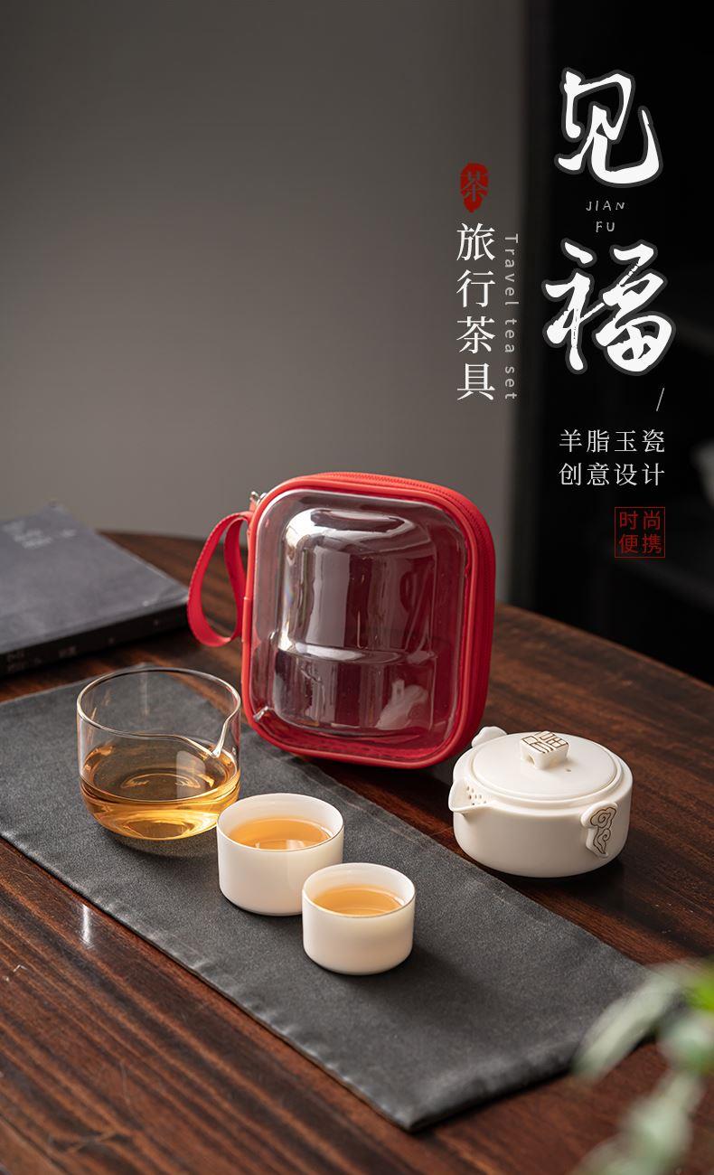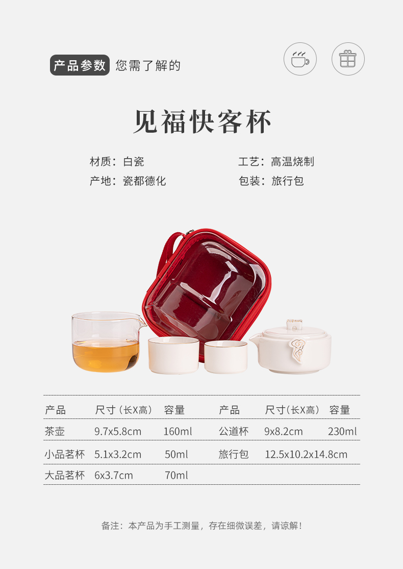 《见福4件套旅行套装》 配置:壶*1+玻璃茶海*1+杯子*2 材质:羊脂玉瓷 旅行包尺寸:12.5cm*10.2cm*14.8cm 包装:简易白盒+手提袋