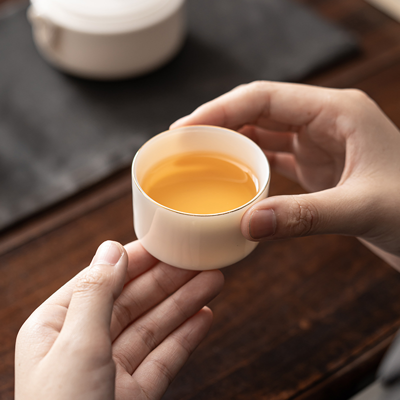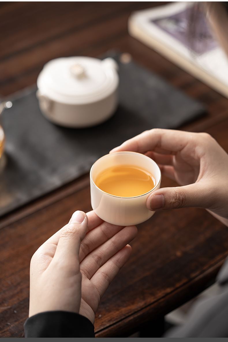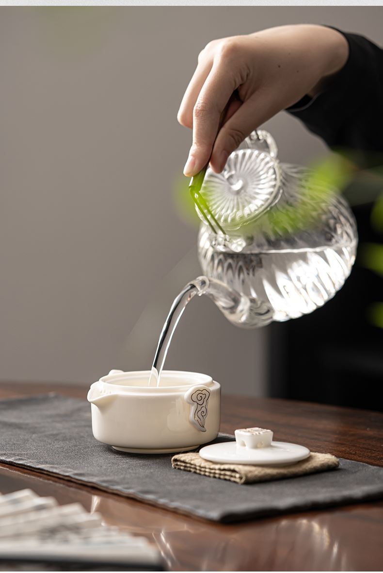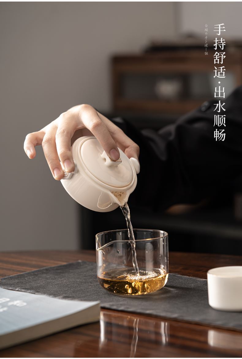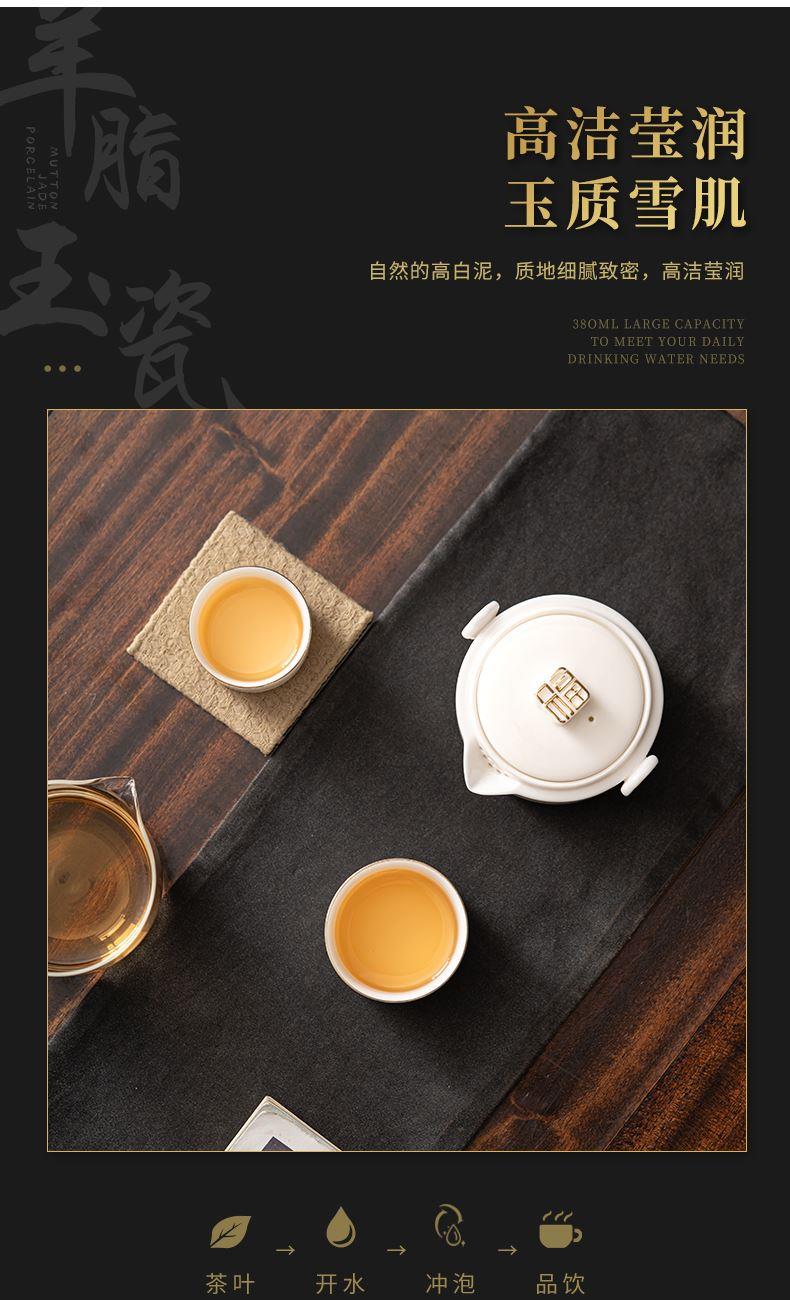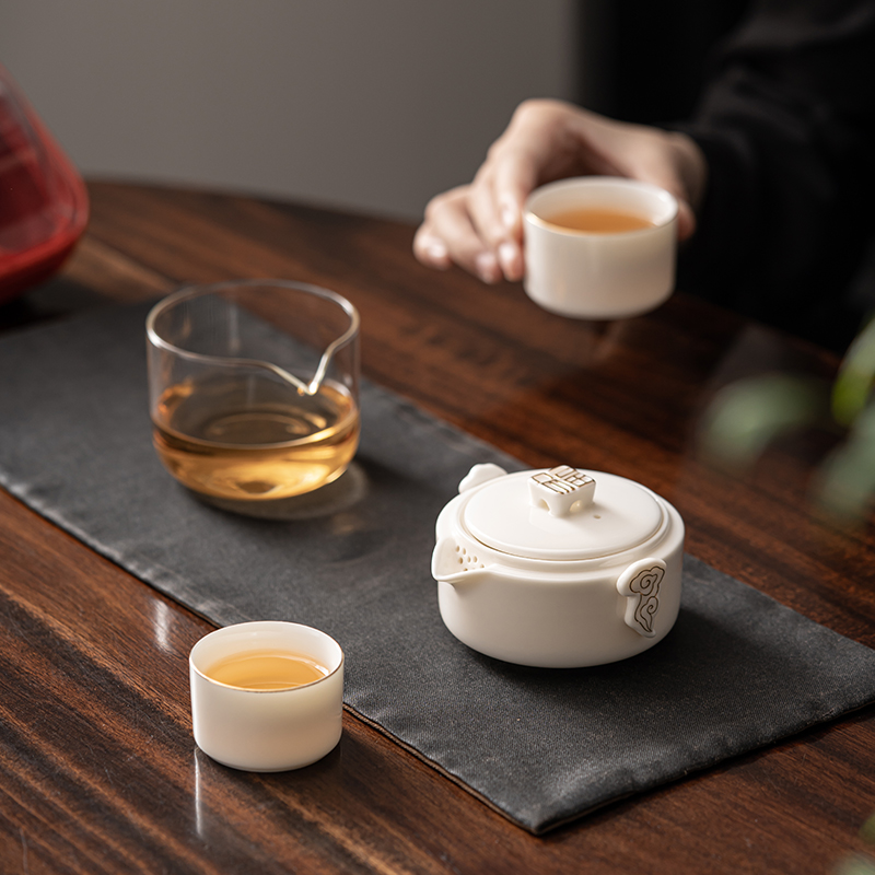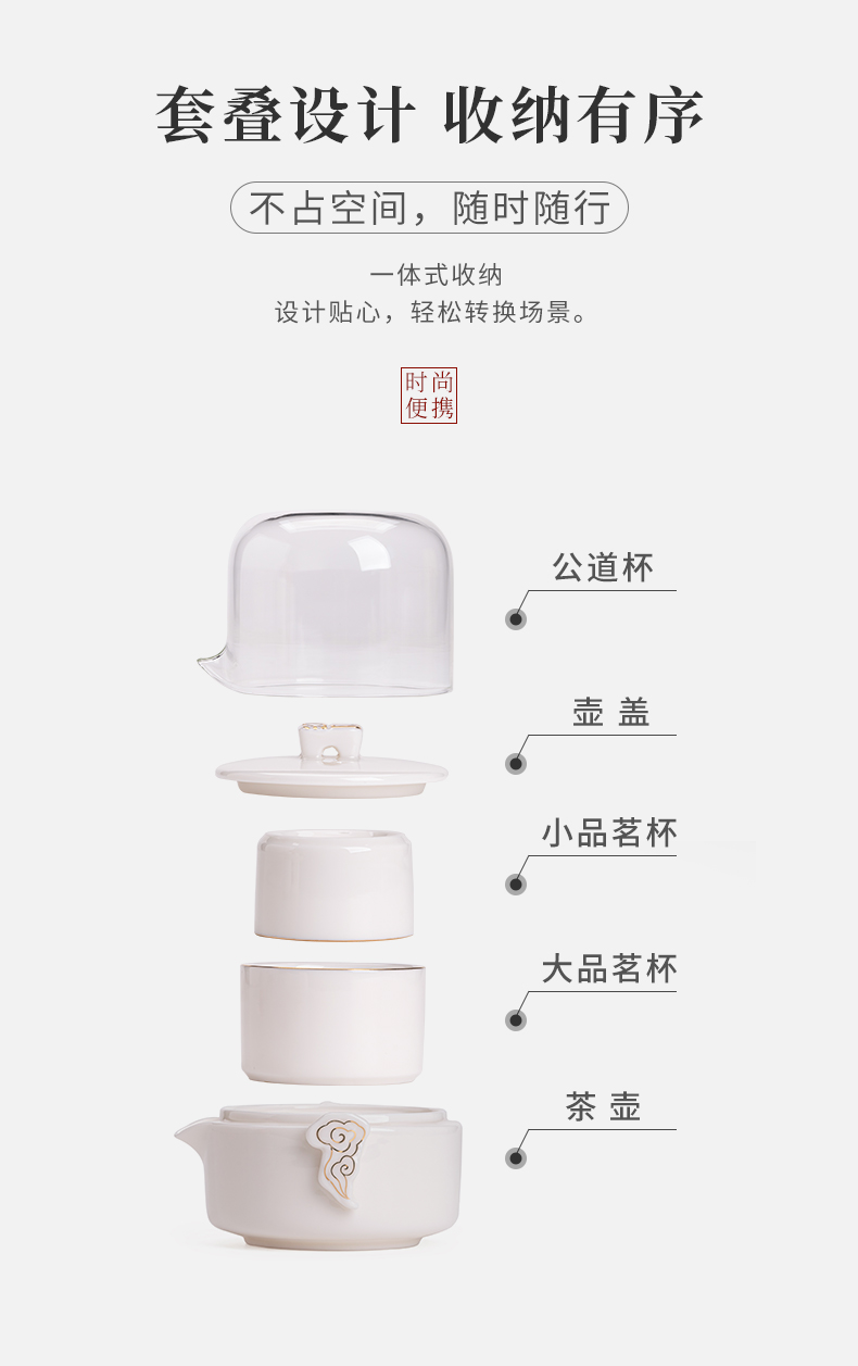 《见福4件套旅行套装》 配置:壶*1+玻璃茶海*1+杯子*2 材质:羊脂玉瓷 旅行包尺寸:12.5cm*10.2cm*14.8cm 包装:简易白盒+手提袋