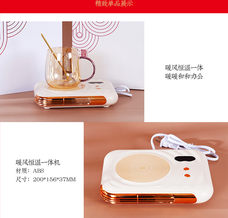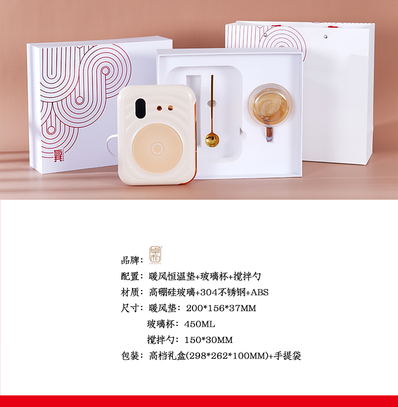 配置:暖风恒温垫+玻璃杯+搅拌勺 材质:高硼硅玻璃+304不锈钢+ABS 尺寸:暖风垫:200*156*37mm 玻璃杯:450ml 搅拌勺:150*30mm 包装:礼盒(298*262*100mm)+手提袋