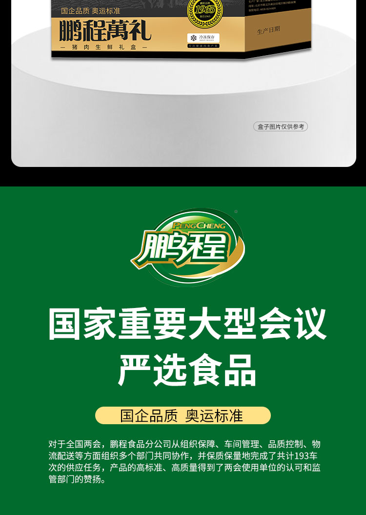 鹏程黑猪肉具有肉质紧实、脂肪含量低、口感细腻等特点,且注重无抗养殖和透明供应链管理 肉色鲜红,脂肪呈乳白色,具有明显大理石花纹,肉质细嫩有弹性 养殖周期12个月以上,采用中草药无抗饲料,全程透明可追溯 供应链覆盖种猪繁育、生猪养殖、屠宰加工至仓储物流,确保品质与安全 塞牧勒黑猪肉欢聚礼盒898型 梅花肉300g 五花肉400g 小里脊 300g 猪肉馅400g*2 汤骨400g 猪腿肉400g 肋排400g*2