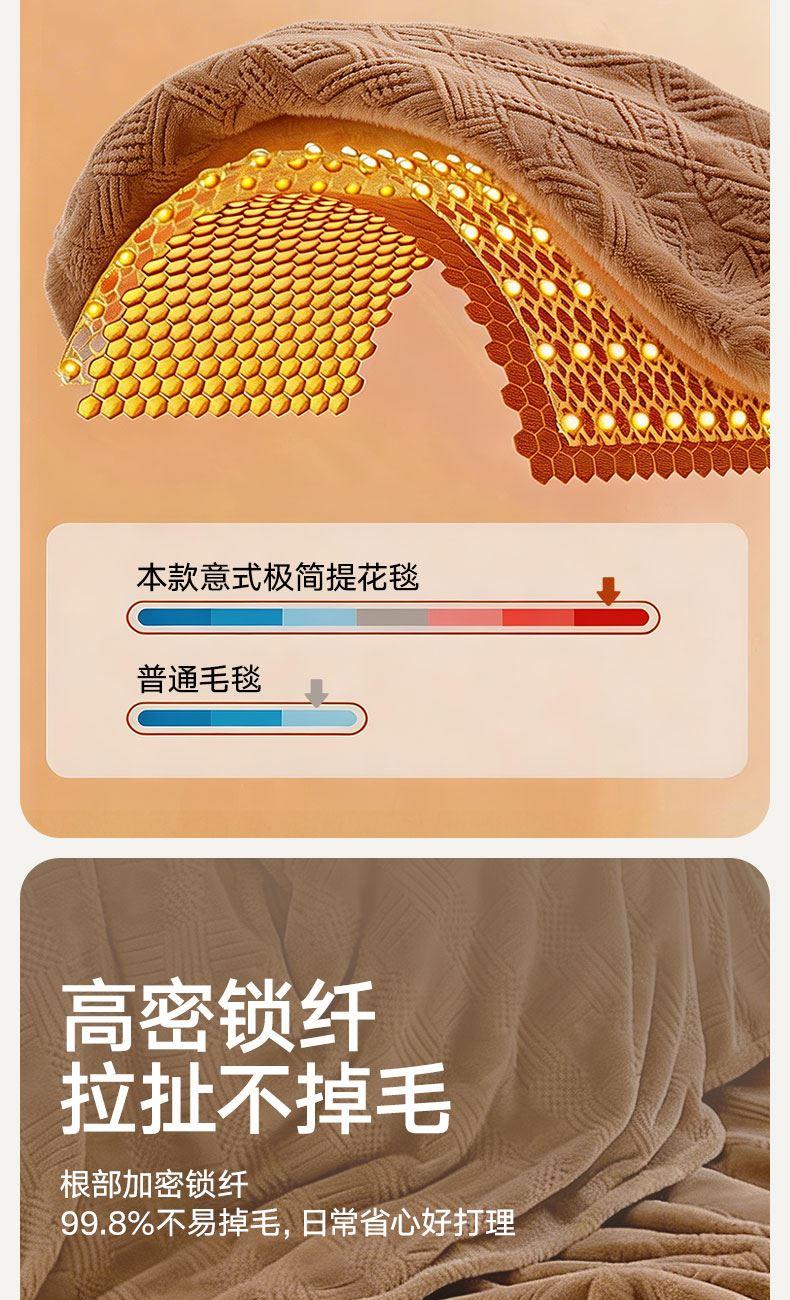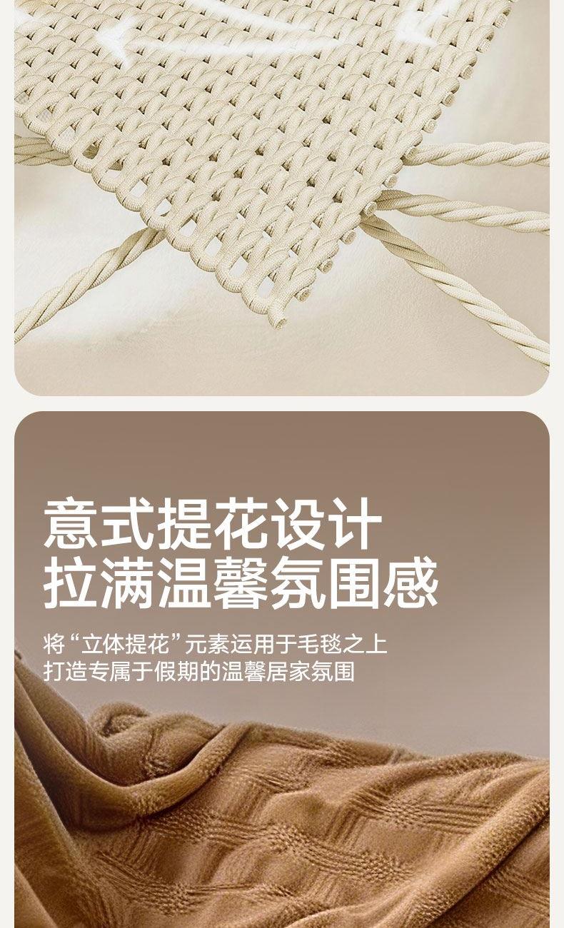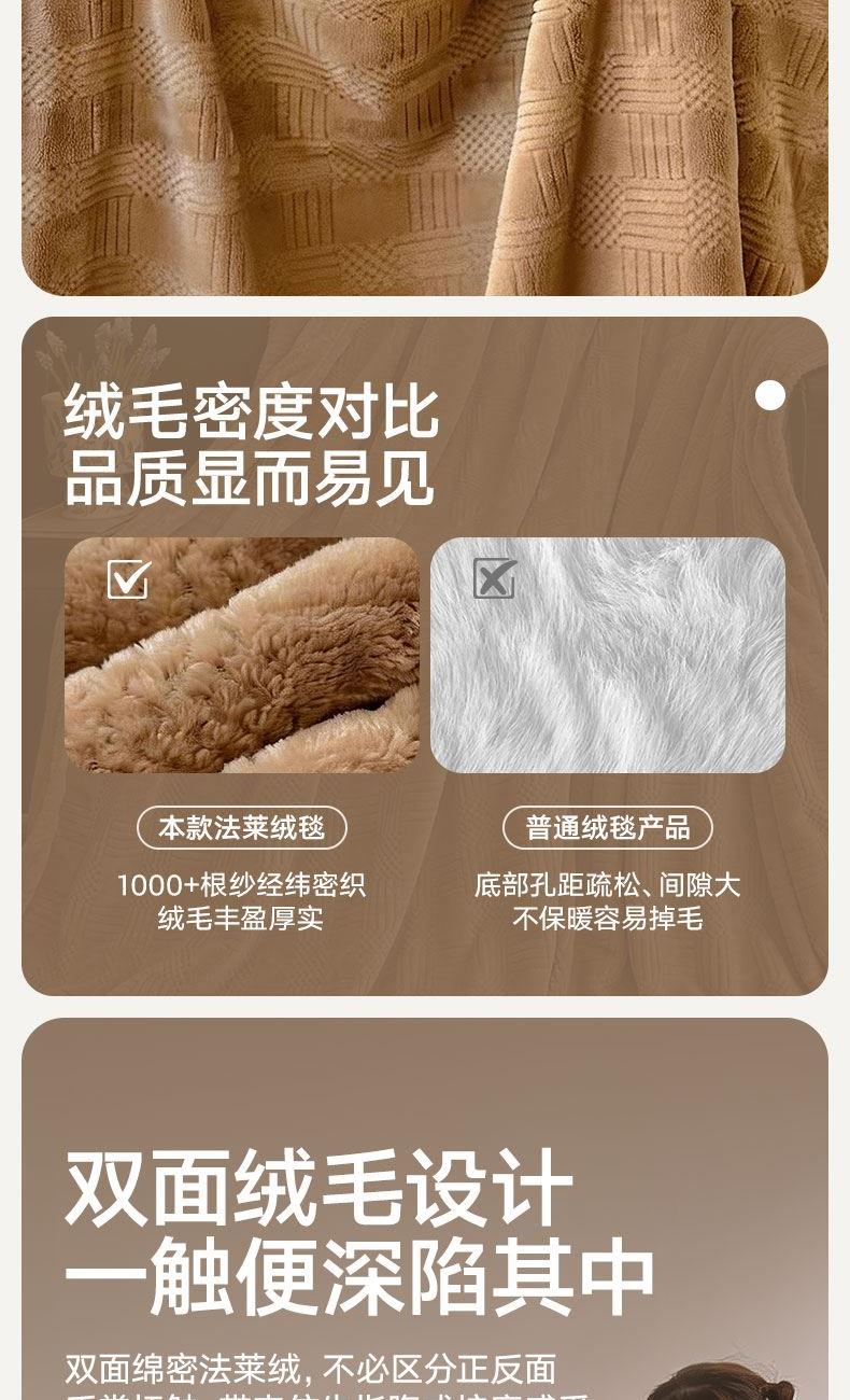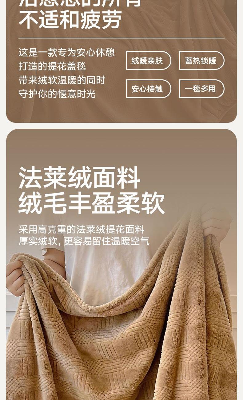 货 号 :HMT-2518 面 料 :提花法莱绒 规 格 :180*200cm 重 量 :净重约1000g 包装尺寸 :45*36*14.5cm 装 箱明细 :50条/包 1、采用提花法莱绒作为面料,触感比拟撸猫感。 2、加厚工艺,保暖性更强。 3、精致卷边,仪式感强。 4、搭配精美内袋,礼盒,彰显品 牌质感,高 端大气