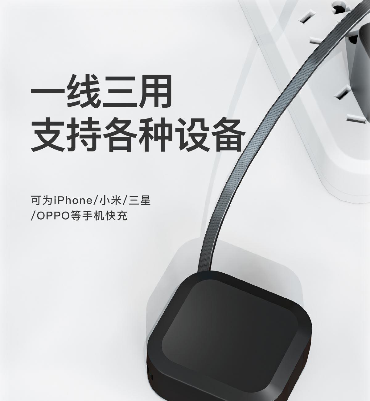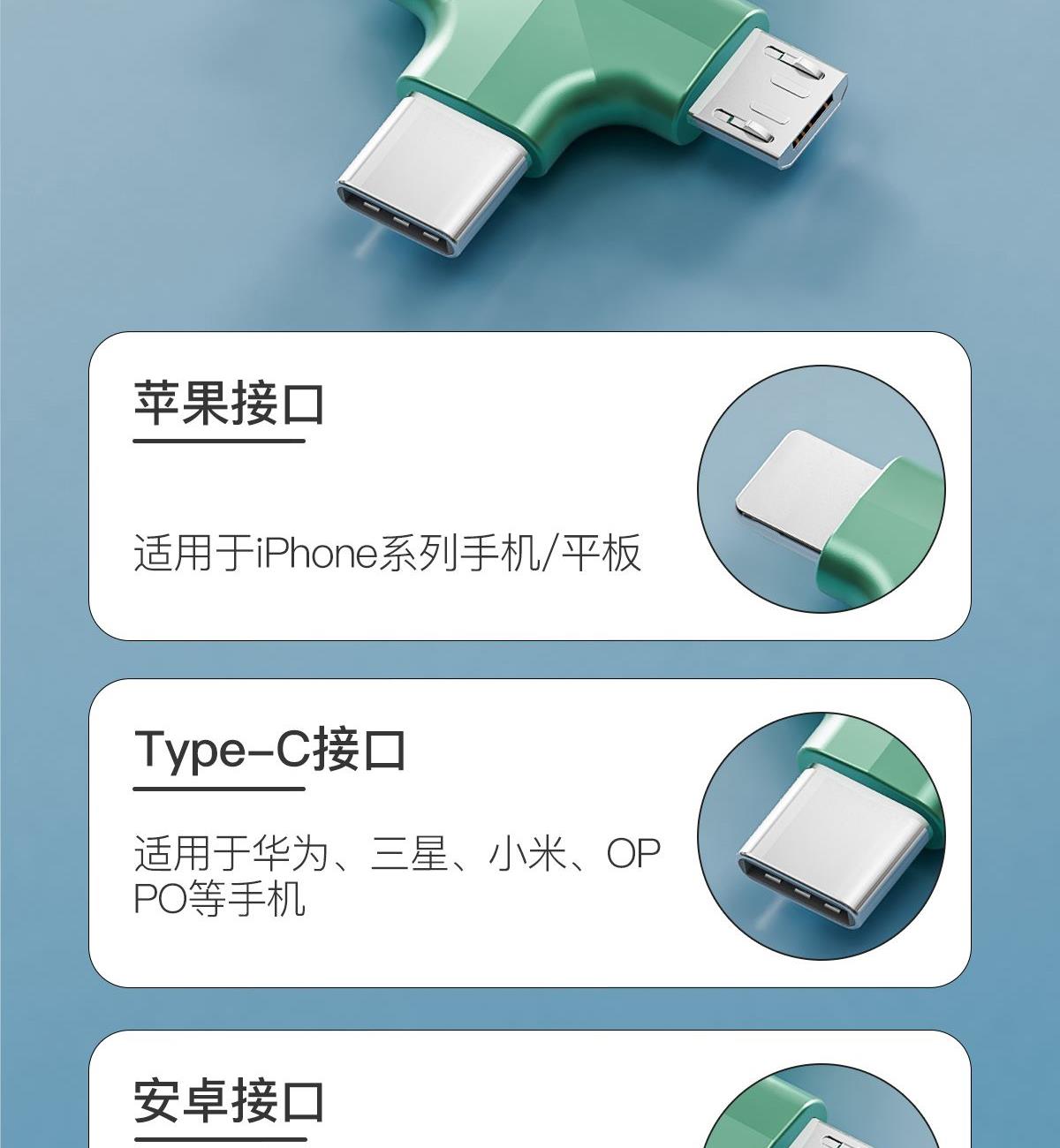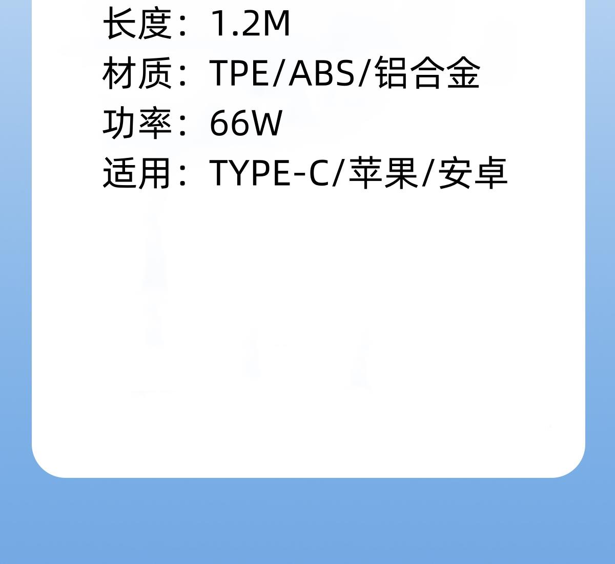型号:XY-008 长度:1.2M 材质:TPE/ABS/铝合金 功率:66W 适用:TYPE-C/苹果/安卓 颜色:红色,蓝色,绿色,白色,黑色 产品重量:约115g 产品卖点:Type-c接口支持快充, TPE环保材质,防缠绕,耐拉伸,经久耐用,加固接头,广泛兼容,适用市面绝大多数手机。