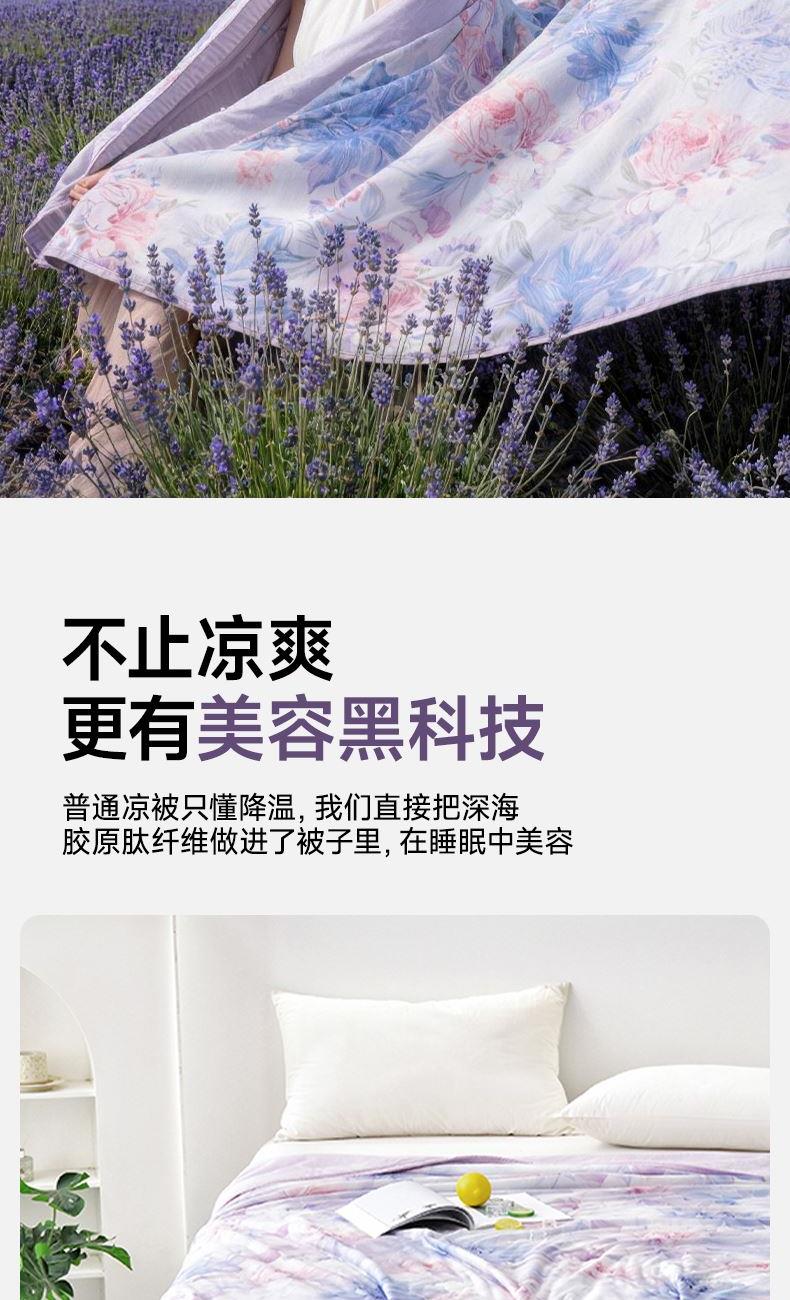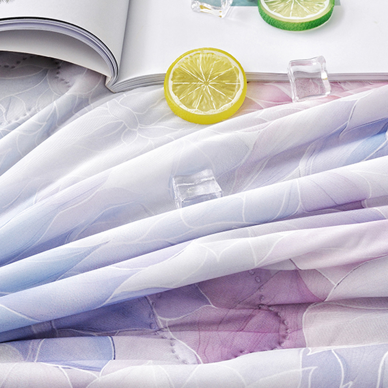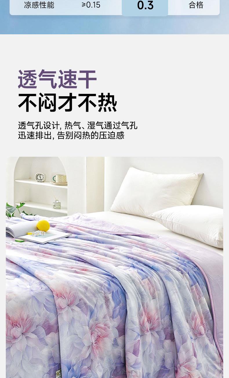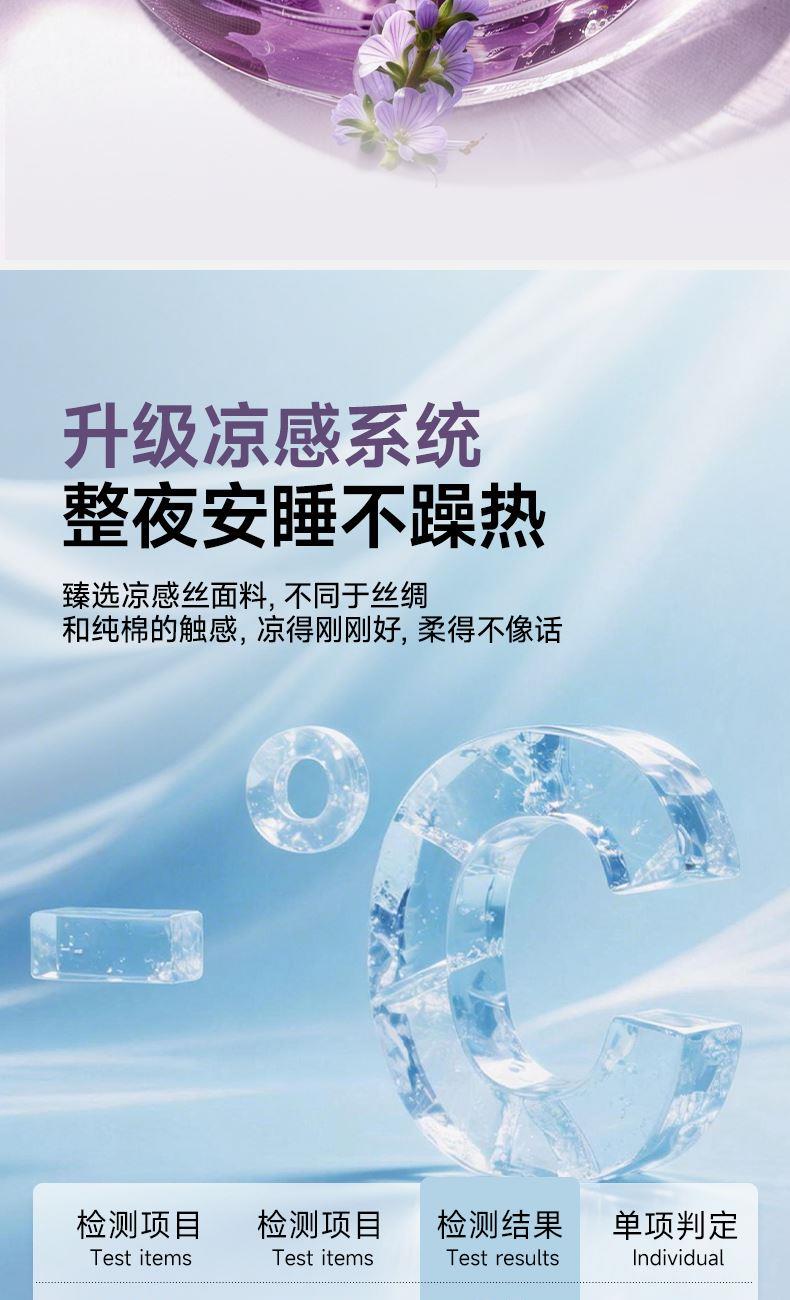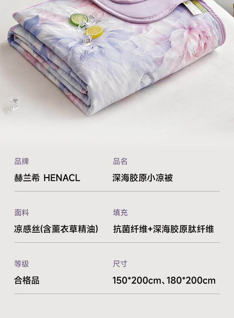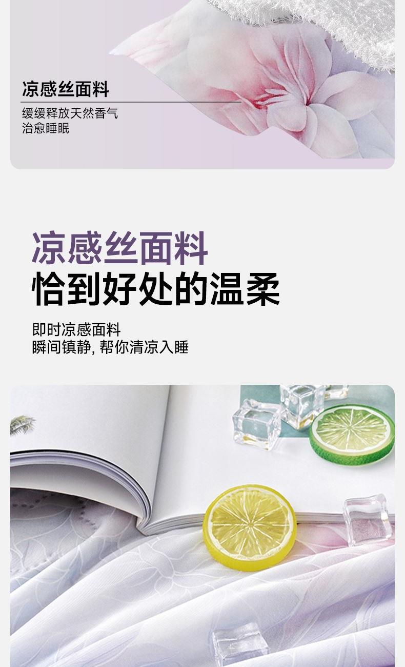 货 号 :HXB-2525 面 料 :凉感丝(添加薰衣草香氛) 填 充 :深海胶原肽纤维+抗 菌纤维 规 格 :150*200cm 重 量 :1250g 包装尺寸 :50x38x15cm 装 箱明细 :10床/箱或50条/包 1.精选面料 : 采用柔软凉感的凉感丝制作成的面料,亲肤舒适透气性强; 即刻凉感,夏日低5℃; 2.优质填充 : 艾草优质超细纤维,柔软亲肤,导湿透气; 3.精致工艺 : 活性印染工艺 高 级感十足压花工艺,简约时尚的风格 适合各种卧室风格;
