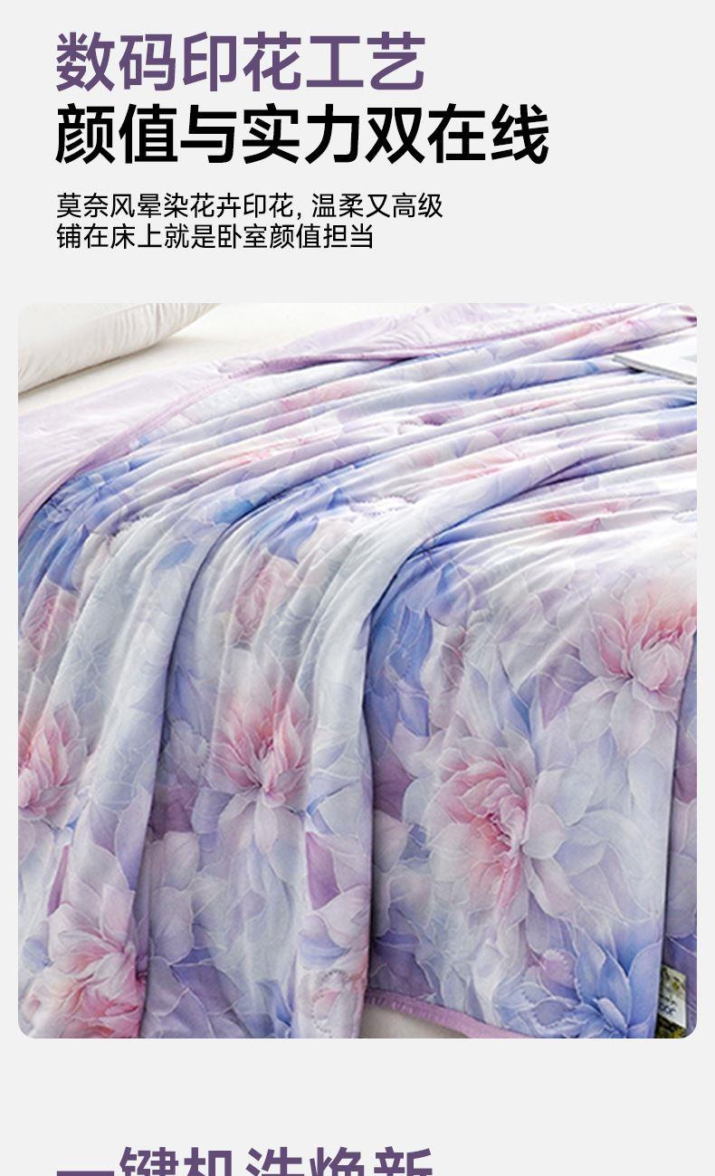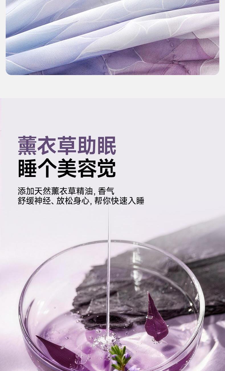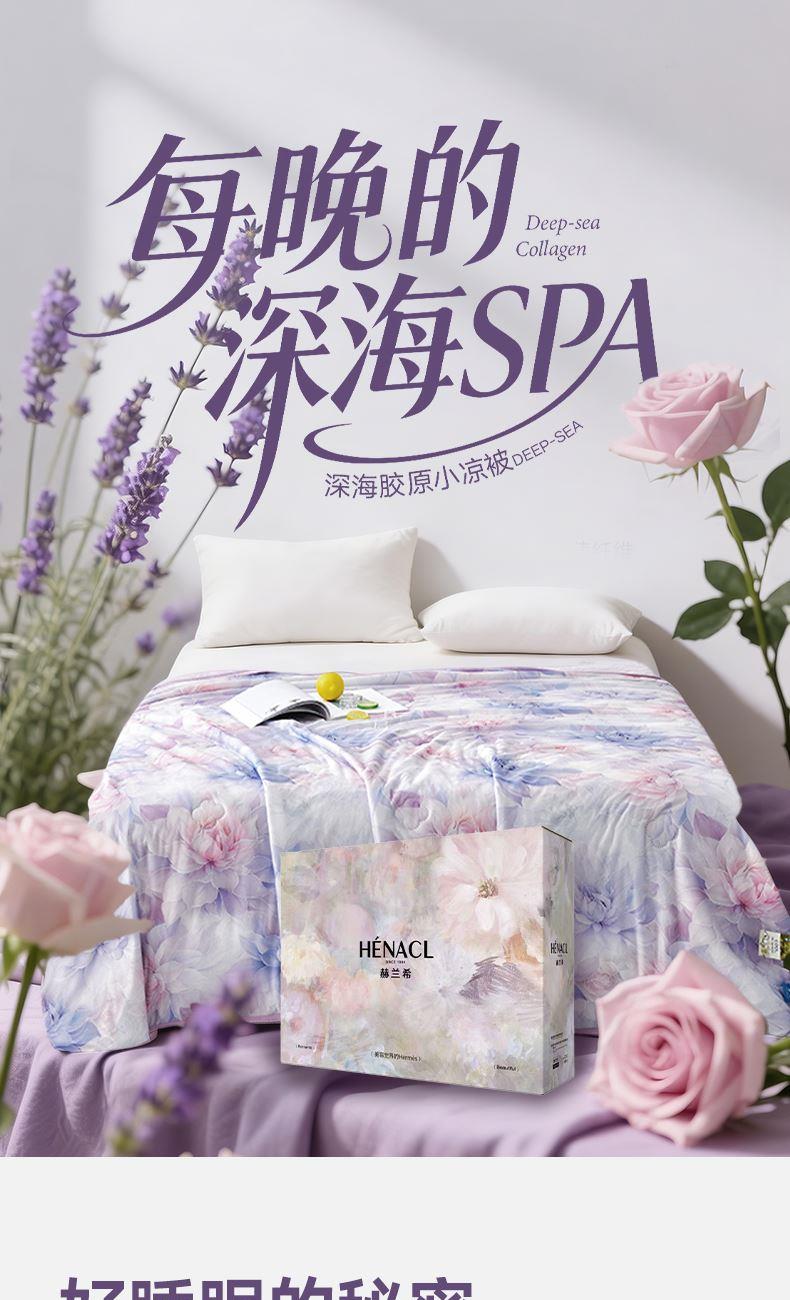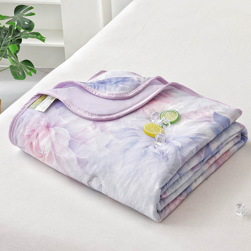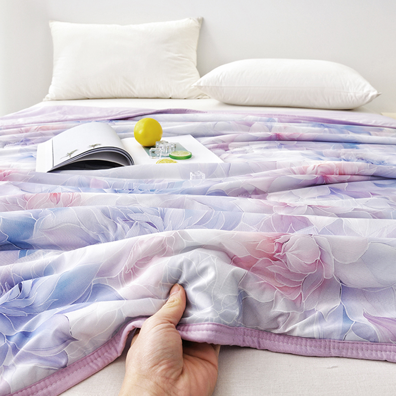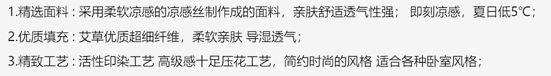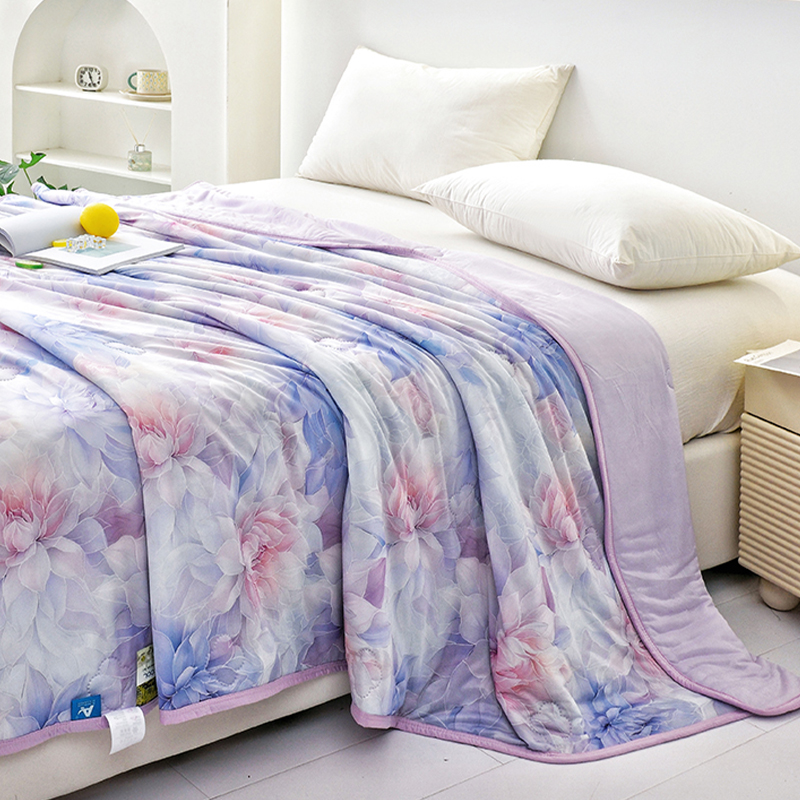 货 号 :HXB-2525 面 料 :凉感丝(添加薰衣草香氛) 填 充 :深海胶原肽纤维+抗 菌纤维 规 格 :150*200cm 重 量 :1250g 包装尺寸 :50x38x15cm 装 箱明细 :10床/箱或50条/包 1.精选面料 : 采用柔软凉感的凉感丝制作成的面料,亲肤舒适透气性强; 即刻凉感,夏日低5℃; 2.优质填充 : 艾草优质超细纤维,柔软亲肤,导湿透气; 3.精致工艺 : 活性印染工艺 高 级感十足压花工艺,简约时尚的风格 适合各种卧室风格;
