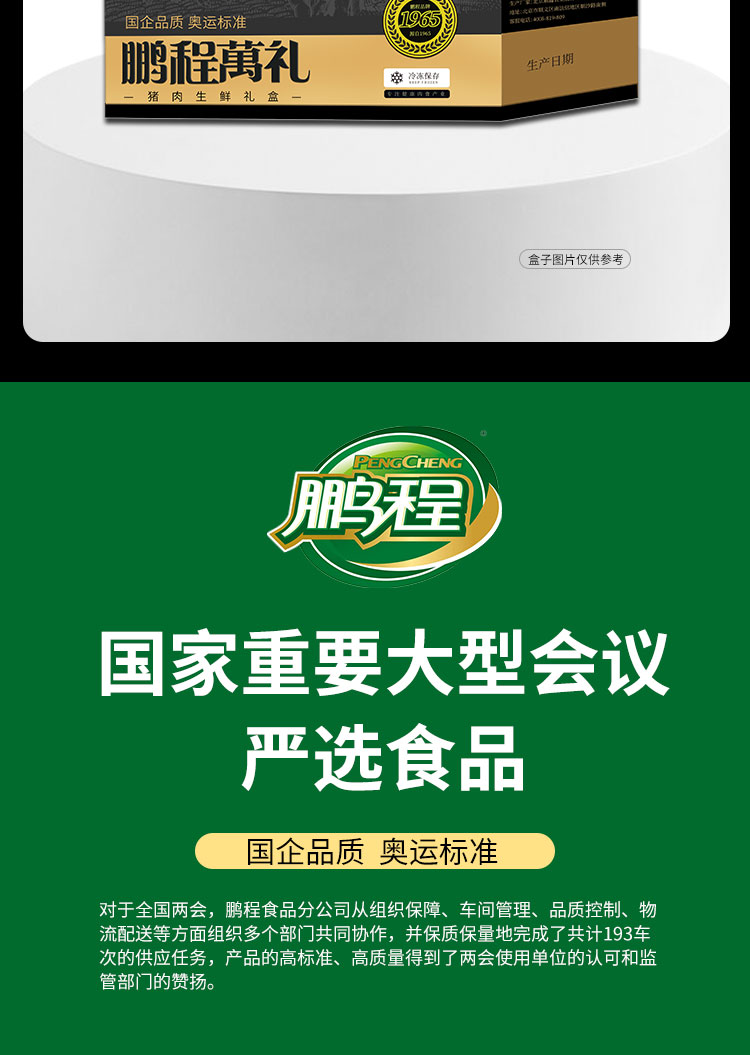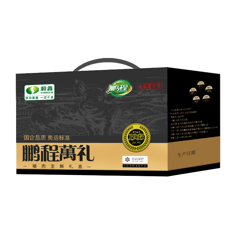 鹏程黑猪肉具有肉质紧实、脂肪含量低、口感细腻等特点,且注重无抗养殖和透明供应链管理 肉色鲜红,脂肪呈乳白色,具有明显大理石花纹,肉质细嫩有弹性 养殖周期12个月以上,采用中草药无抗饲料,全程透明可追溯 供应链覆盖种猪繁育、生猪养殖、屠宰加工至仓储物流,确保品质与安全 塞牧勒黑猪肉家宴礼盒398型 五花肉400g 汤骨400g 猪肉馅400g 猪腿肉400g
