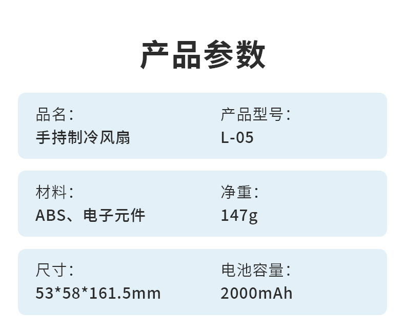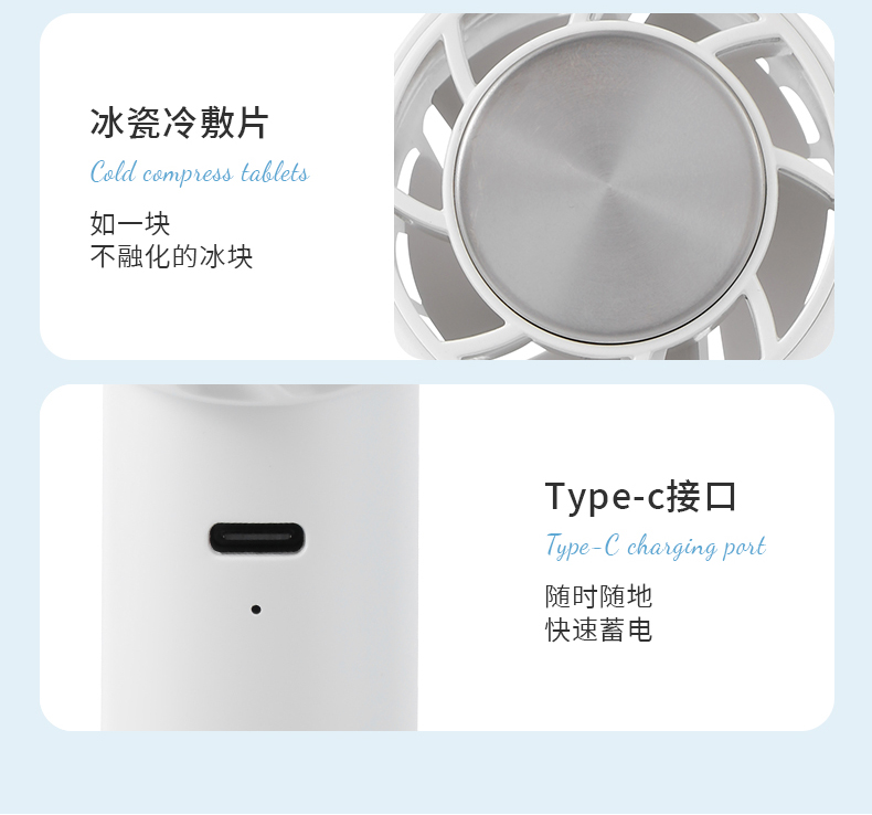 *超导冰瓷制冷,快速除热降噪 *贴心登山扣设计、手持桌面俩用 *2000mAh电池、支持小批量定制LOGO *材质:ABS/PC/五金/电子元件 *产品尺寸:53*58*161.5mm *彩盒尺寸:64*56*167mm *外箱尺寸:35X34.5X35.5CM *单个净重/毛重:147g/190g *整箱净重/毛重:11.4kg/12.2kg