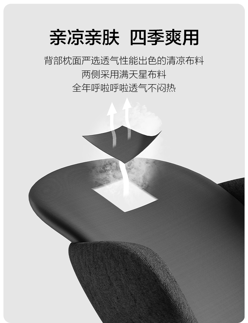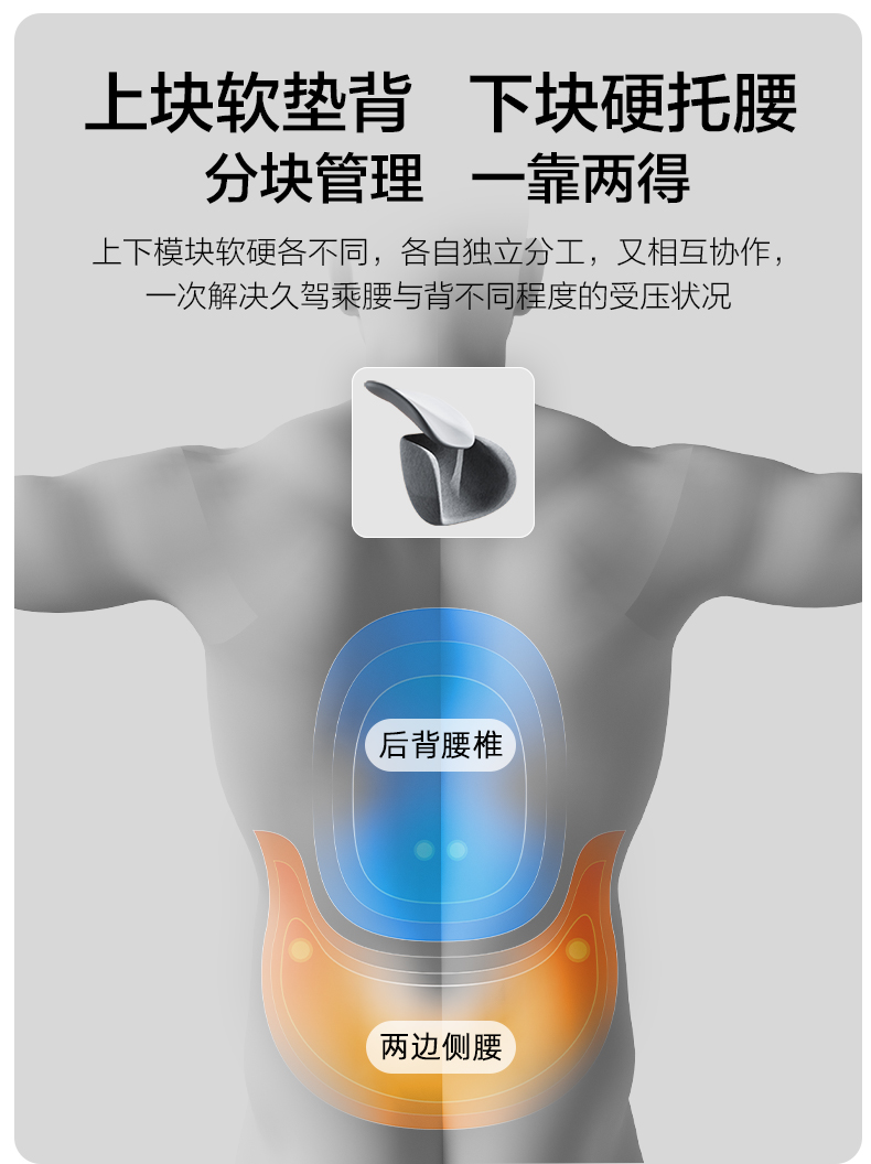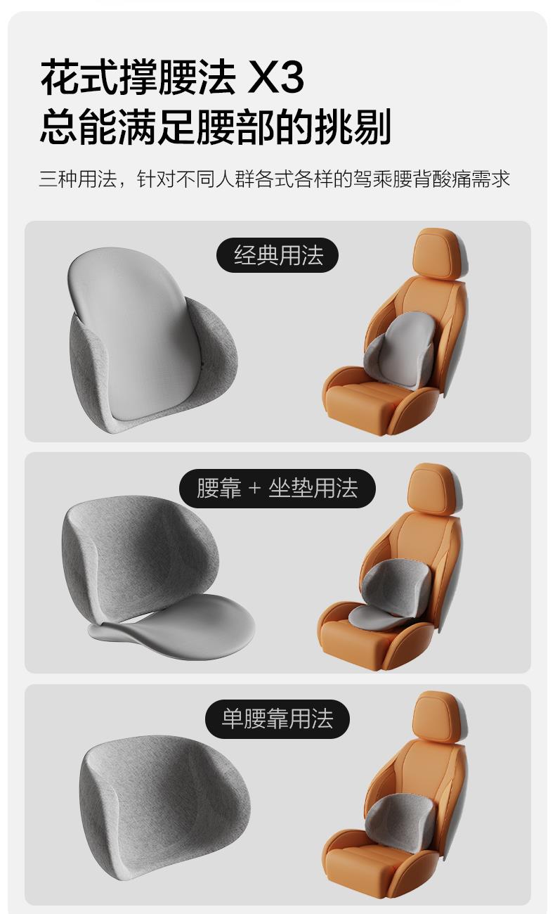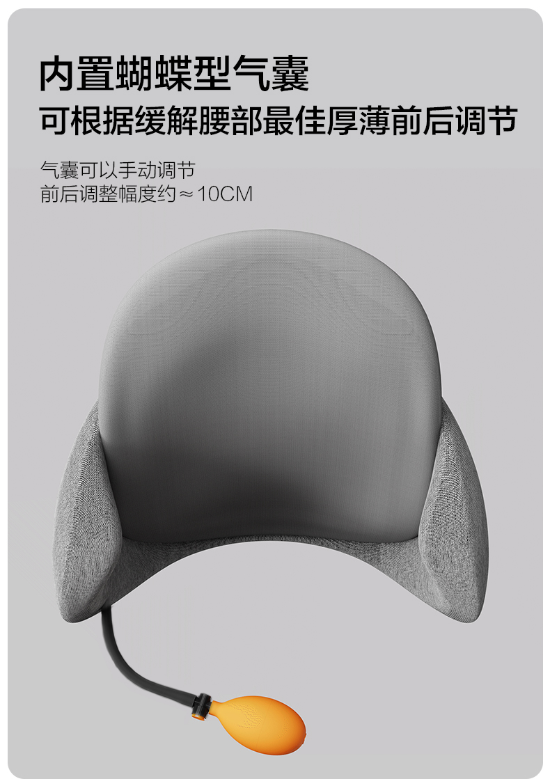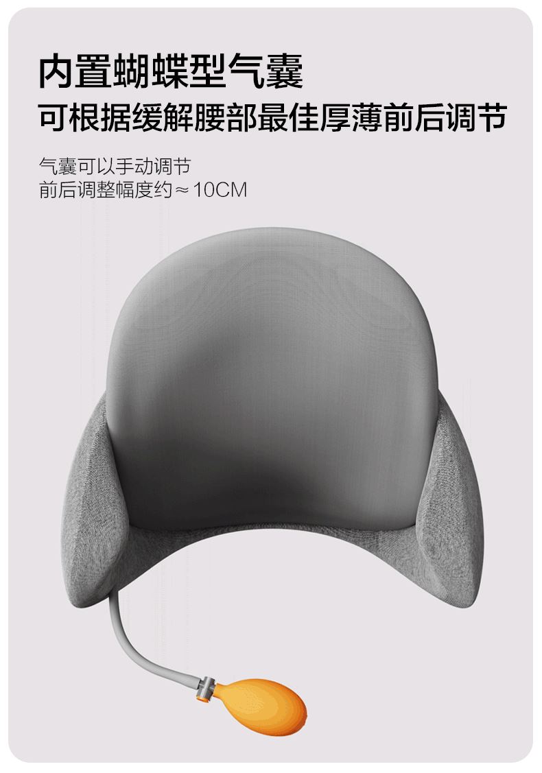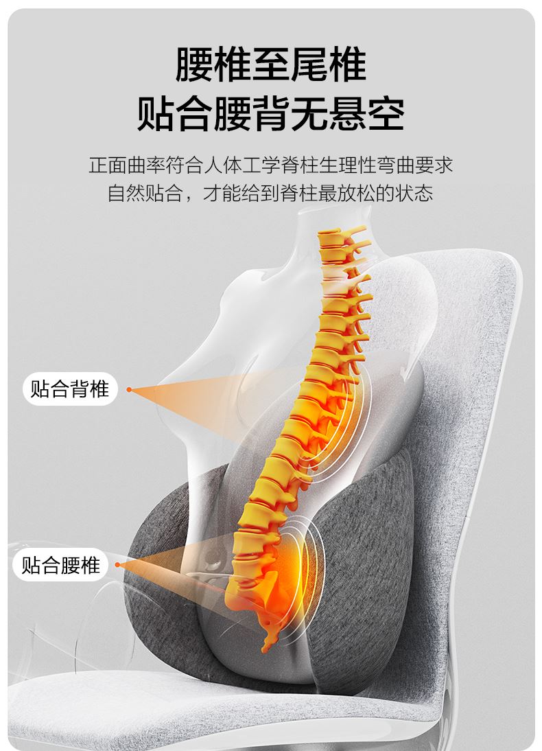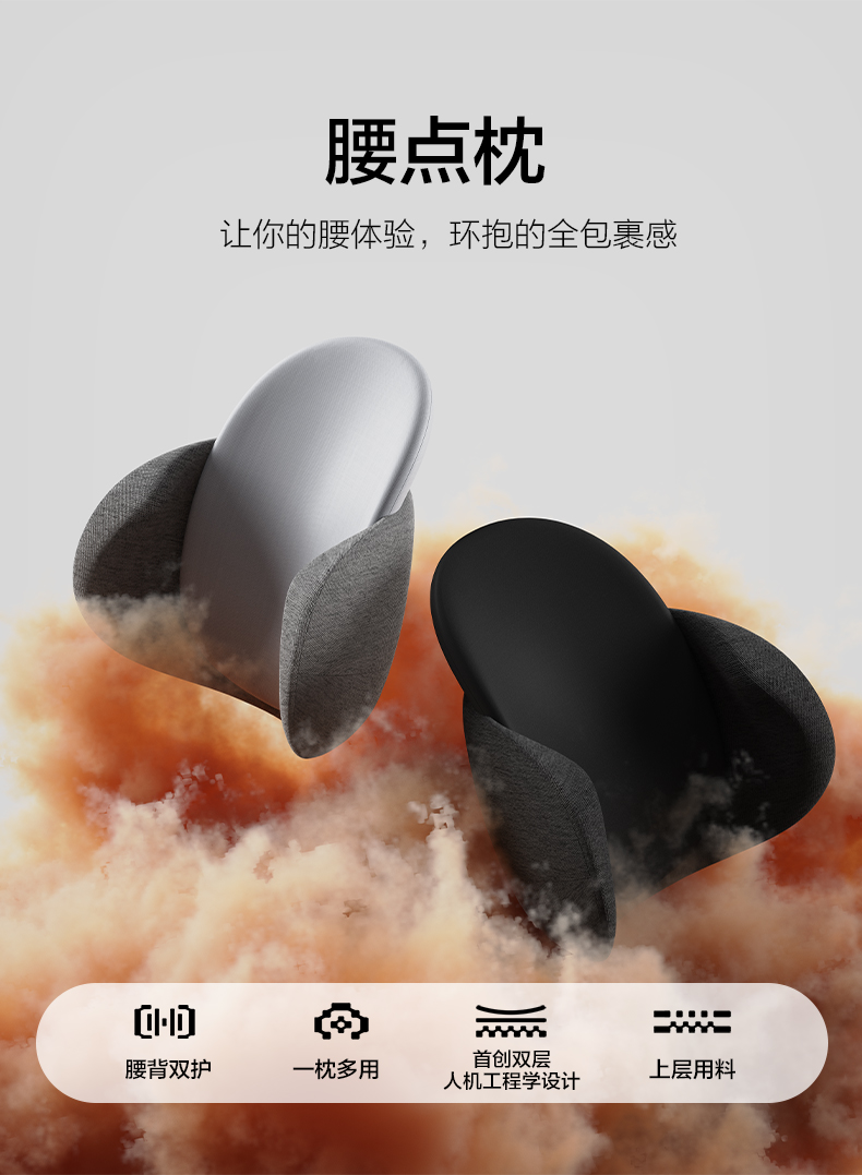 规格:腰枕*1 防尘PP袋*1 单台包装尺寸:385*245*320 单台重量:1750g(含彩盒) 规格:6台 颜色:黑色、灰色 ✓功能特点:首创双层的人机设计 (背部支撑活动模块设计,可上下拉动调节,适配每个人腰椎曲线 ✓舒适面料优等品:300g满天星布料,添加6.5%氨纶,增加枕套弹性和柔软度 ✓柔软Rua内芯:美国Huntsman优质原料,温柔包裹,不易老化,不掉粉尘 ✓多场景使用: 汽车出行/办公午休皆可满足