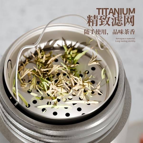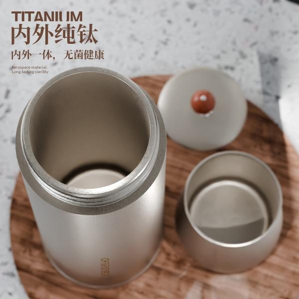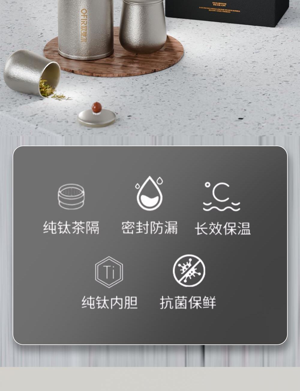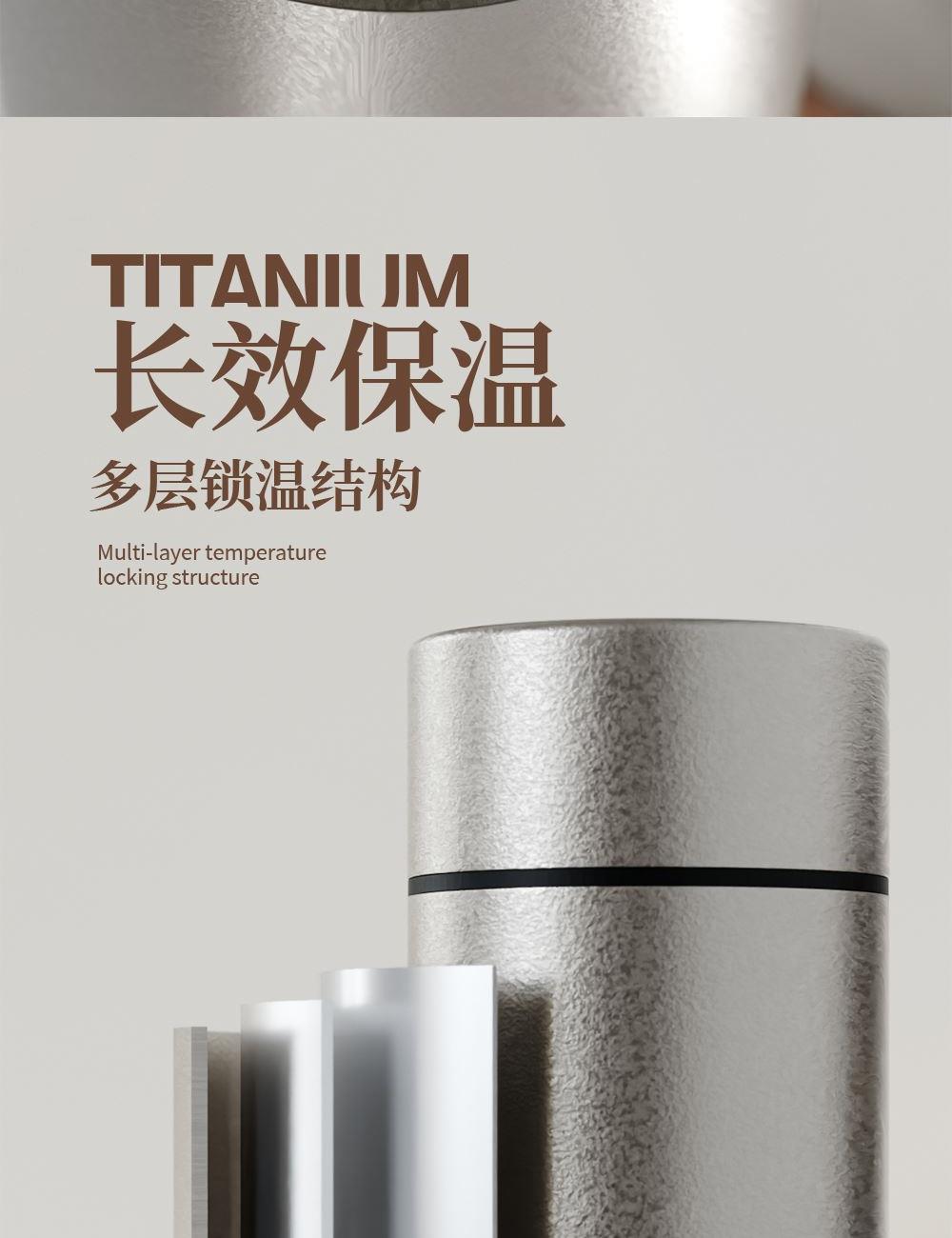 · 杯体材质 : 内外纯钛 · 茶罐材质 : 内外纯钛 · 塑 料 件:PP(食品接触用)密封圈:硅胶(食品接触用) · 配 置 :钛杯*1+钛茶叶罐*1 · 容 量 : 钛杯容量480ML/茶叶罐容量180ML · 颜 色 :钛本色 · 彩盒尺寸 :24*24*10.5CM · 外箱尺寸 :56*51*37CM · 毛重(带礼盒):808g 卖点: · 杯体采用纯钛材质,含钛量达99.8%。 · 保冷保温,健康锁鲜。 · 材质健康安全,不与各类酸碱性饮品产生化学反应,安 全无析出,放心盛放日常饮品。 · 表面不喷漆上色,钛材质本色,长期使用不掉色。