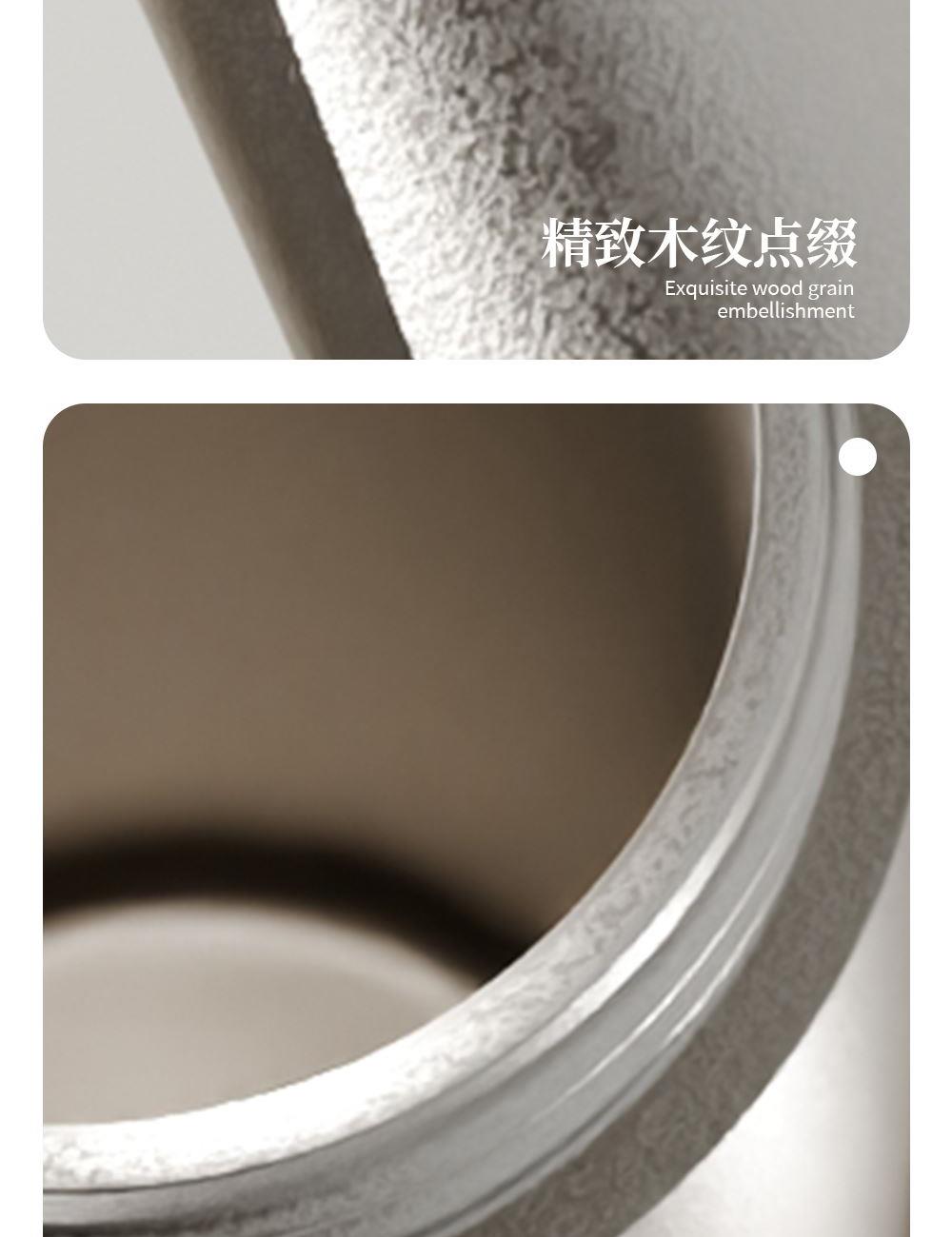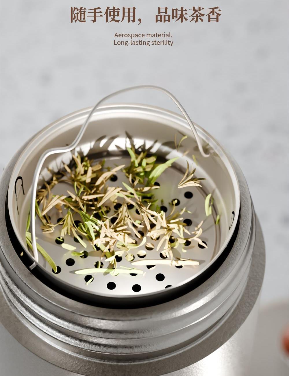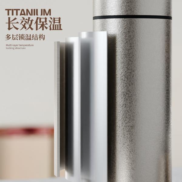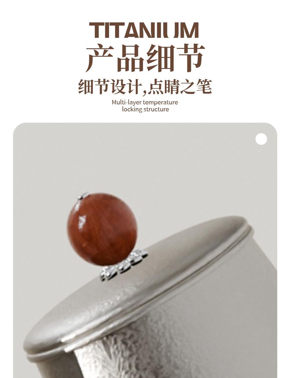 · 杯体材质 : 内外纯钛 · 茶罐材质 : 内外纯钛 · 塑 料 件:PP(食品接触用)密封圈:硅胶(食品接触用) · 配 置 :钛杯*1+钛茶叶罐*1 · 容 量 : 钛杯容量480ML/茶叶罐容量180ML · 颜 色 :钛本色 · 彩盒尺寸 :24*24*10.5CM · 外箱尺寸 :56*51*37CM · 毛重(带礼盒):808g 卖点: · 杯体采用纯钛材质,含钛量达99.8%。 · 保冷保温,健康锁鲜。 · 材质健康安全,不与各类酸碱性饮品产生化学反应,安 全无析出,放心盛放日常饮品。 · 表面不喷漆上色,钛材质本色,长期使用不掉色。