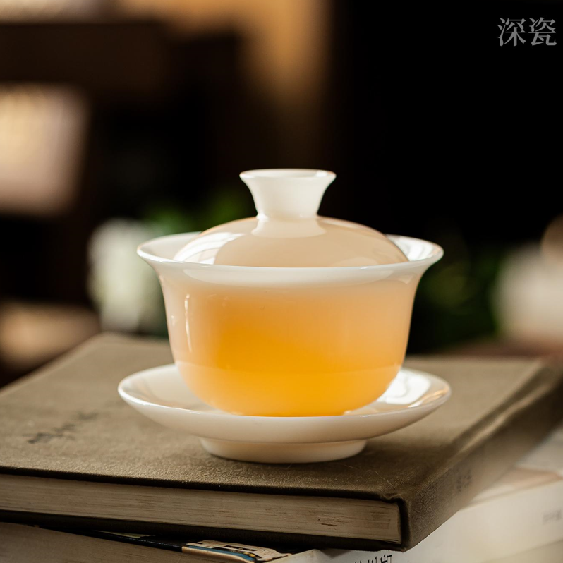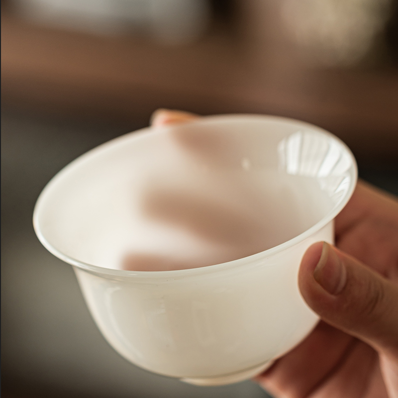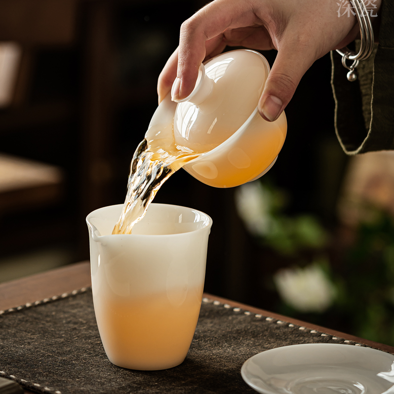 盖碗1:8.9cm*9.3cm容量160ml 茶海1:8.8cm*8.3cm容量190ml 茶杯6:5.5cm*4.7cm容量55ml 竹节主人杯:6cm*5.5cm容量95ml 茶漏1:8cm*5.2cm 皮盒1:39cm*25cm*13cm 原矿稀有瓷土,高温烧制。瓷面强度高,好用更健康。 淡淡琉璃光泽,凝脂似玉,犹如暖玉生辉,美轮美奂。 通体透亮光滑匀净,透光见影;莹润通透,更显茶汤。 器物造型厚实丰满,经典耐看,让品茶时光充满享受。 细节打磨,专注精品。精致皮盒包装,送礼佳选。
