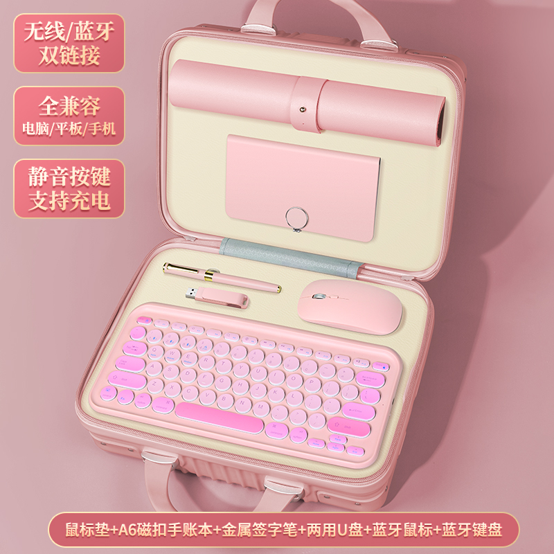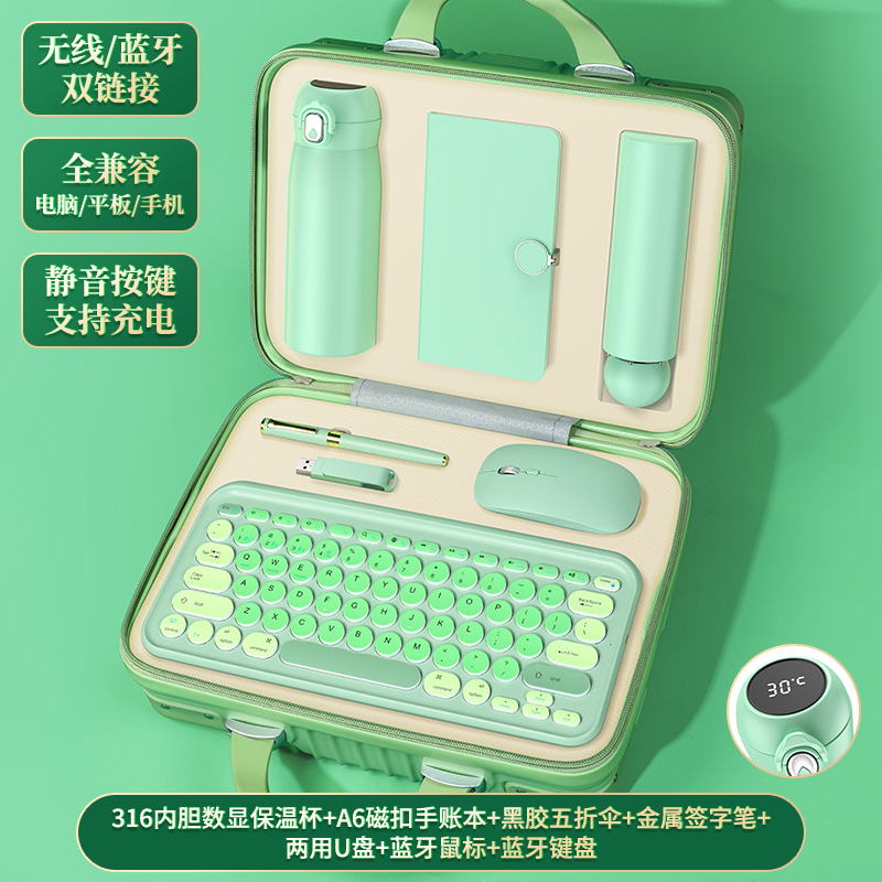 【产品配置】旅行箱7件套弹跳杯+本+五折伞 +笔+U+鼠标+S5键盘 【产品型号】LXX-03 【产品颜色】樱花粉,薄荷绿,宝石蓝 【定制工艺】印刷、雕刻 【包装尺寸】32*23.5*16cm