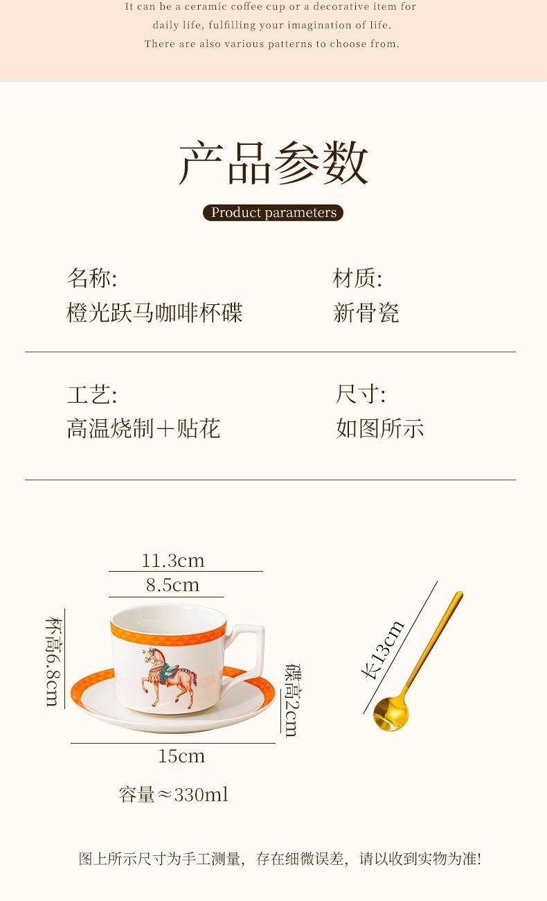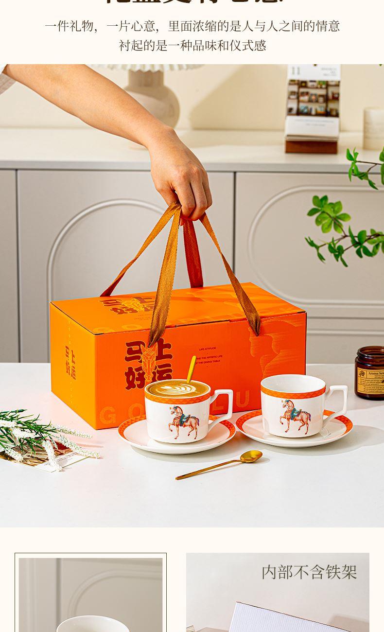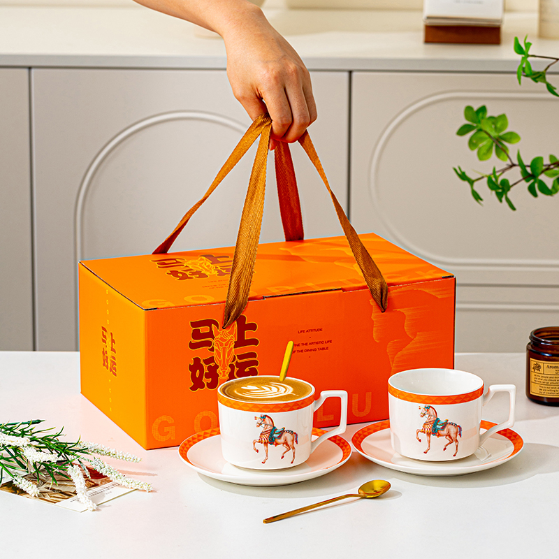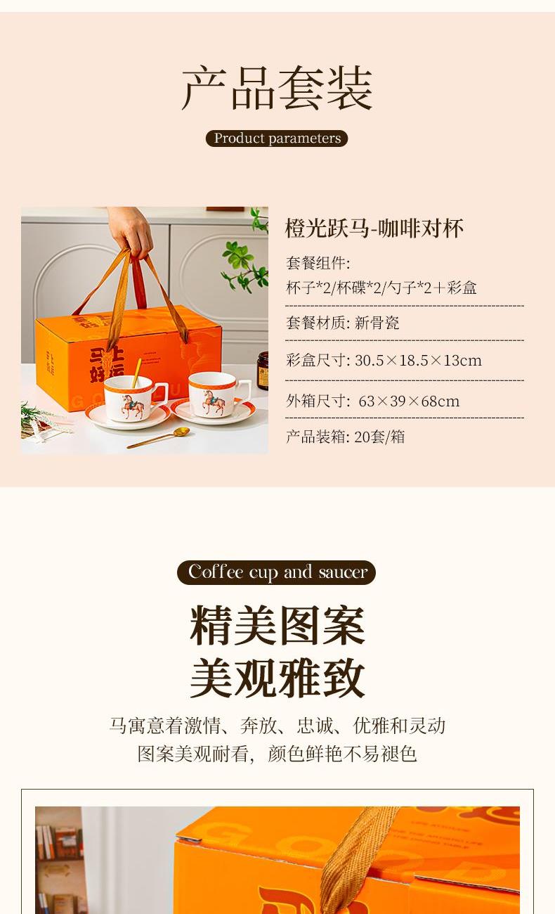 橙光跃马-咖啡对杯-2杯2勺2碟 - 产品组成:整套=2杯2碟2勺+彩盒 产品材质:新骨瓷 产品规格:咖啡杯=口径8.5cm,高度6.8cm,容量330ml;碟=直径15cm,高2cm;金勺=长度13cm; 彩盒尺寸:30.5*18.5*13cm 产品毛重:1.3kg 整箱毛重:28kg 外箱尺寸:63*39*68cm - 商务馈赠显格局,新居乔迁添瑞气,自用时则以器明志——当咖啡香气与浮雕马蹄声重叠,案头的每一刻庸常,皆化作跃向成功的鞍镫。
