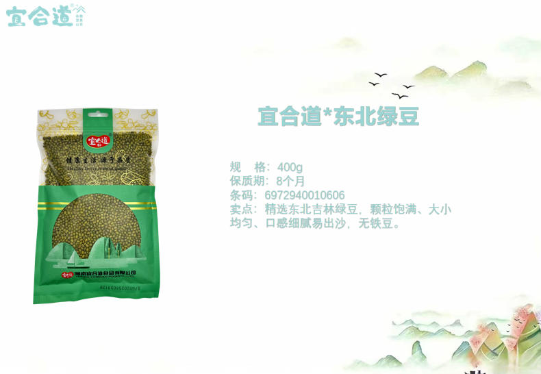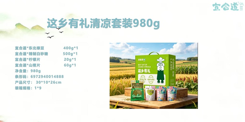 宜合道*东北绿豆 400g*1 宜合道*精制白砂糖 500g*1 宜合道*柠檬片 20g*1 宜合道*山楂片 60g*1 净含量:980g 条形码:6972940014888 产品尺寸: 30*10*26cm