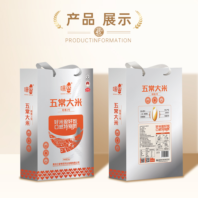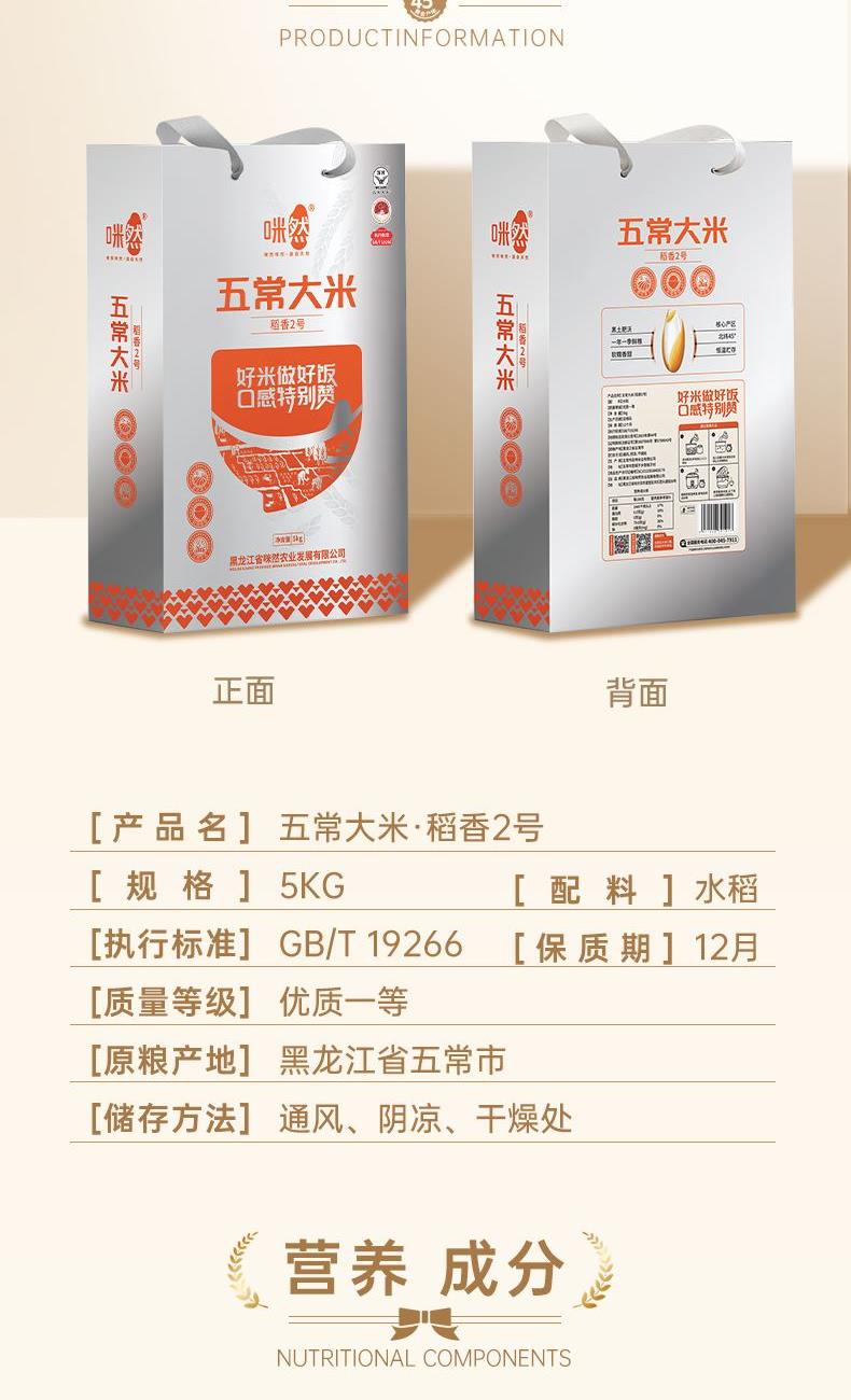 产 品 : 五常大米-稻香2号礼盒5kg 执行标准 : GB/T 19266 保 质 期 : 12个月 产 地 : 黑龙江五常 箱 规 : 4*5kg
