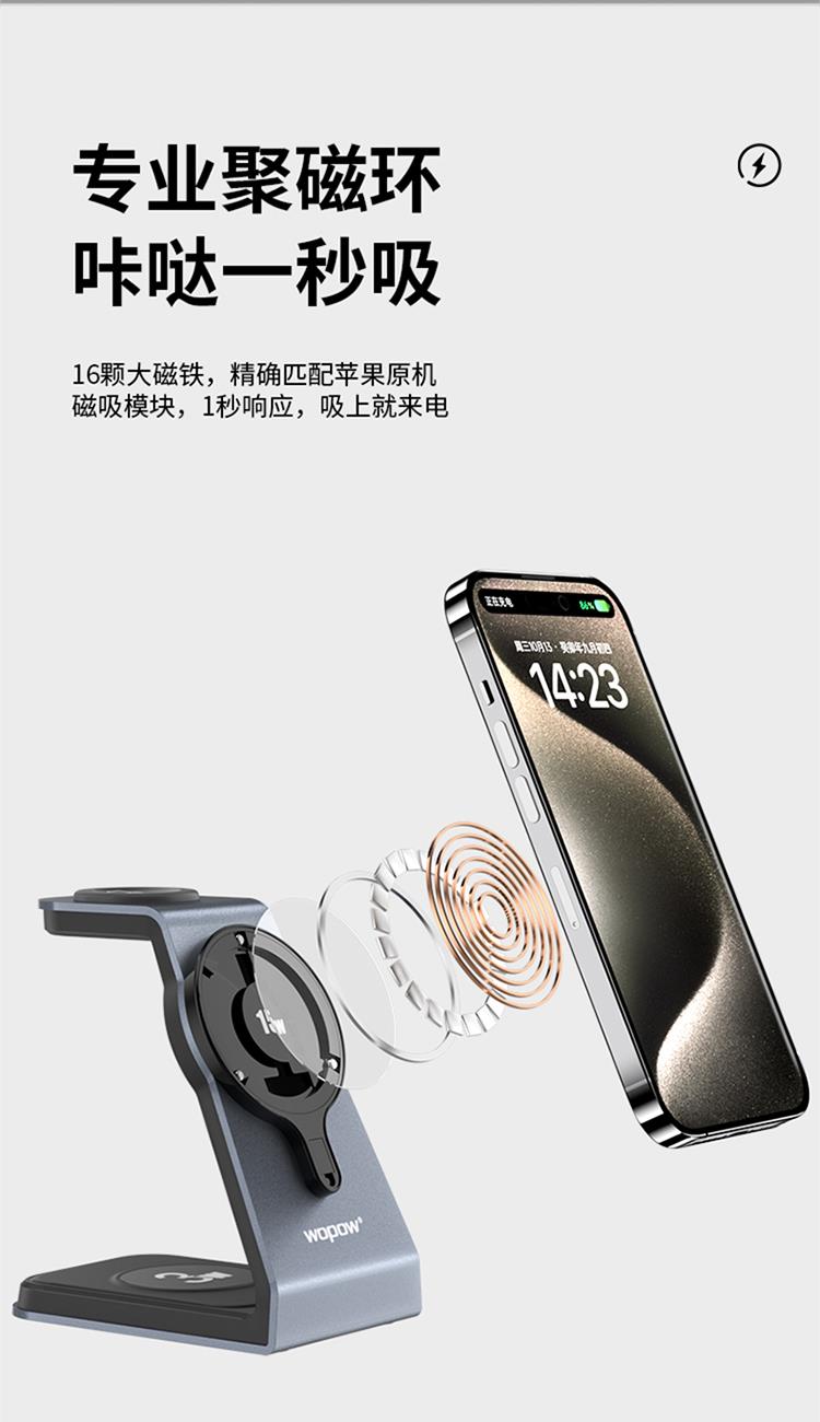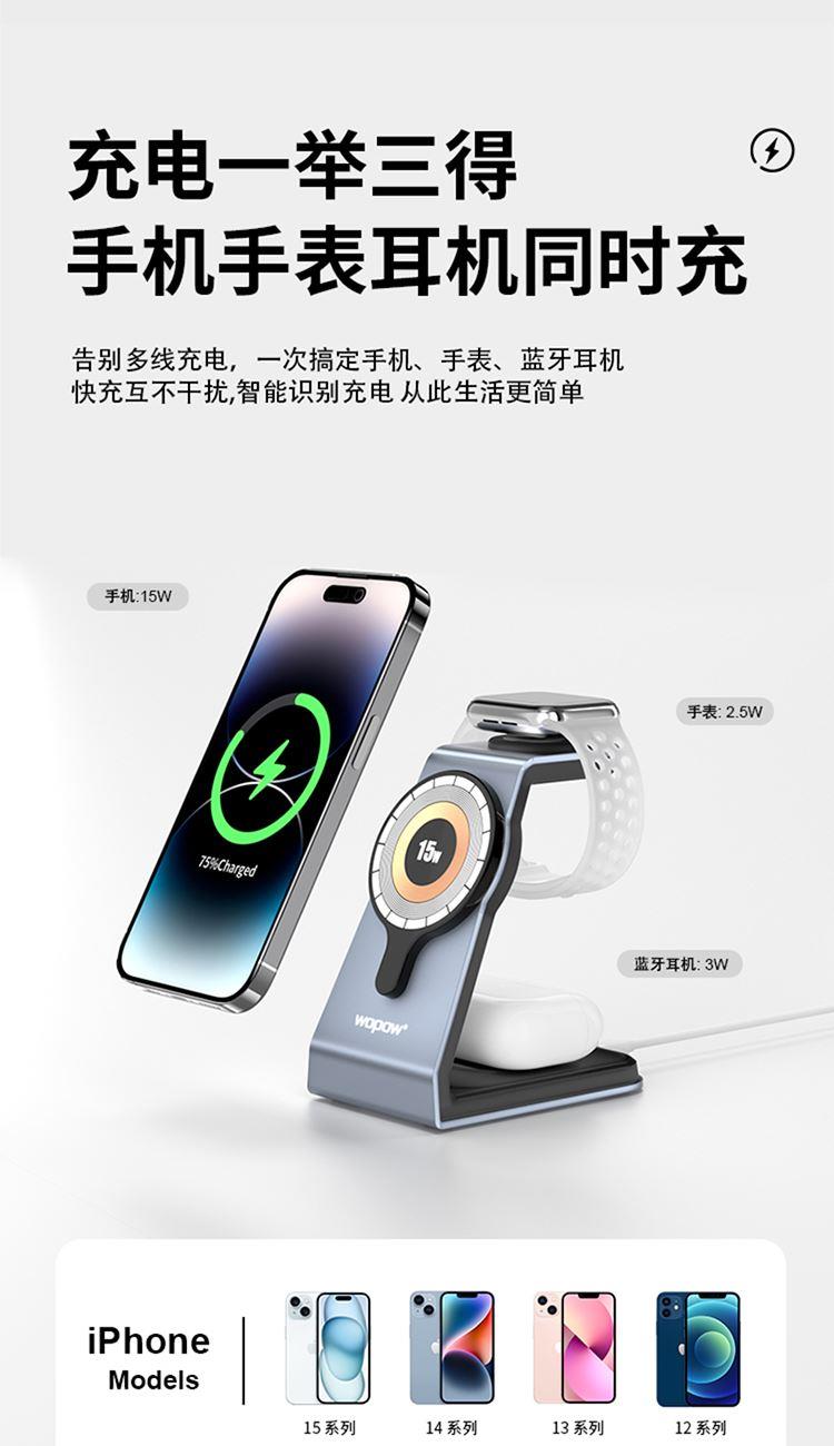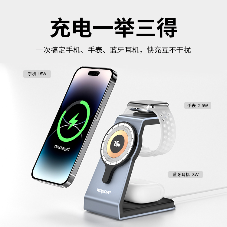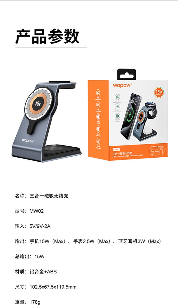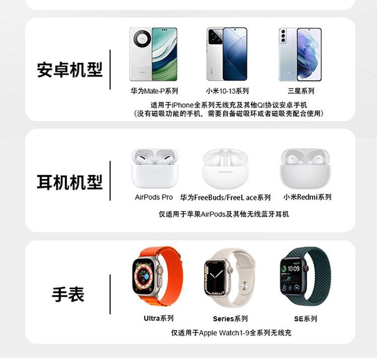 输出:手机15W(Max)、手表2.5W(Max)、蓝牙耳机3W(Max)