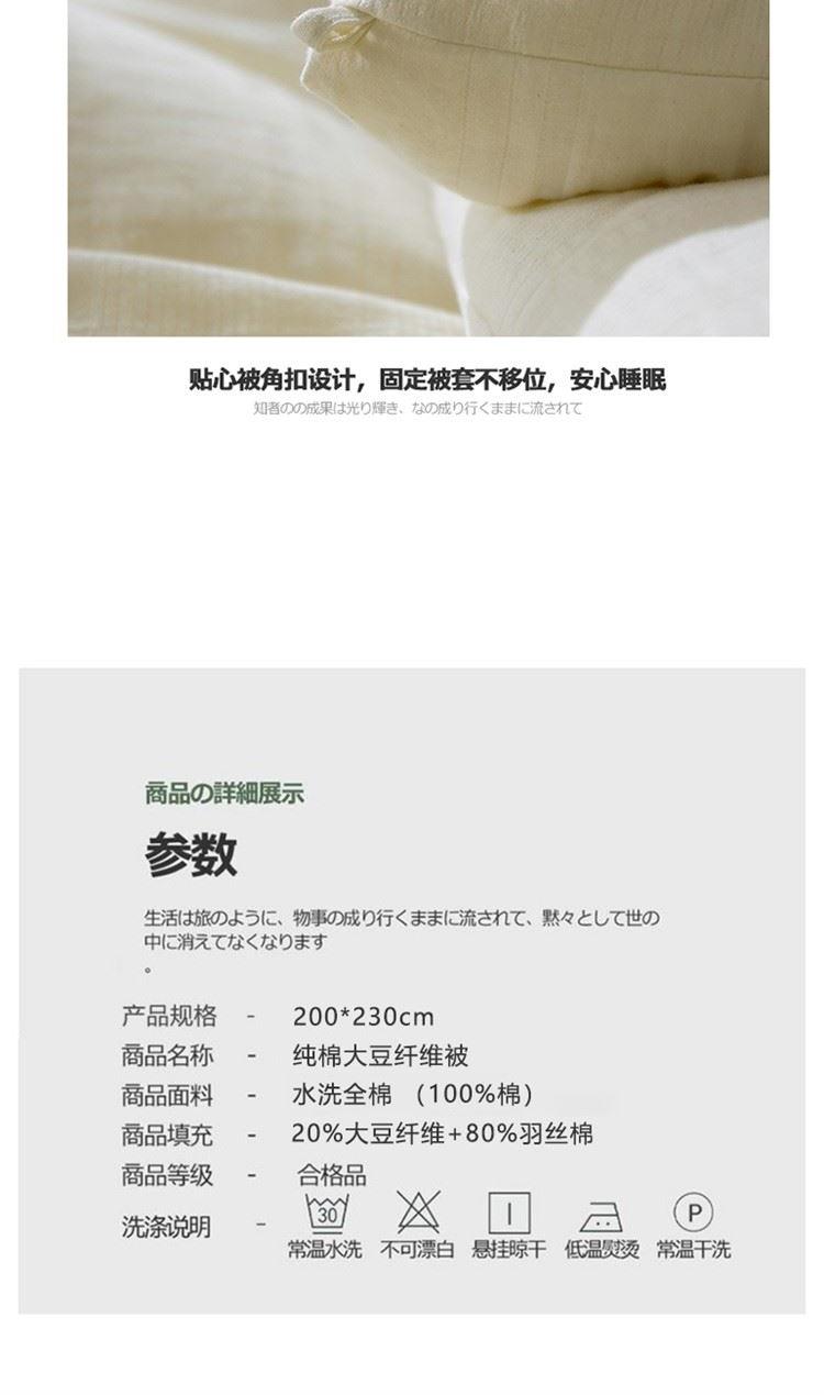 规格:200*230cm 填充:20%大豆纤维+80%羽丝棉 面料:水洗全棉 (99%棉) 重量:2.9kg 1、天然全棉,原生态,无污染 2、科学配比,20%大豆纤维+80%聚酯纤维填充,蓬松透气不易板结,呵护亲肤 3、全棉贡缎提花,无甲醛,无漂染,无芳香胺染料