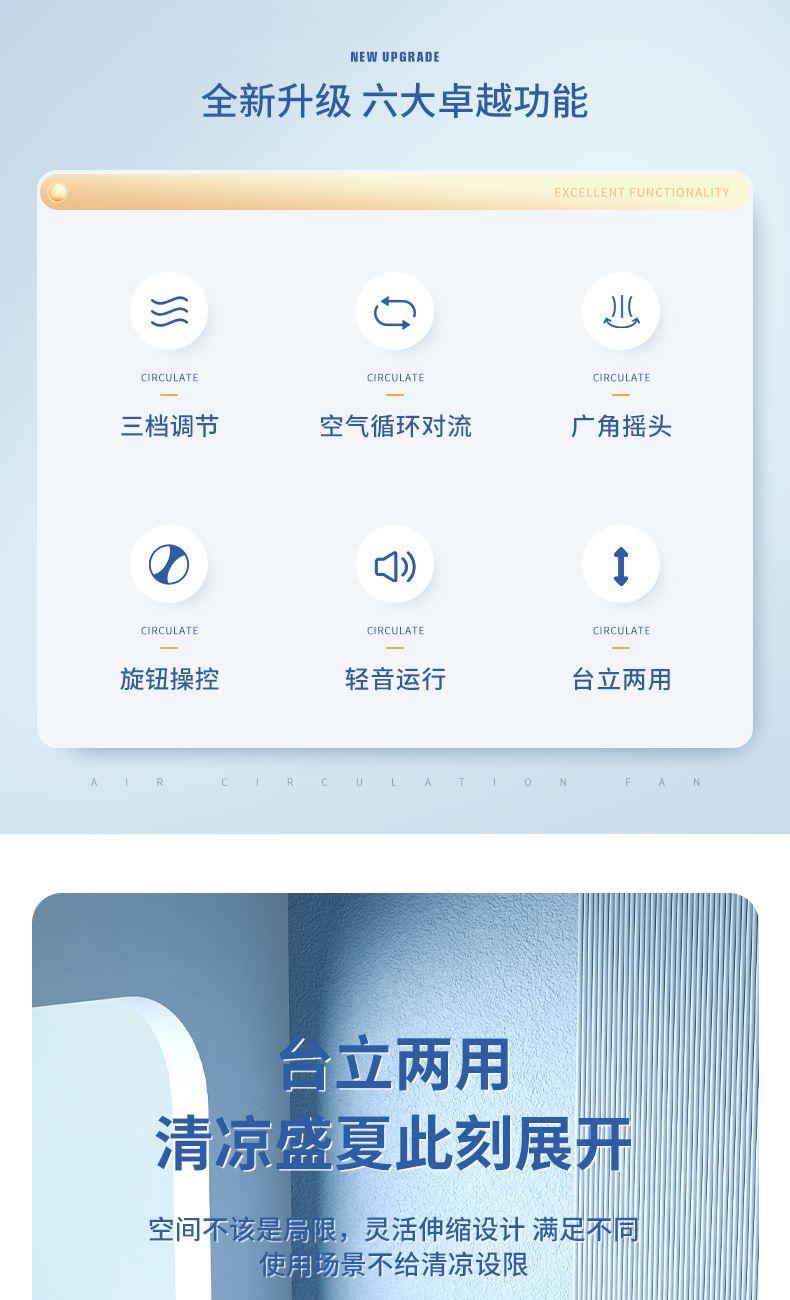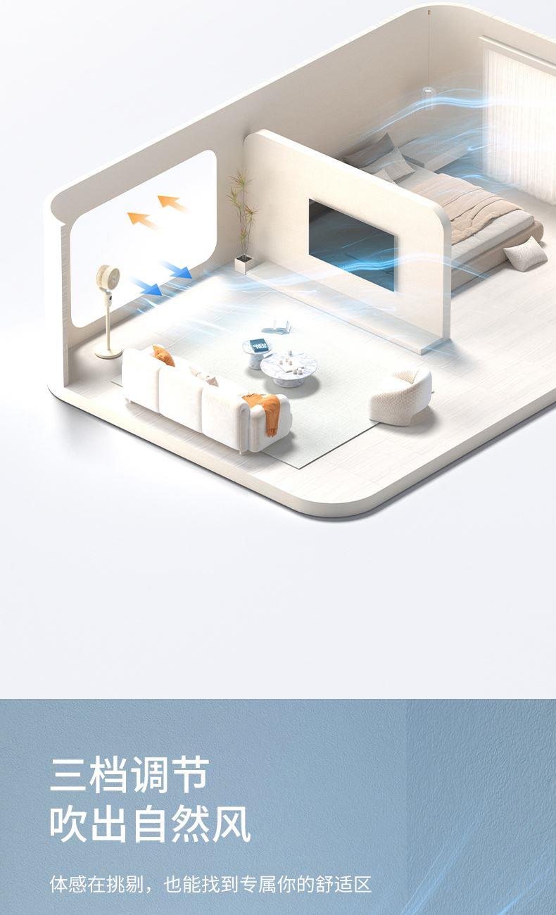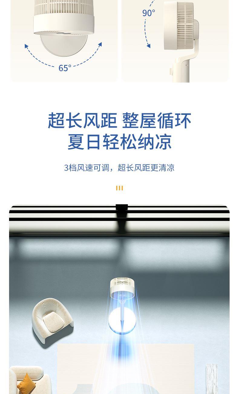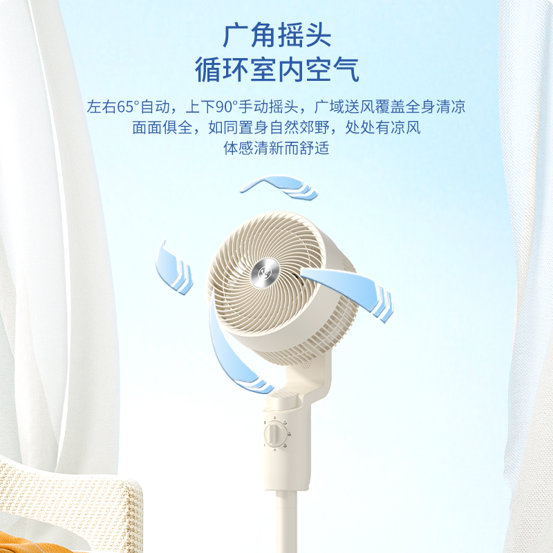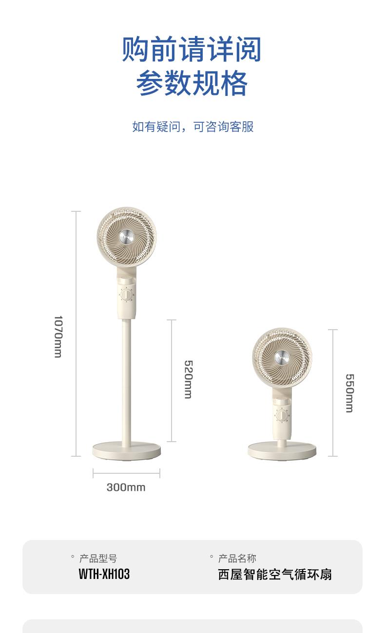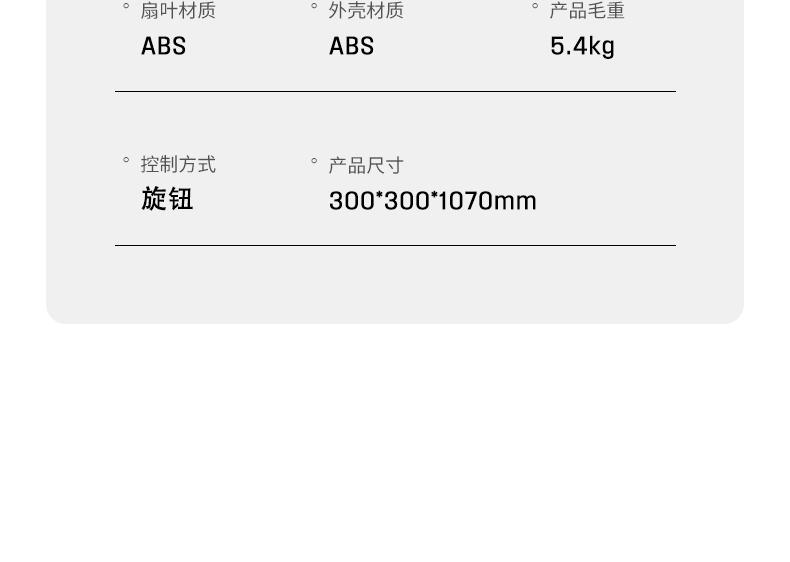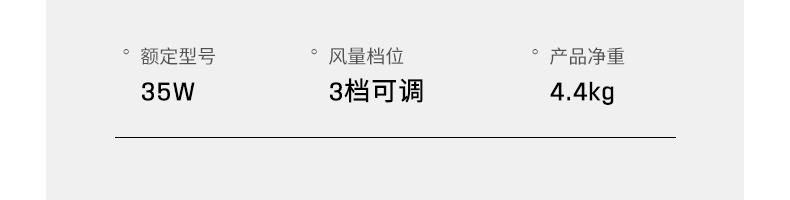 功率:35W 控制方式:机械 风速档位:3档 产品尺寸: 300*300*1070mm 3档风速调节; 台立两用; 左右65度,上下90度摇头; 多重风类模式 旋钮操作模式