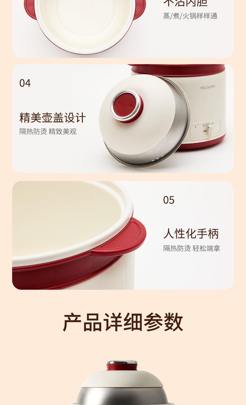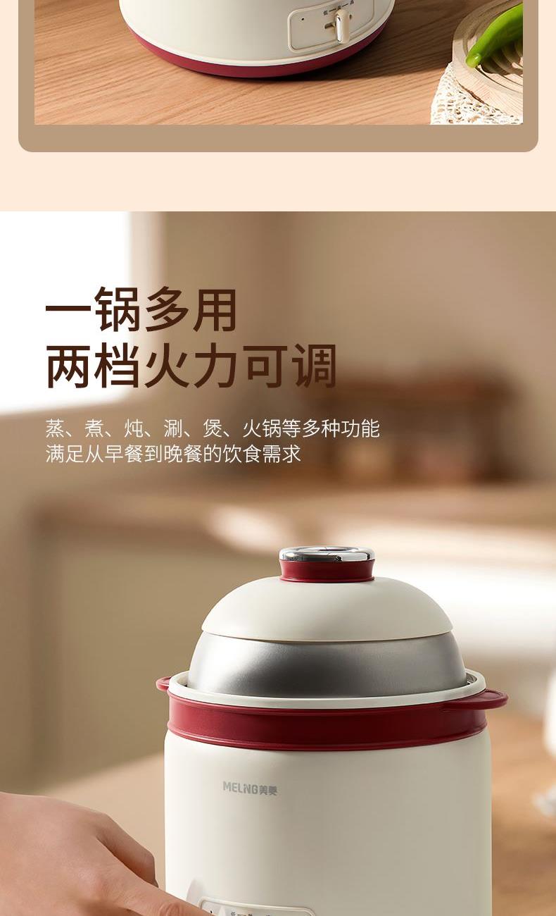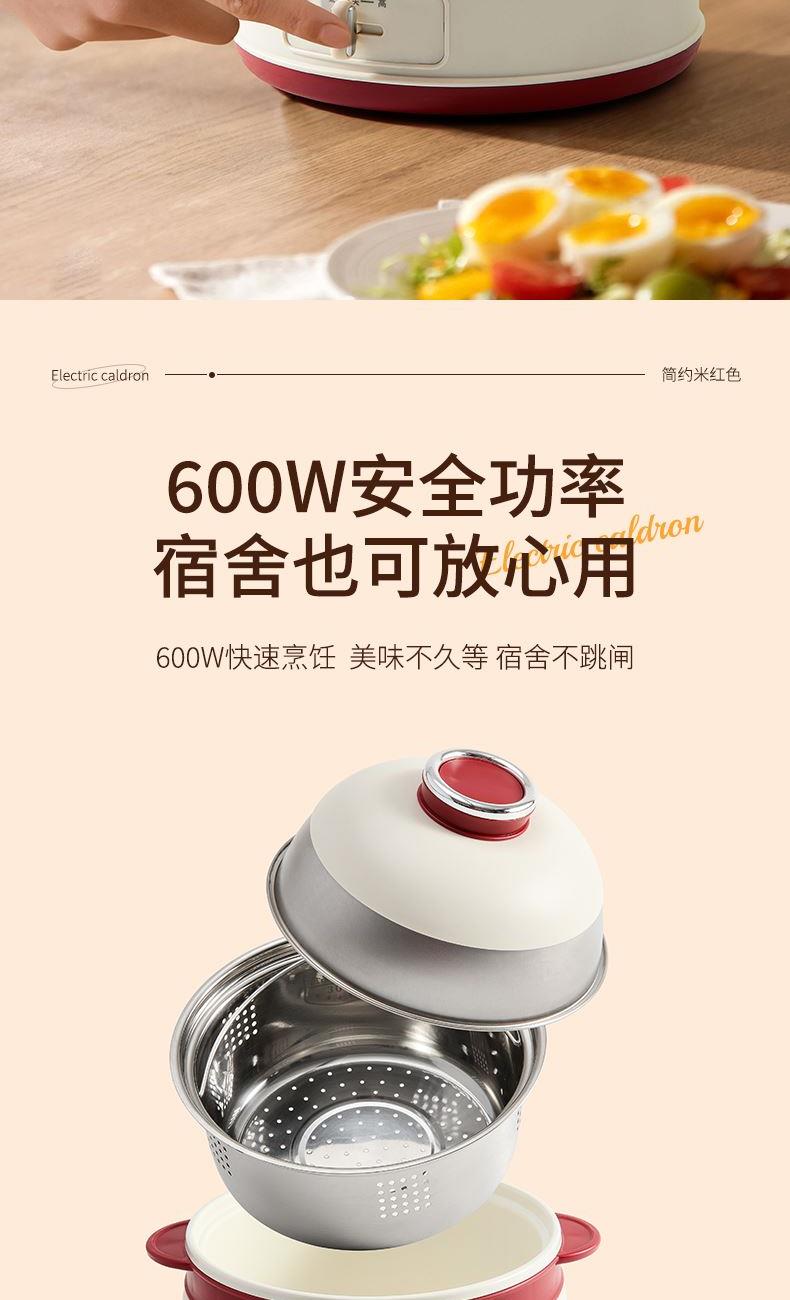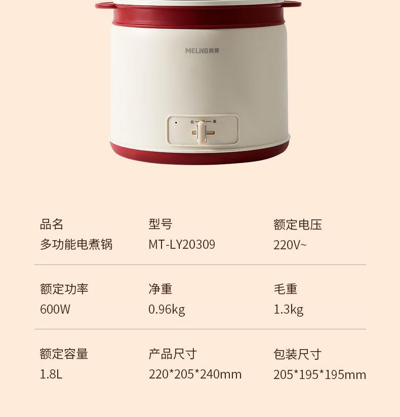 产品参数: 额定电压:220V 额定功率:600W 额度频率:50Hz 额定容量:1.8L 毛净重:1.1/0.9kg 产品尺寸:220mm*205mm*240mm 包装尺寸:200x195x200mm 产品卖点: 1.轻巧便携,简约时尚美学, 2.唤醒生活仪式感,轻享温馨小食光, 3.蒸、煮、炖、涮、煲、火锅等多种功能于一身, 4.满足从早餐到晚餐的饮食需求,