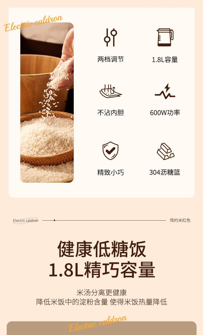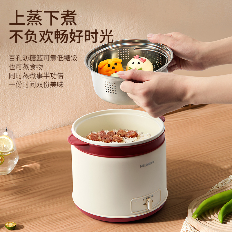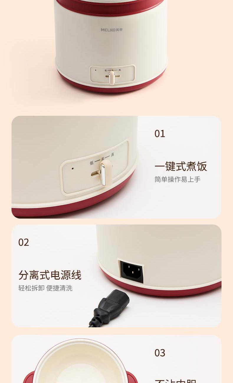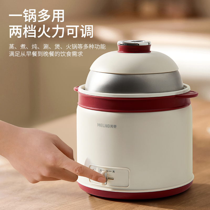 产品参数: 额定电压:220V 额定功率:600W 额度频率:50Hz 额定容量:1.8L 毛净重:1.1/0.9kg 产品尺寸:220mm*205mm*240mm 包装尺寸:200x195x200mm 产品卖点: 1.轻巧便携,简约时尚美学, 2.唤醒生活仪式感,轻享温馨小食光, 3.蒸、煮、炖、涮、煲、火锅等多种功能于一身, 4.满足从早餐到晚餐的饮食需求,