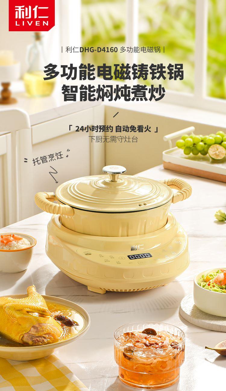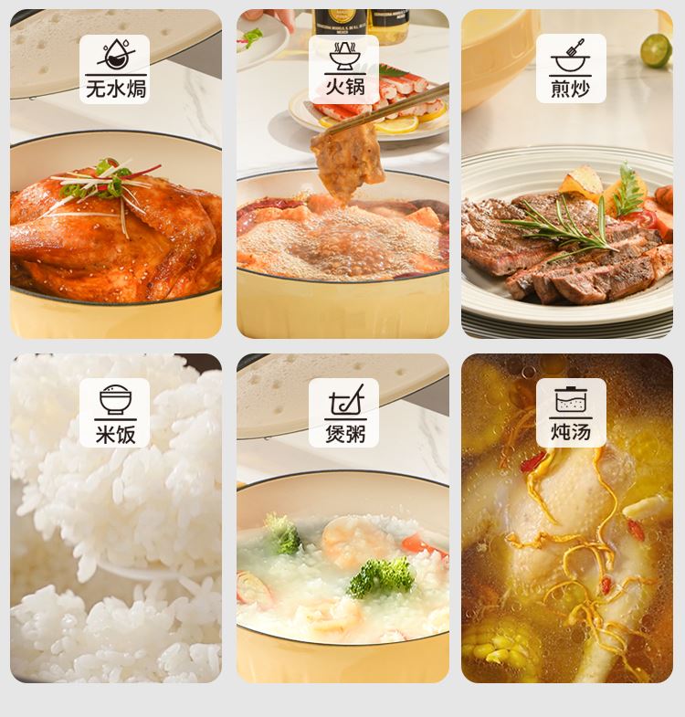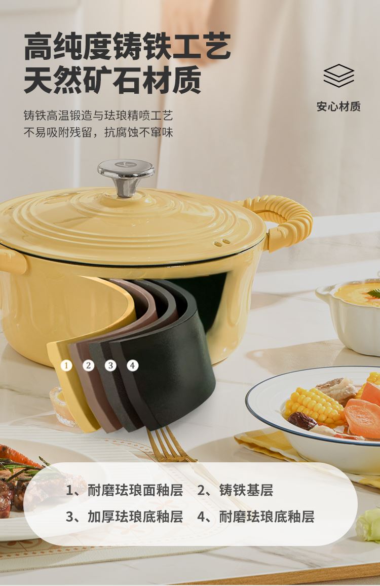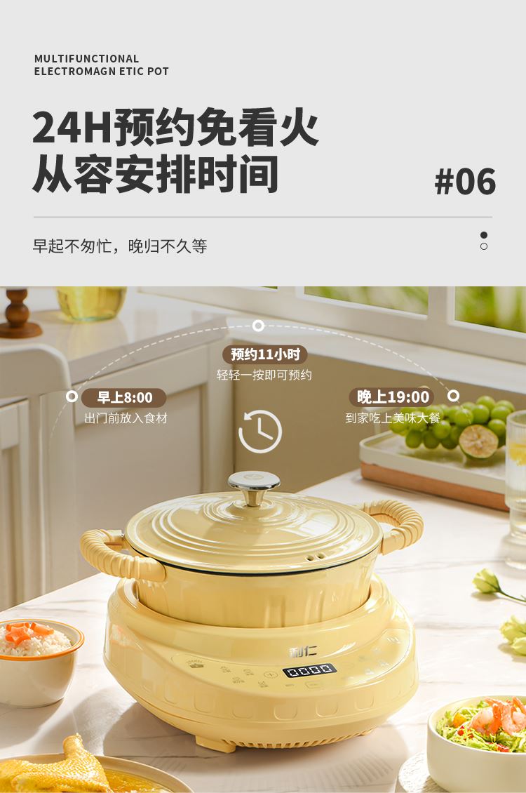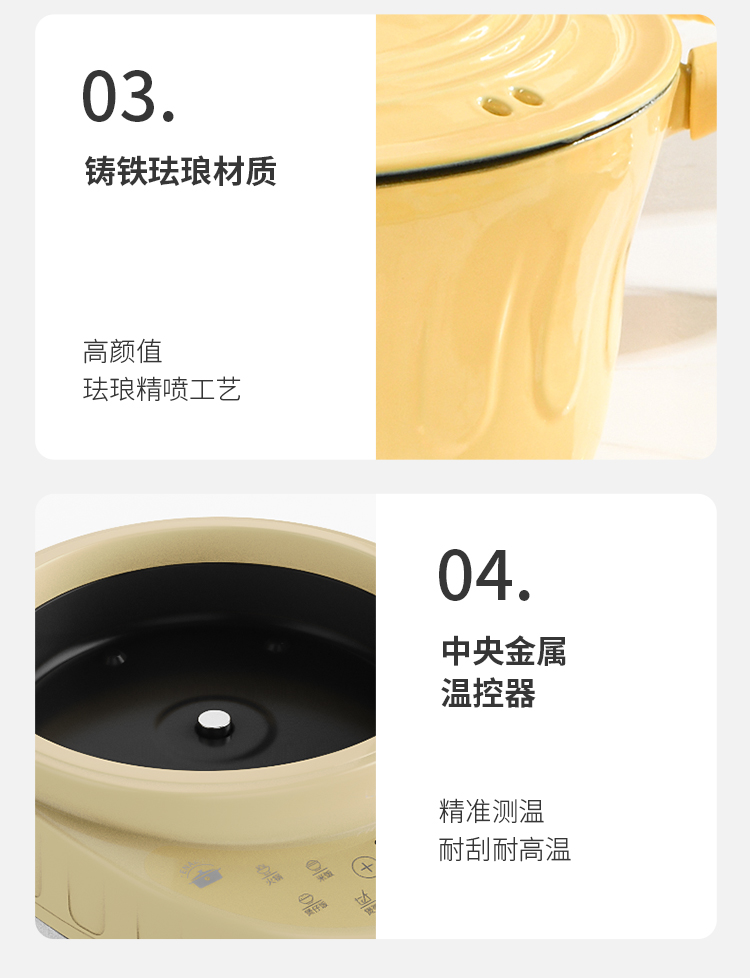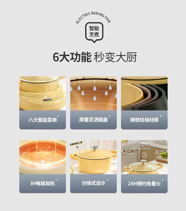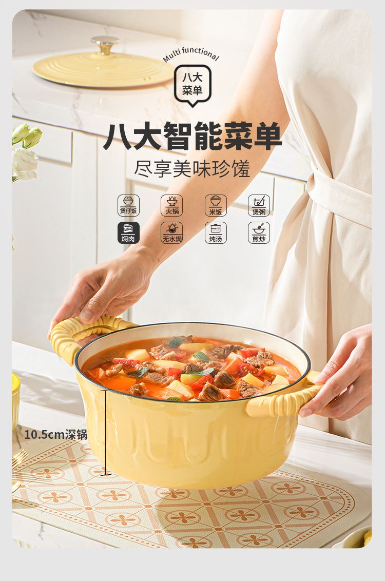 8大智能菜单,花洒锅盖微压烹饪 品质铸铁珐琅,智能触控面板 4L大容量,1600W功率IH加热 分体式一锅端,防烫把手硅胶套 24小时预约免看火从容安排时间