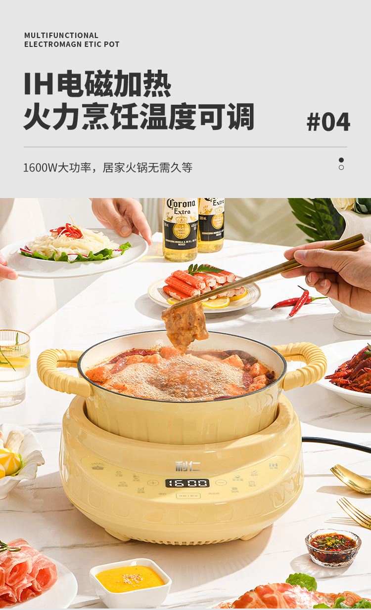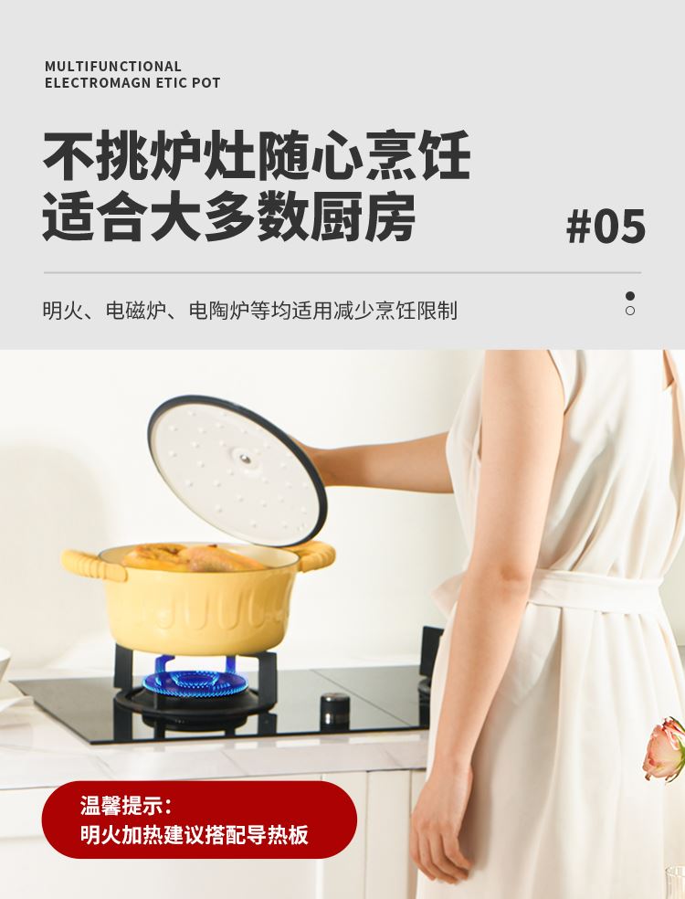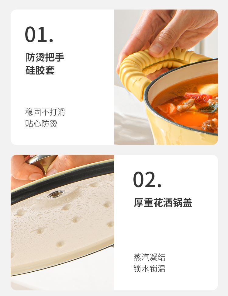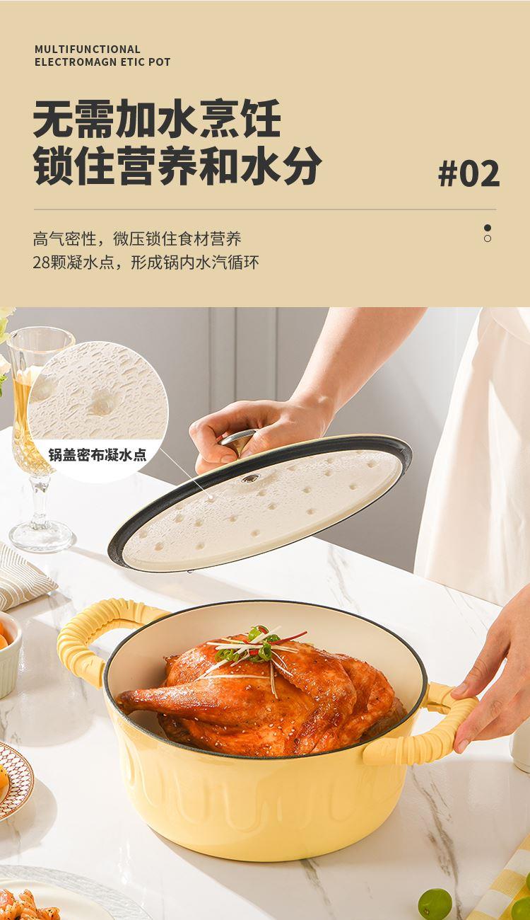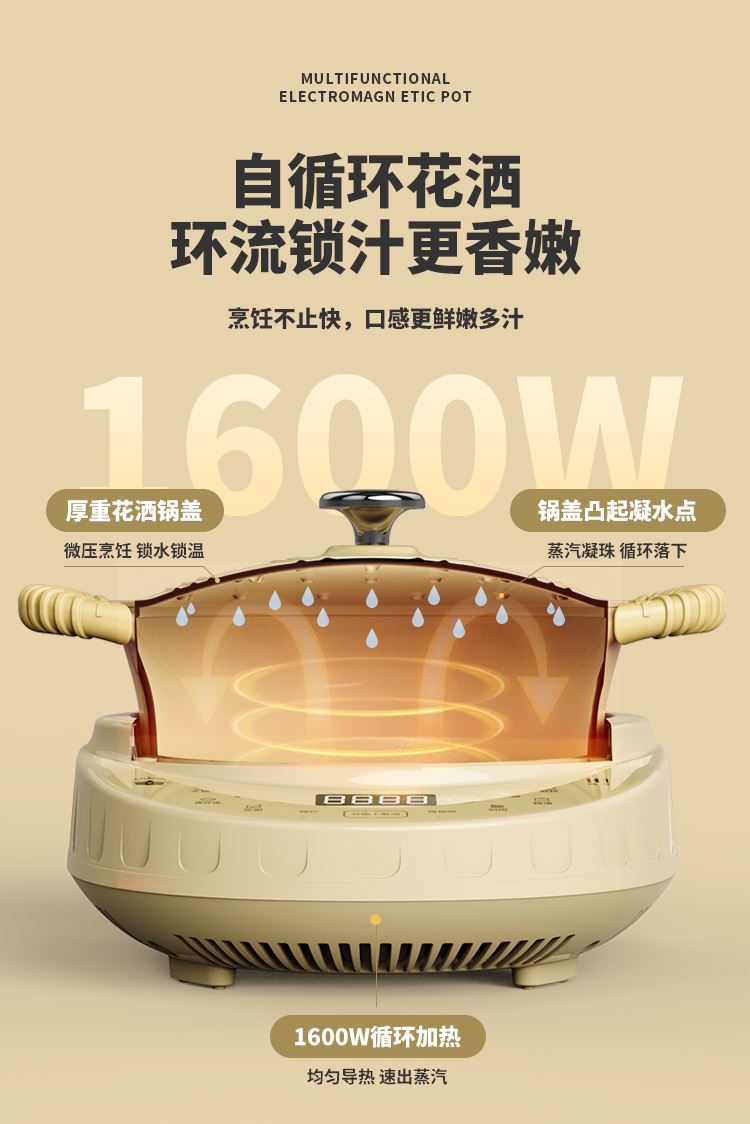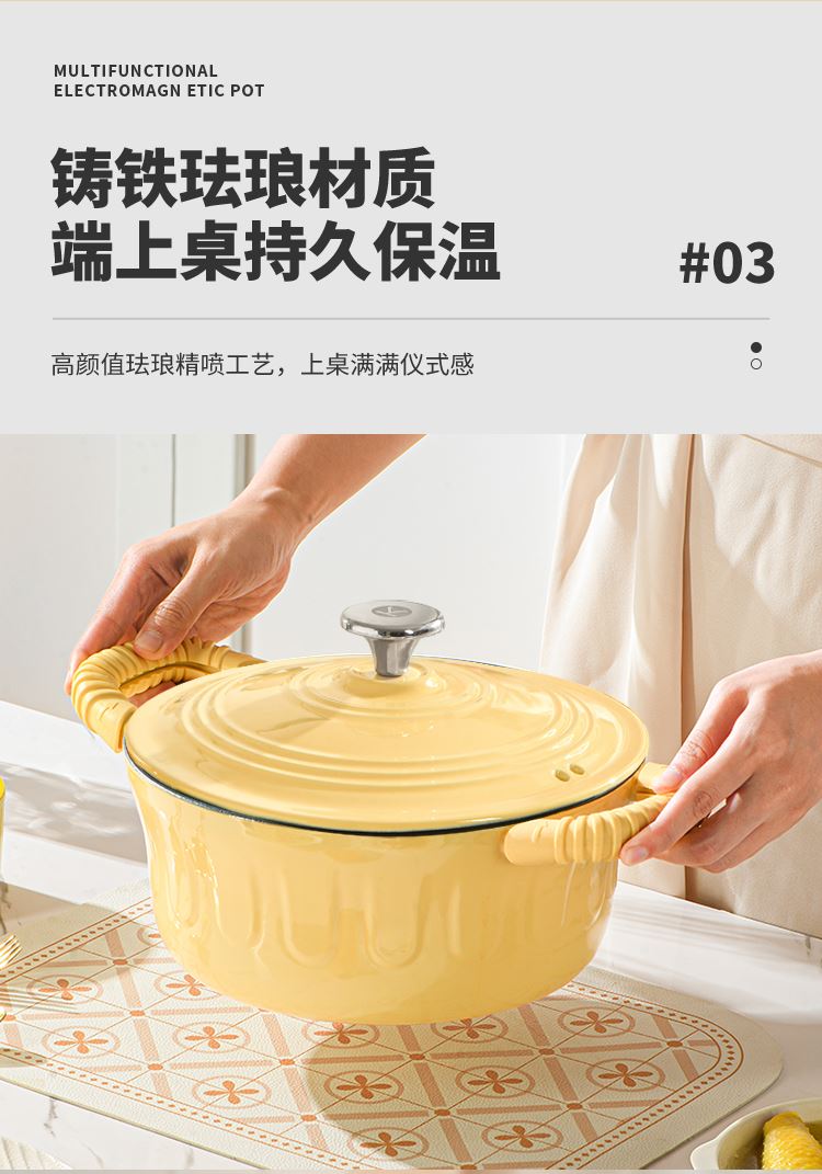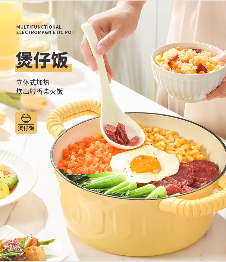8大智能菜单,花洒锅盖微压烹饪 品质铸铁珐琅,智能触控面板 4L大容量,1600W功率IH加热 分体式一锅端,防烫把手硅胶套 24小时预约免看火从容安排时间