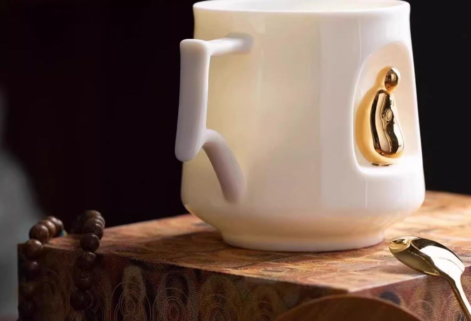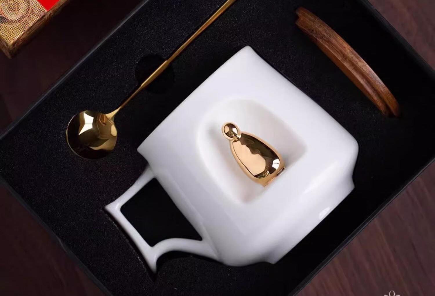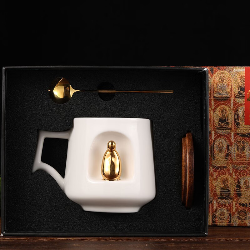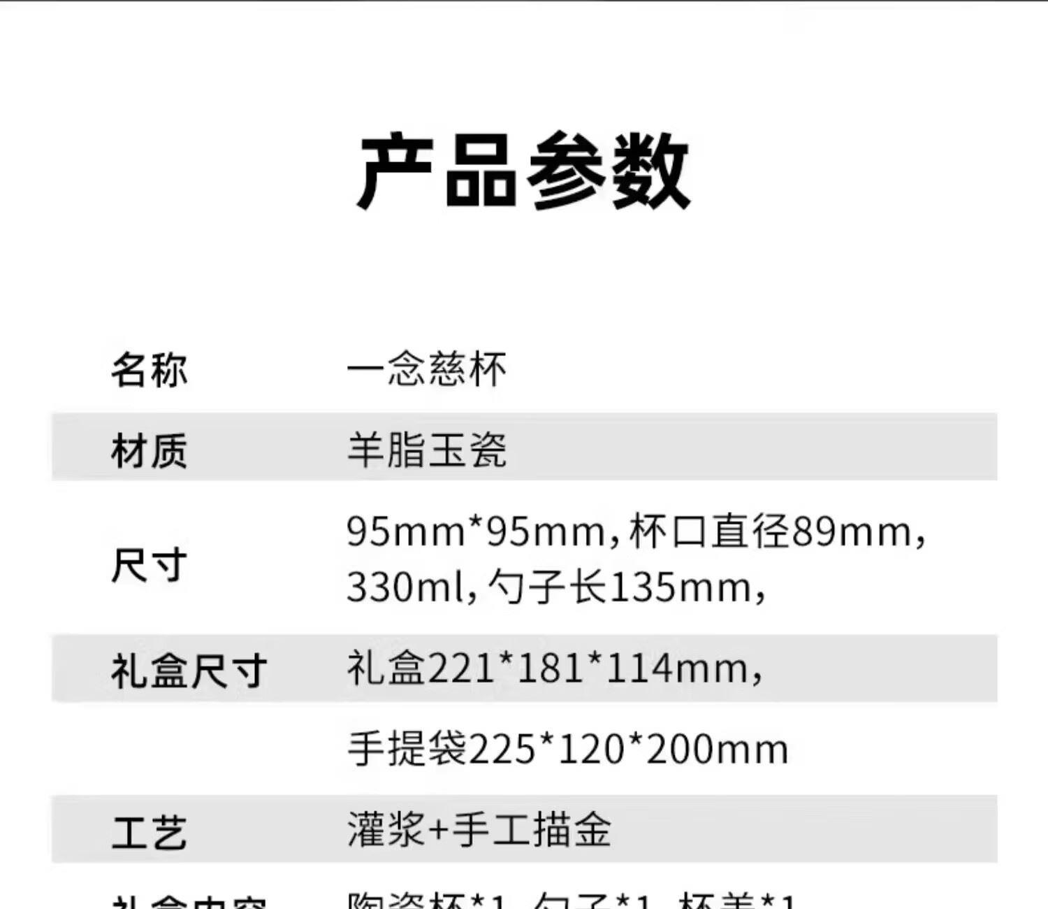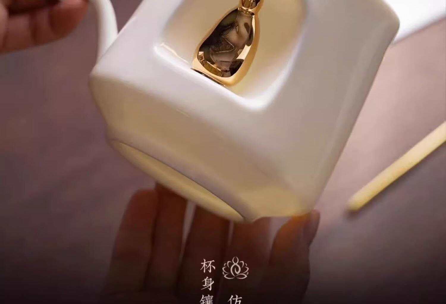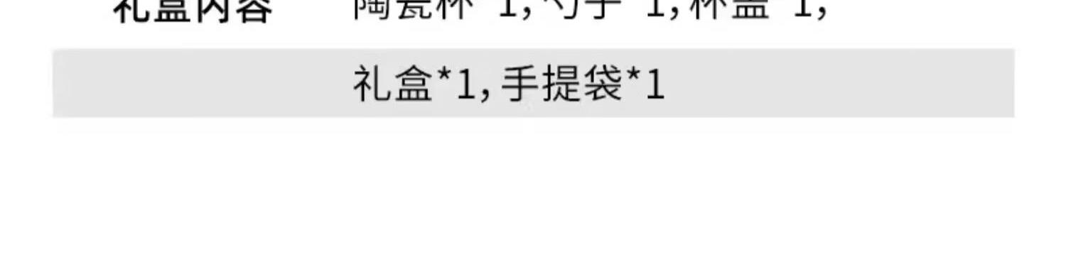 材质:羊脂玉瓷 礼盒尺寸:礼盒221*181*114mm, 工艺:灌浆+手工描金 礼盒内容:陶瓷杯*1,勺子*1,杯盖*1,礼盒*1,手提袋*1