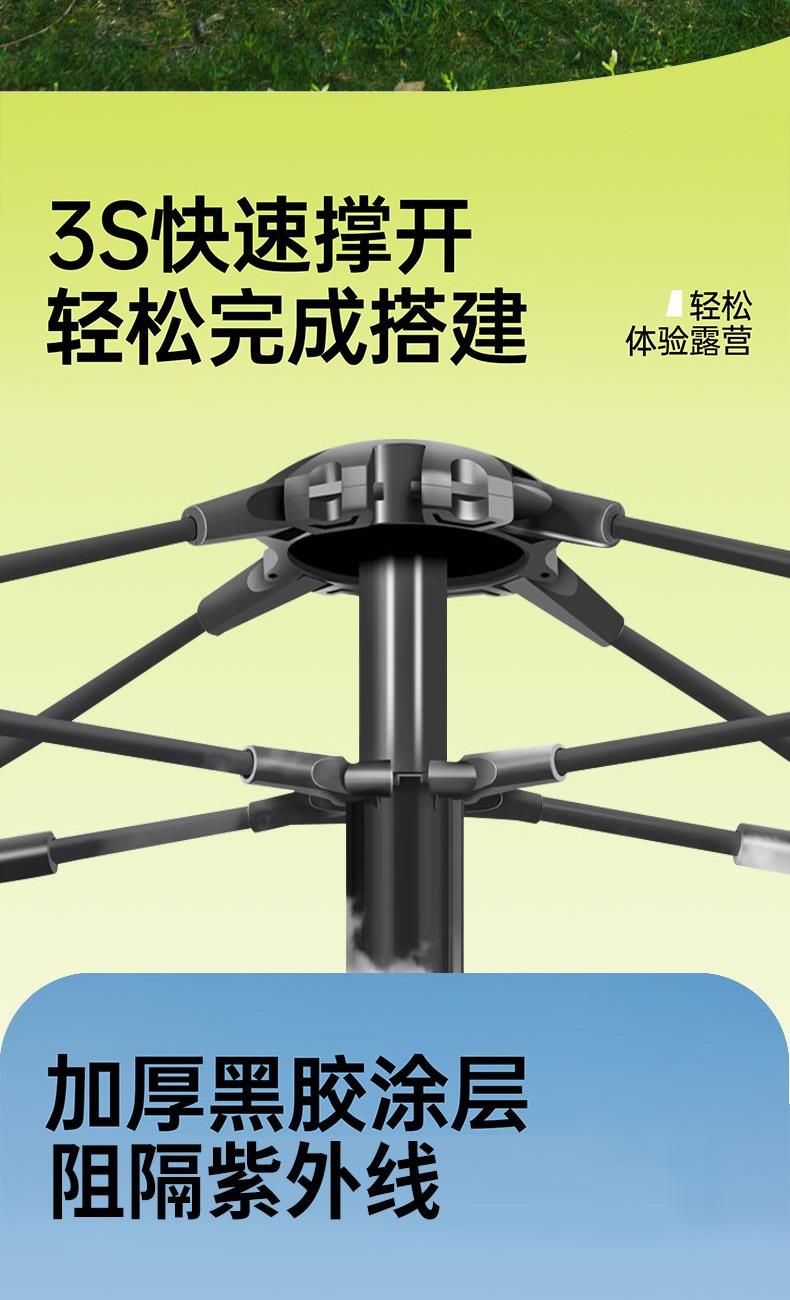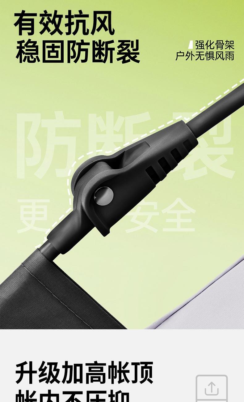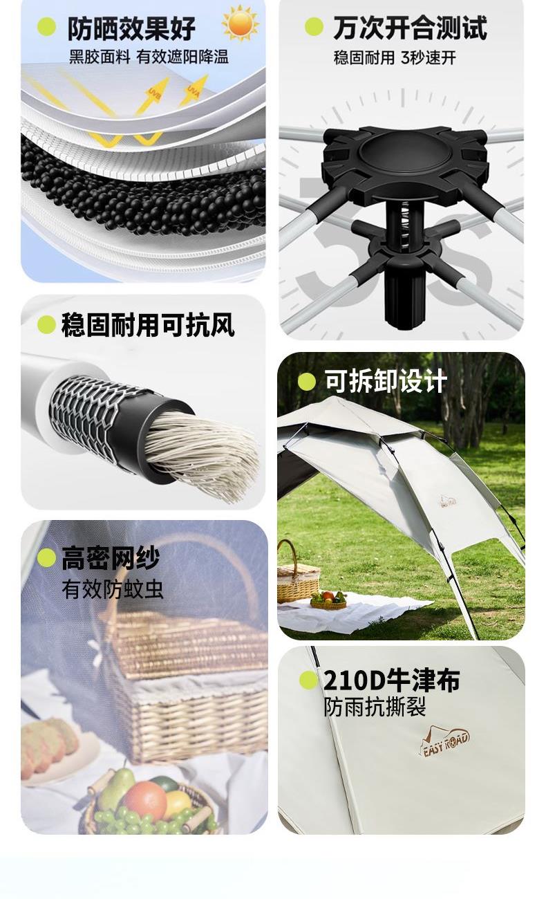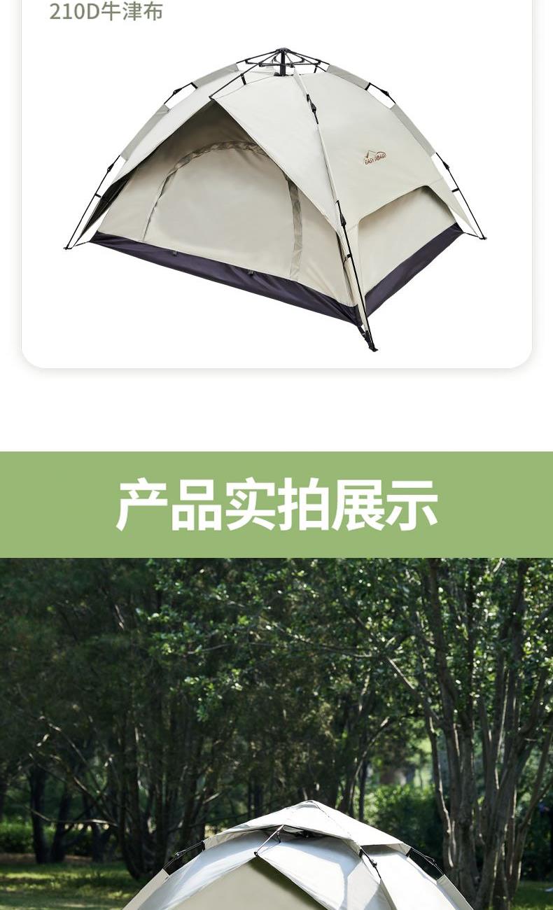 规格: 220x200x135cm 材质:210D牛津布+PU1500MM+网纱 杆子:8.5mm自动弹簧纤维杆 配件:8个地钉+4个防风绳
