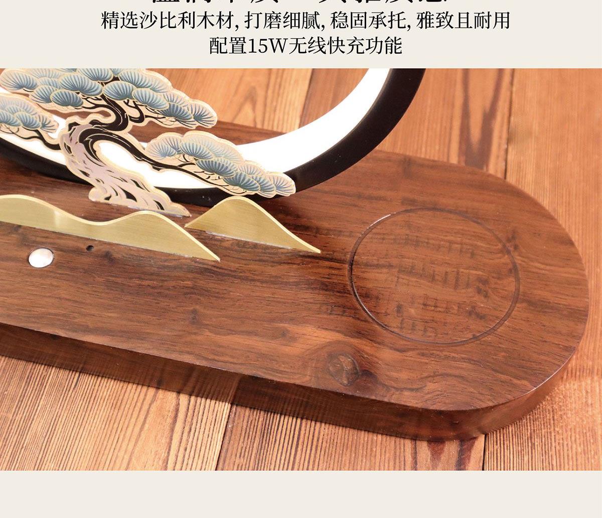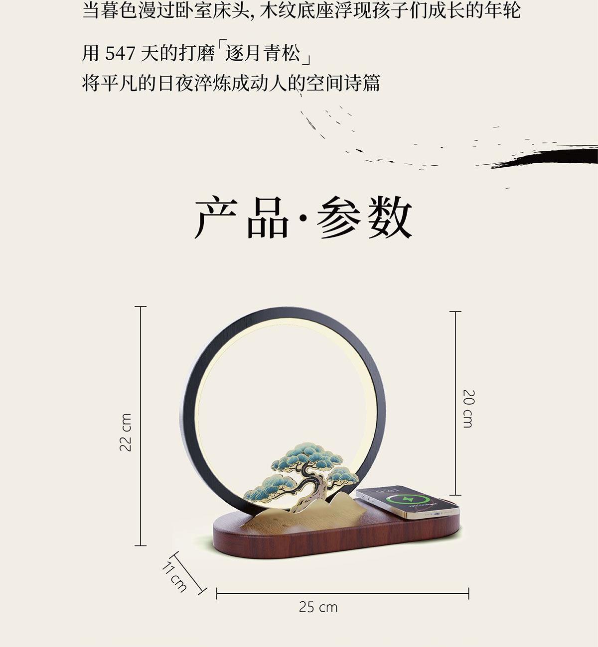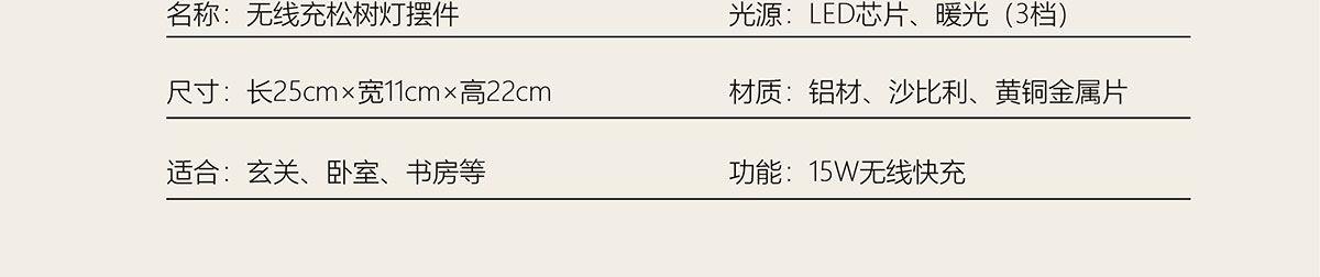 逐月青松 无线充松树灯摆件 配置功能 发光灯(暖光3档)15W手机无线快充底座L0G0定制 材质 主体:铝材、硅胶、黄铜金属片底座:沙比利木 尺寸 木质底座摆件规格:250x110x220mm手提盒尺寸:270x130x250mm