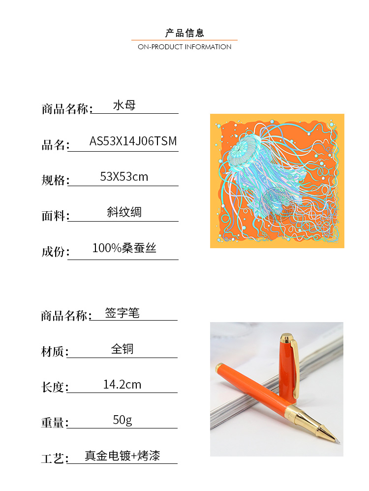 水母真丝小方巾 多姿水母,水中飘逸;形态变幻,美轮美奂 签字笔,烤漆重手感,商务办公金属签字笔 烤漆与金属邂逅匠人之手 烤漆重手感成就艺术精品 「水母」小方巾 尺寸:53×53cm 成分:桑蚕丝 面料:14姆米真丝斜纹绸 卷边:手工密针反卷边 工艺:手工台版印 商务办公金属签字笔 材质:全铜 长度:14.2cm 工艺:真金电镀+烤漆 重量:50g 笔头规格:0.5mm