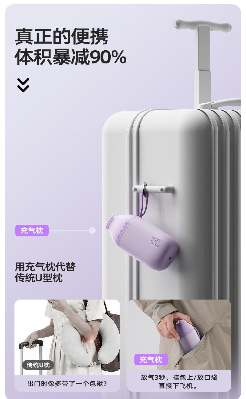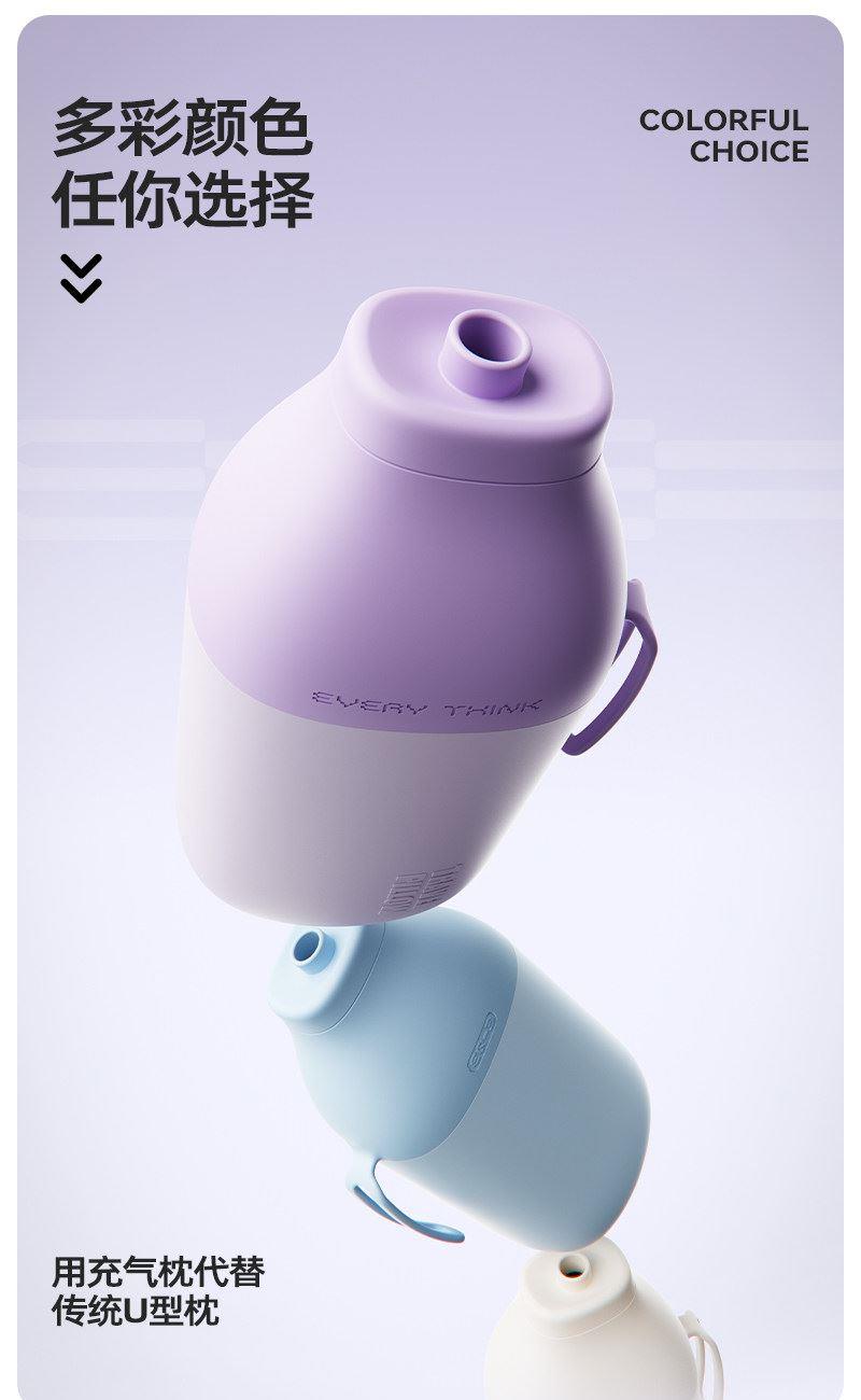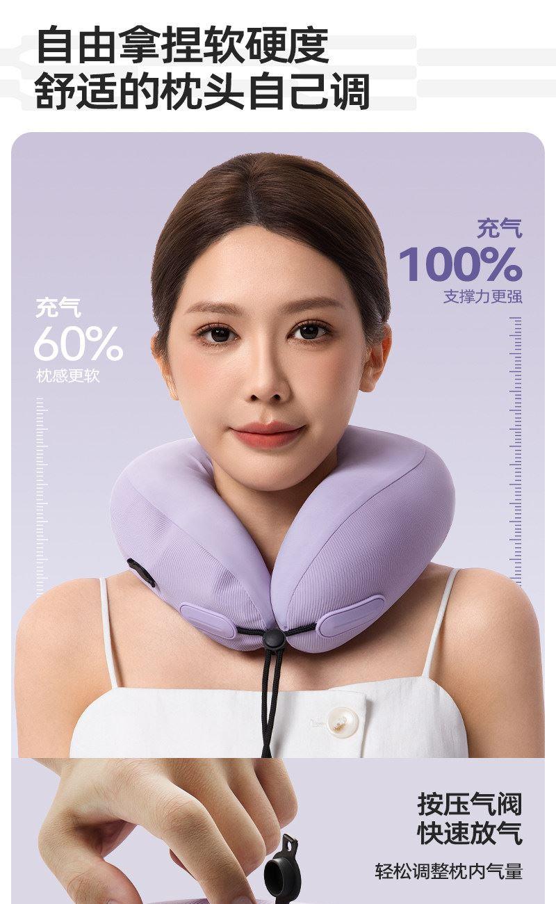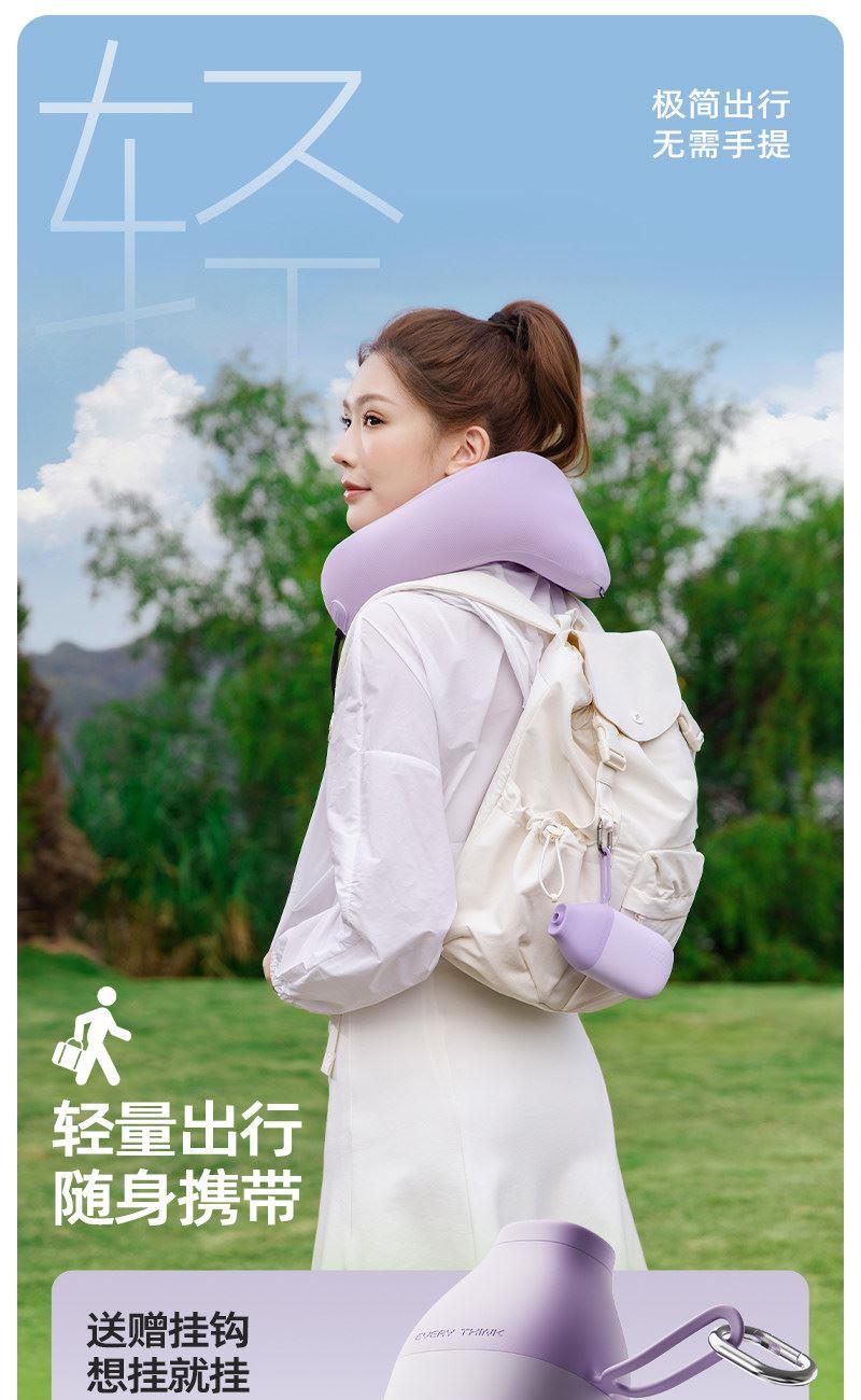 充气+收纳一体式U型枕,免嘴吹,10秒快充 不占箱包空间,挂着就走,真正减轻您的出行负担 自由拿捏软硬度,充气60%枕感更软,充气支撑力更强 按压气阀,快速放气,轻松调整枕内气量 卫衣卡扣设计,一扣一拉,滑动调节。自由调节围度,各种脖型都能贴合 耐用TPU气囊,更稳定,更安全 凉感面料,持久透气不闷热 可选颜色:雾衫紫、苏打蓝、米杏白、砂岩黑