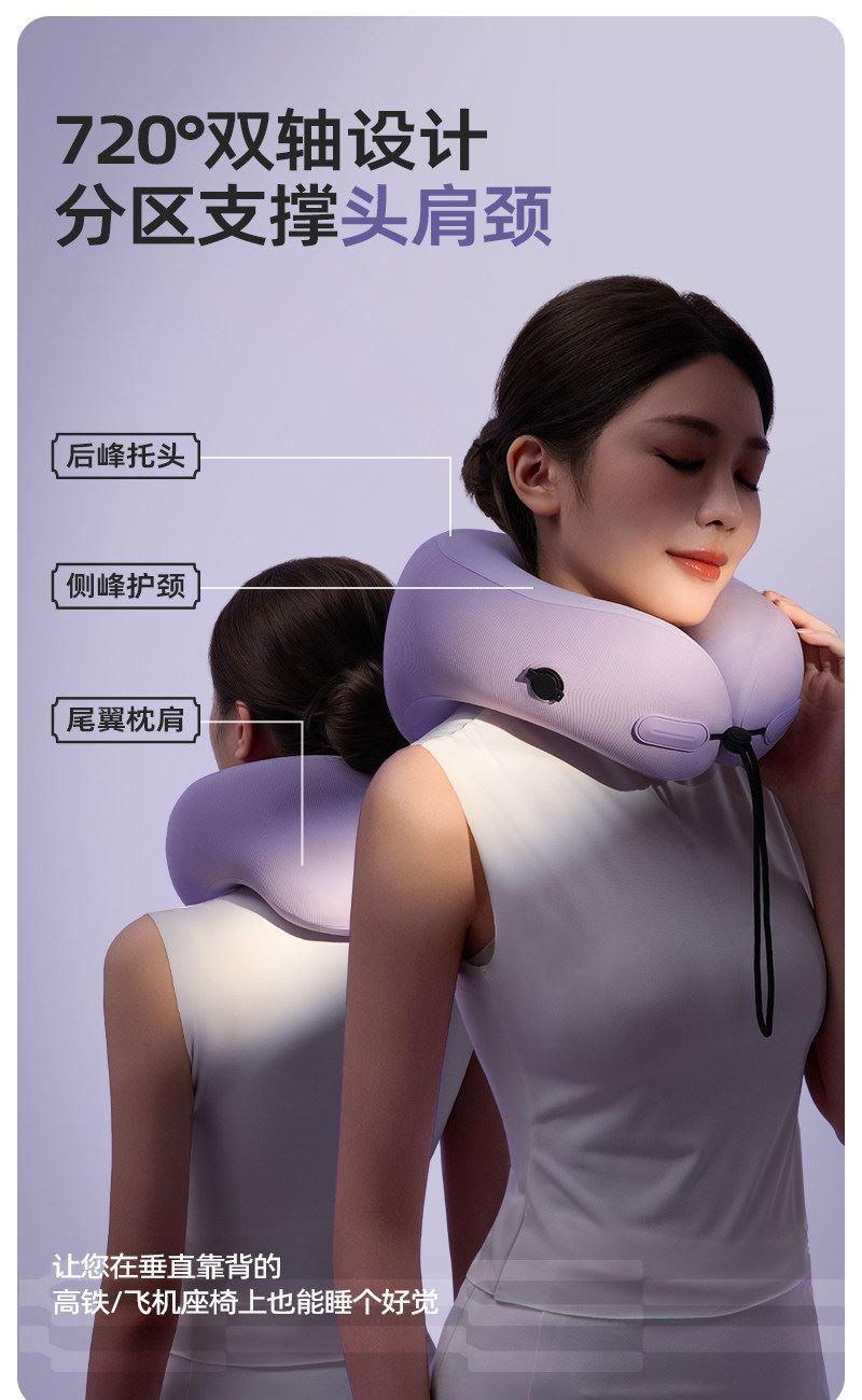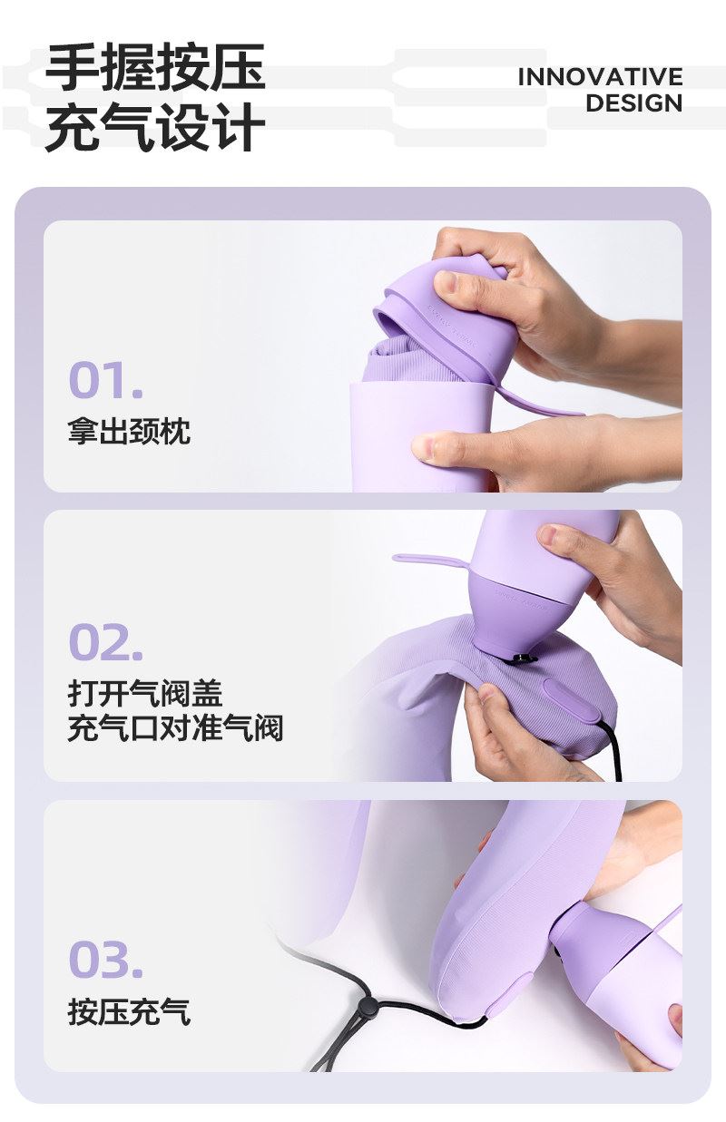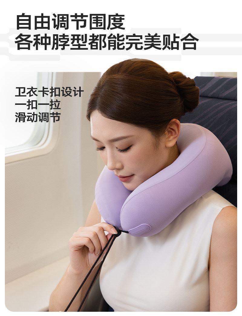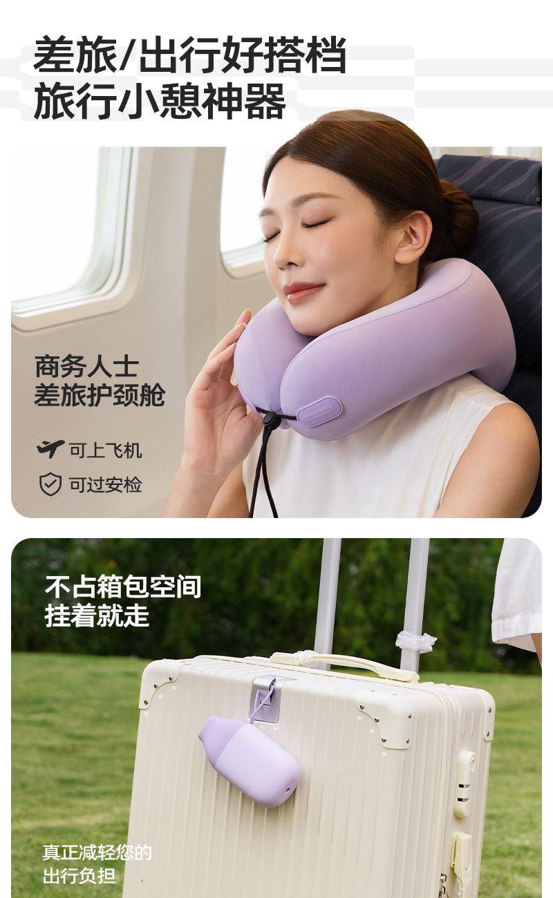 充气+收纳一体式U型枕,免嘴吹,10秒快充 不占箱包空间,挂着就走,真正减轻您的出行负担 自由拿捏软硬度,充气60%枕感更软,充气支撑力更强 按压气阀,快速放气,轻松调整枕内气量 卫衣卡扣设计,一扣一拉,滑动调节。自由调节围度,各种脖型都能贴合 耐用TPU气囊,更稳定,更安全 凉感面料,持久透气不闷热 可选颜色:雾衫紫、苏打蓝、米杏白、砂岩黑
