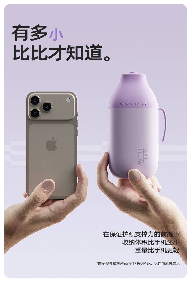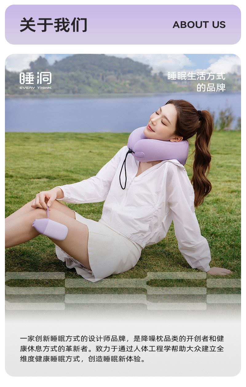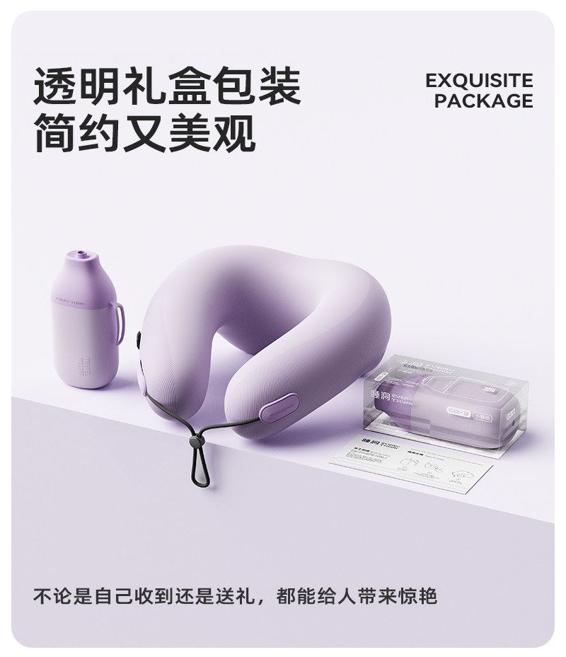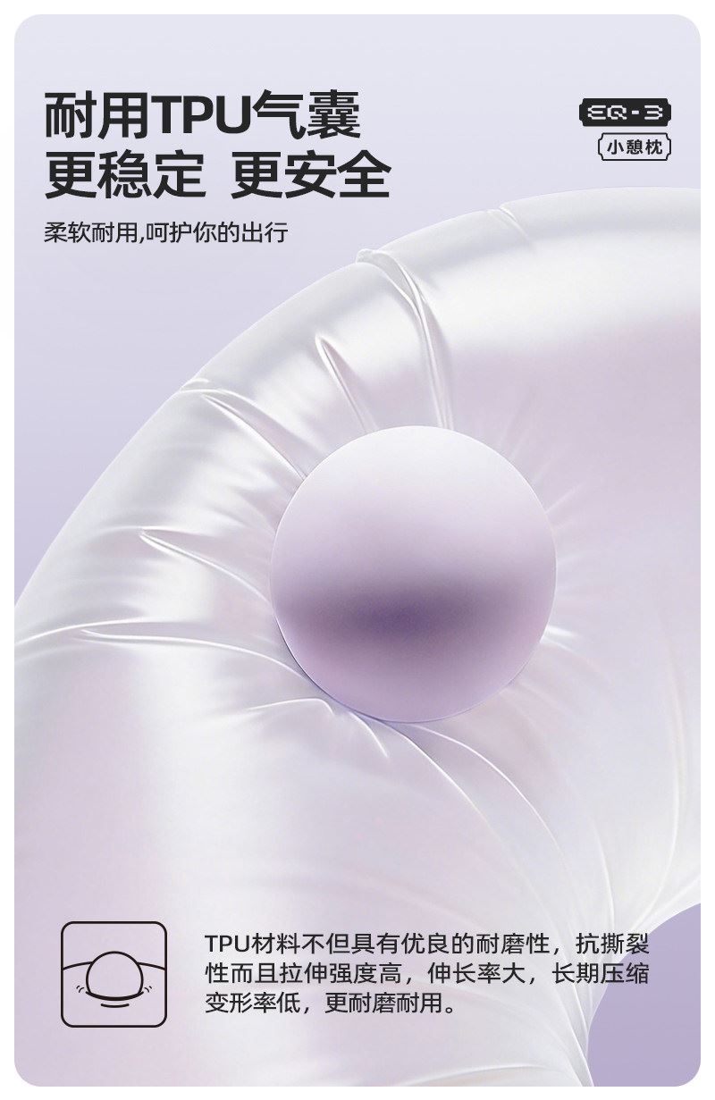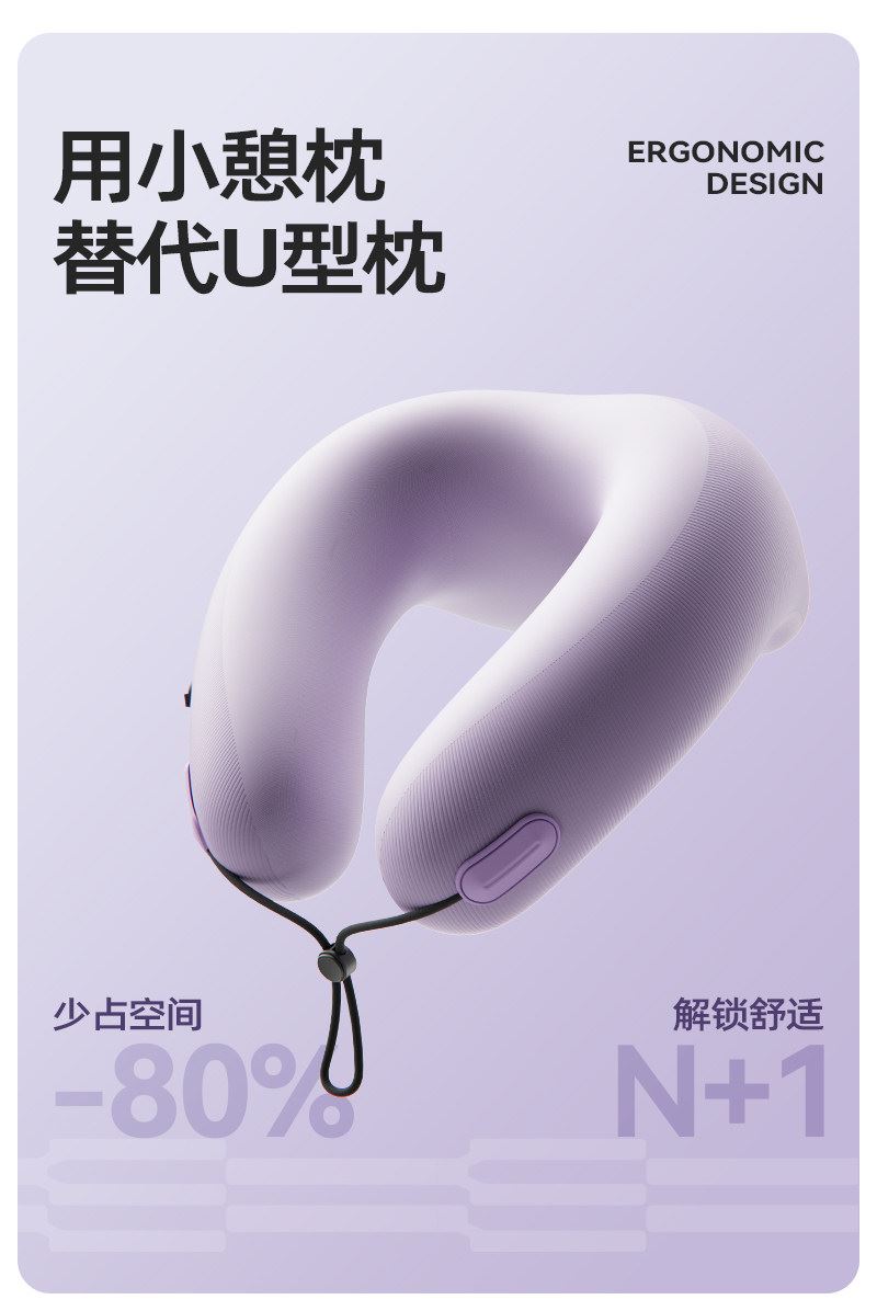 充气+收纳一体式U型枕,免嘴吹,10秒快充 不占箱包空间,挂着就走,真正减轻您的出行负担 自由拿捏软硬度,充气60%枕感更软,充气支撑力更强 按压气阀,快速放气,轻松调整枕内气量 卫衣卡扣设计,一扣一拉,滑动调节。自由调节围度,各种脖型都能贴合 耐用TPU气囊,更稳定,更安全 凉感面料,持久透气不闷热 可选颜色:雾衫紫、苏打蓝、米杏白、砂岩黑