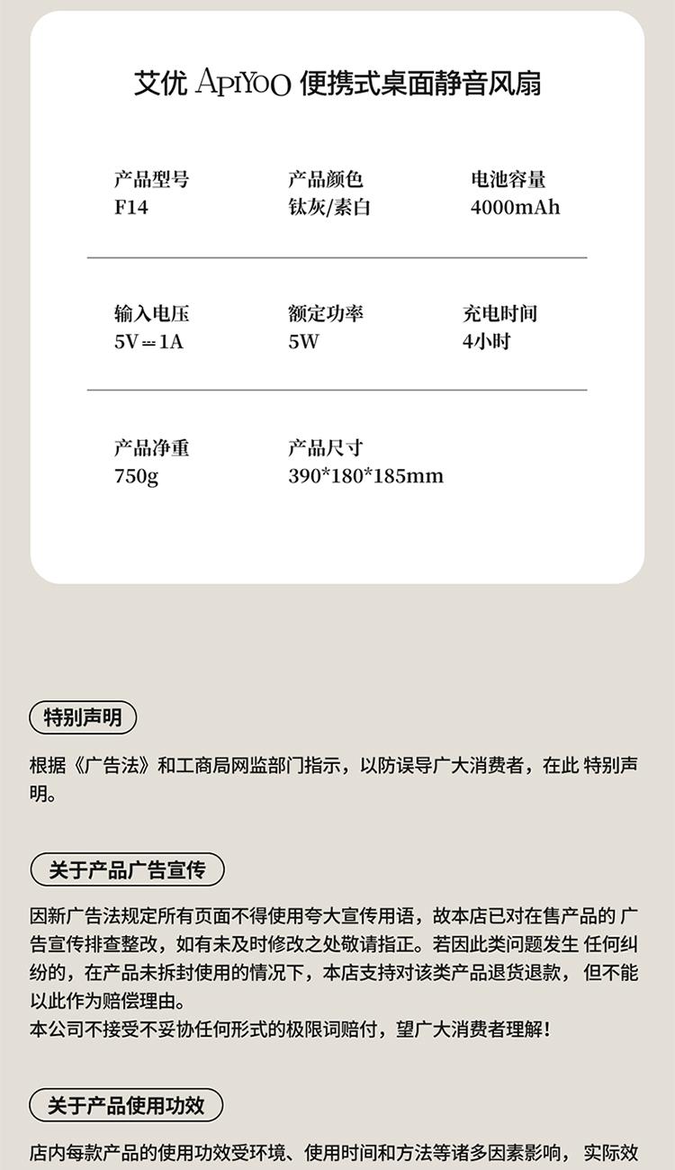 产品型号:F14 颜色:素白、钛灰 电池容量:4000mAh 充电时间:4小时 产品重量:750g 包装尺寸:390*180*185mm