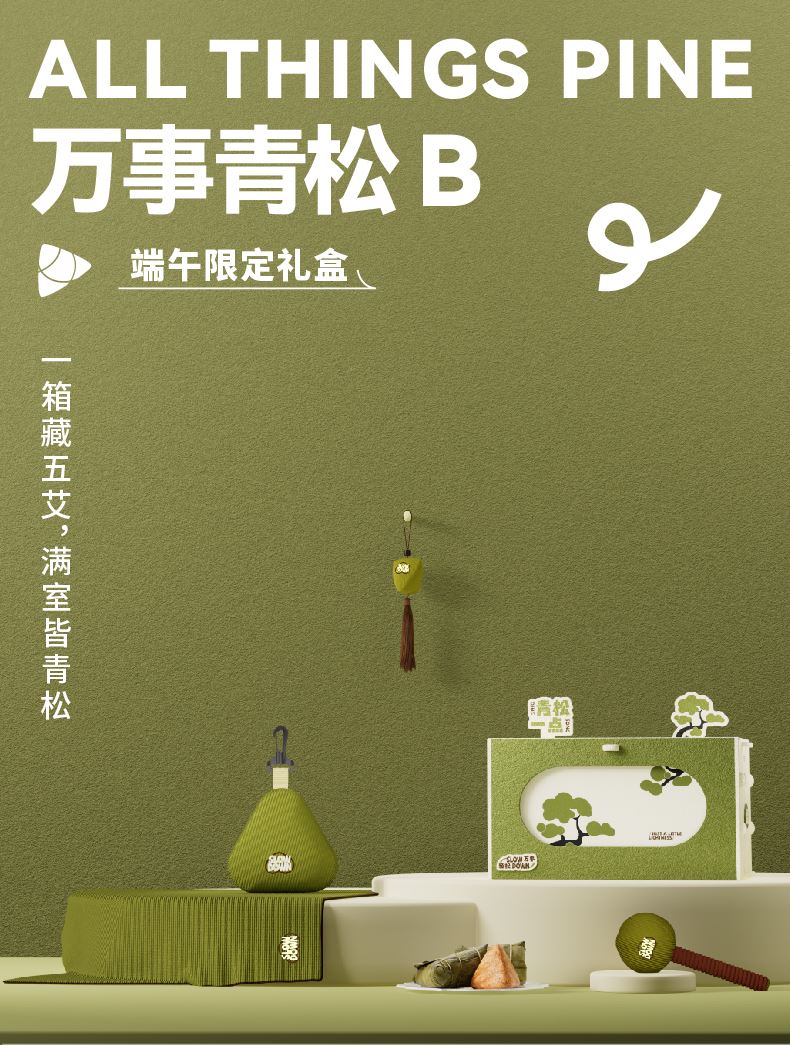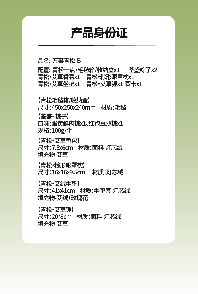 万物繁茂的时节,,愿你的生活有一棵自己的松。 不必太用力,该生长时生长,该停歇时停歇。 风吹过针叶的细响,是日子在轻声应和 万事青松,自在从容 这一季,祝你:心有苍翠,步履轻盈 内配: 配置一:青松一点·毛毡箱/收纳盒x1 配置二:荃盛粽子x2 配置三:青松·艾草香囊x1 配置四:青松·粽形眼罩枕x1 配置五:青松·艾草坐垫x1 配置六:青松·艾草锤x1 配置七:贺卡x1