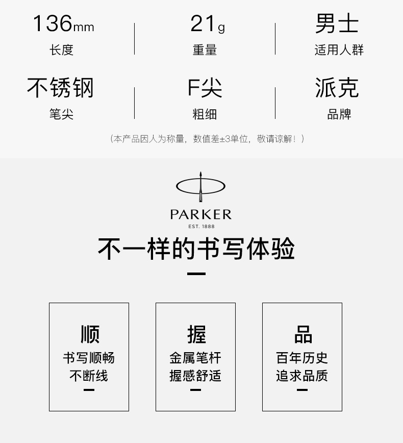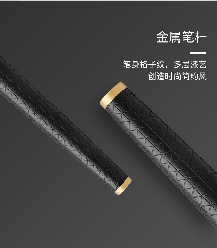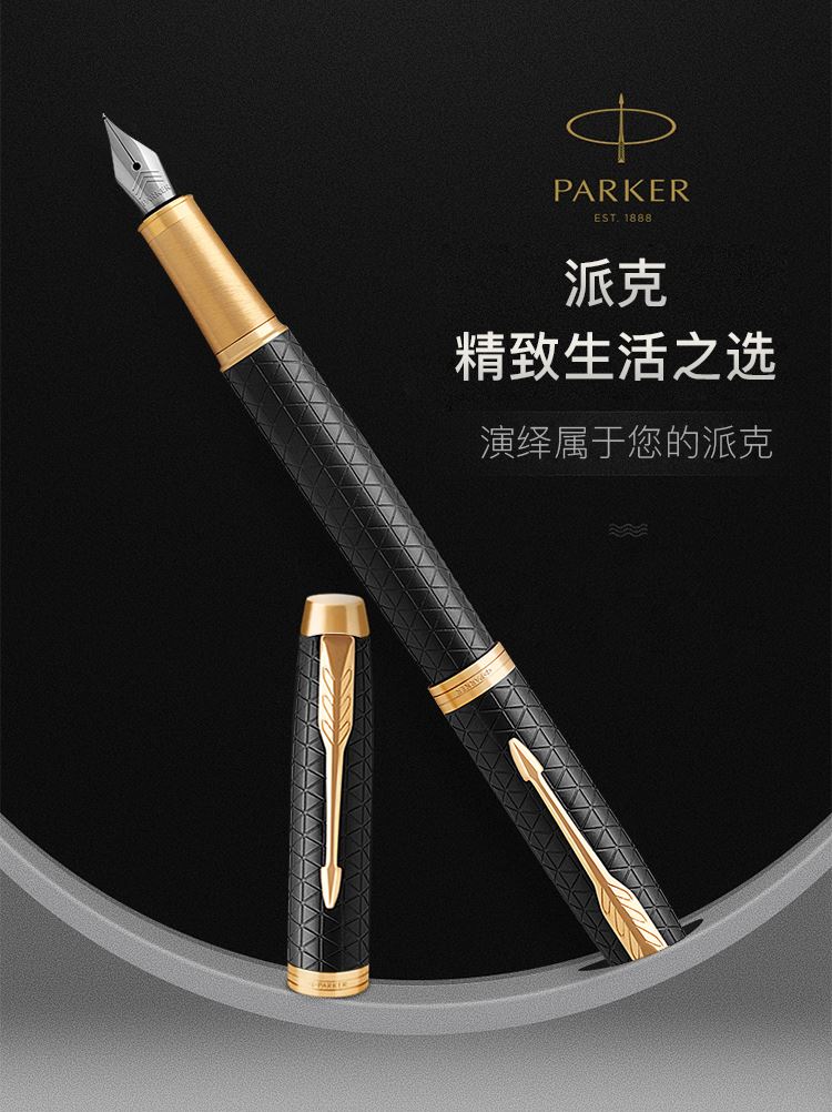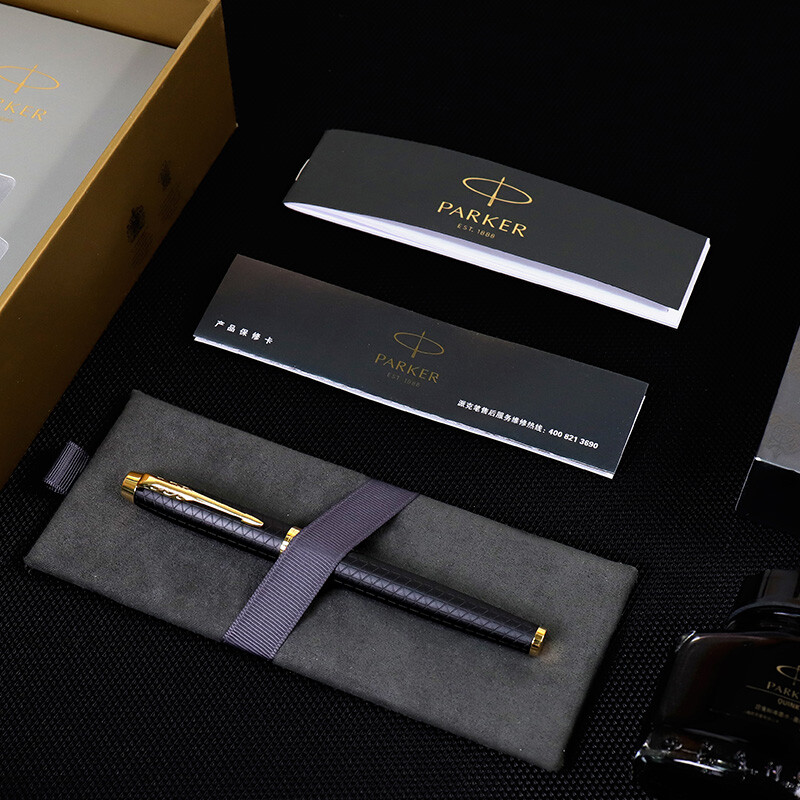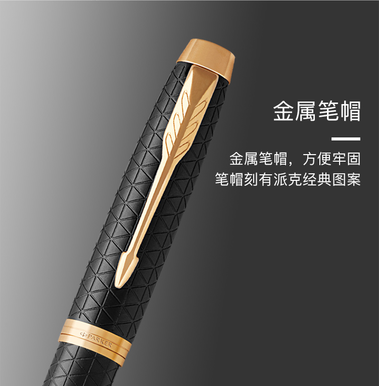 规格:笔长138mm 直径12.6mm 净重约32g 粗细:F尖 笔尖:不锈钢笔尖 材质:铜质笔杆镀黑色漆,激光雕刻图案, 金色抛光笔夹笔饰 配置:笔、墨水、保修卡、使用说明书、 派克手提袋、礼盒 特点: 1、笔帽雕刻派克LOGO,三环金色笔环; 2、不锈钢笔尖雕刻派克LOGO; 3、铜质笔杆镀黑色漆,激光雕刻图案; 4、金色笔冠,金色手握,绅士风格。