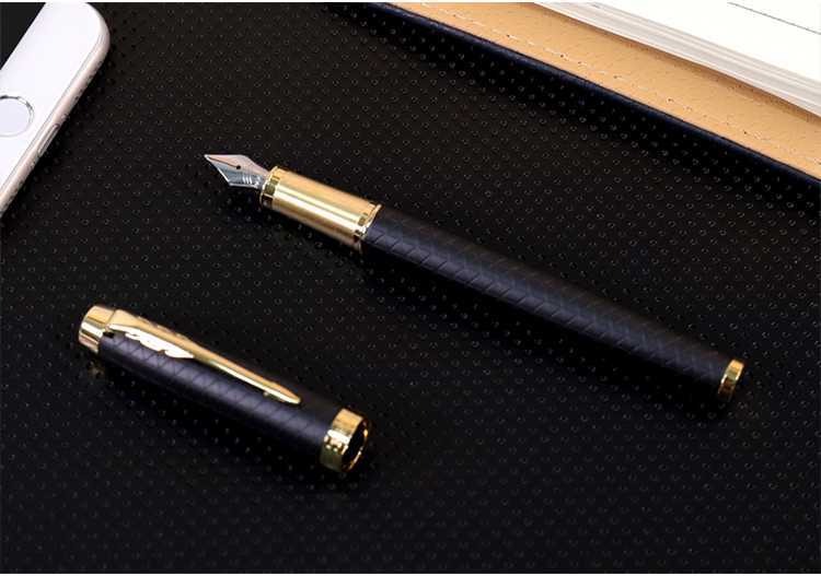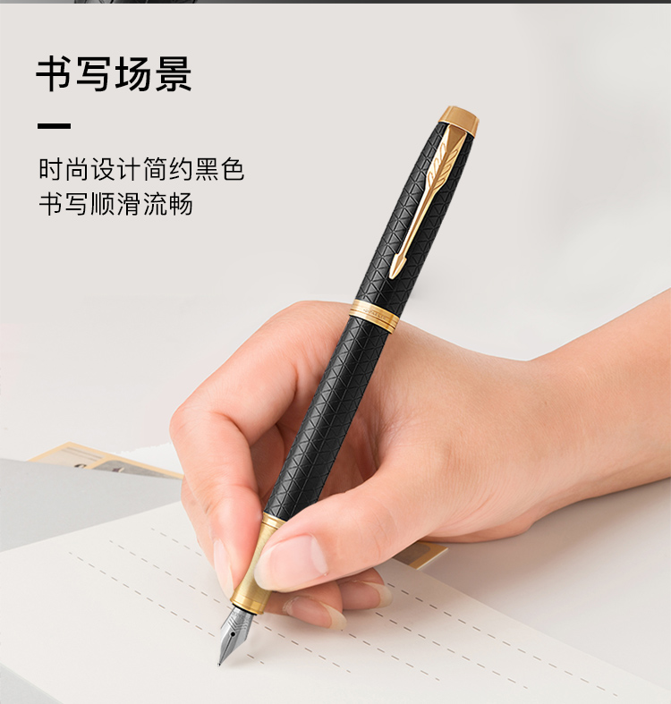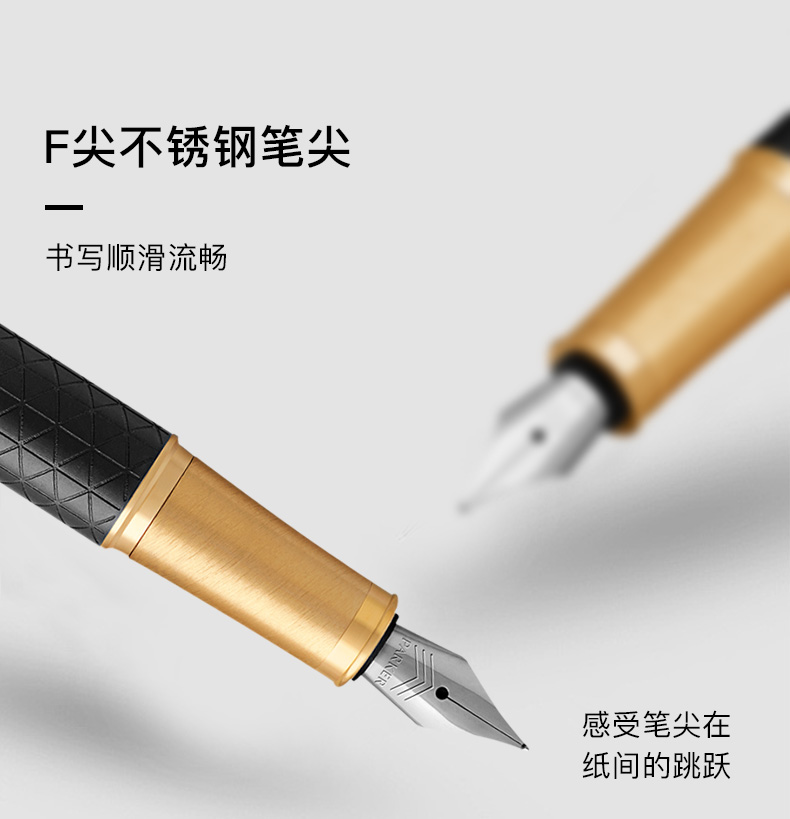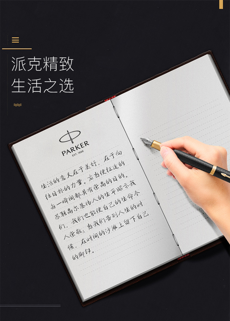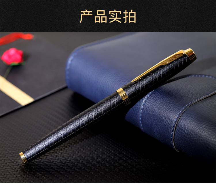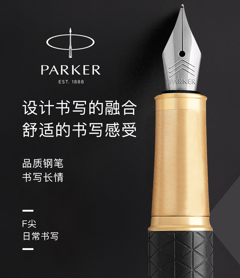 规格:笔长138mm 直径12.6mm 净重约32g 粗细:F尖 笔尖:不锈钢笔尖 材质:铜质笔杆镀黑色漆,激光雕刻图案, 金色抛光笔夹笔饰 配置:笔、墨水、保修卡、使用说明书、 派克手提袋、礼盒 特点: 1、笔帽雕刻派克LOGO,三环金色笔环; 2、不锈钢笔尖雕刻派克LOGO; 3、铜质笔杆镀黑色漆,激光雕刻图案; 4、金色笔冠,金色手握,绅士风格。