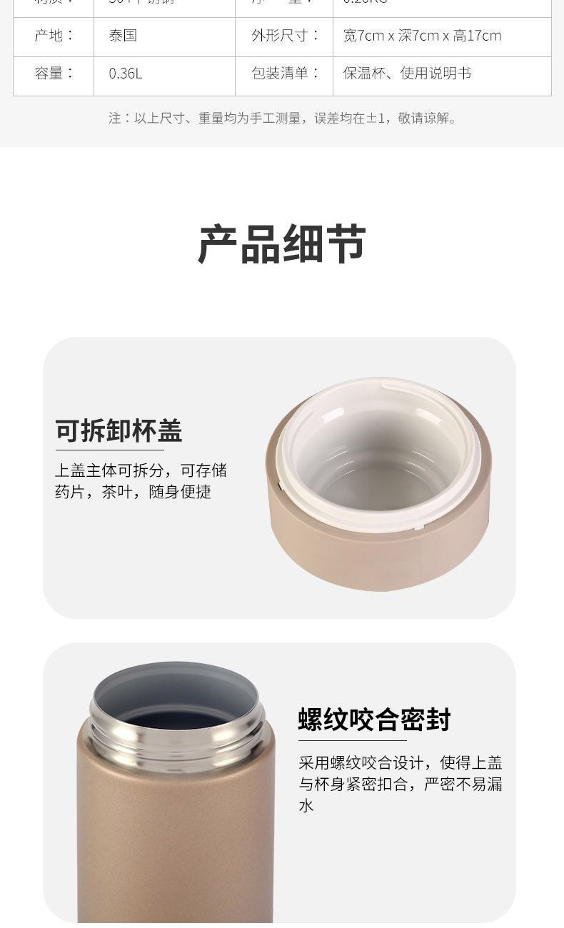 品 牌:象印ZOJIRUSHI 型 号:ASE商务礼盒装 颜 色:盒子黑色,杯子:深咖色 金色 粉色 红色 容 量:500ML 类 型:旋盖杯 材 质:304不锈钢色 保 温:6小时大约60°C 保 冷:6小时大约10°C 产 地:泰国 礼 盒:可以装任何颜色杯子,配手提袋