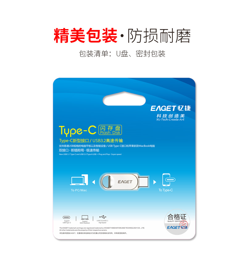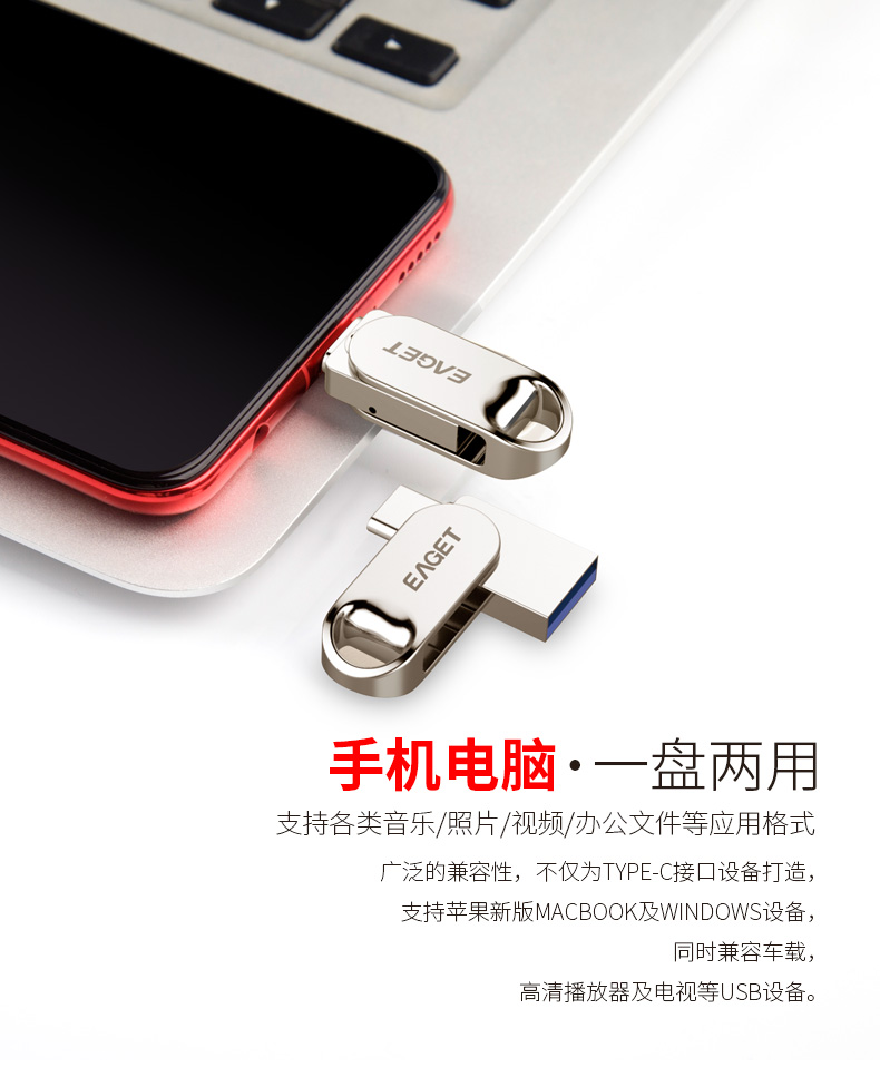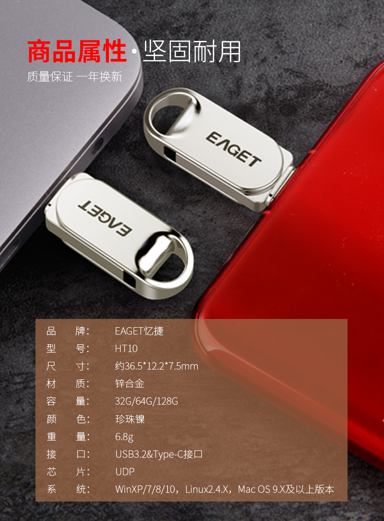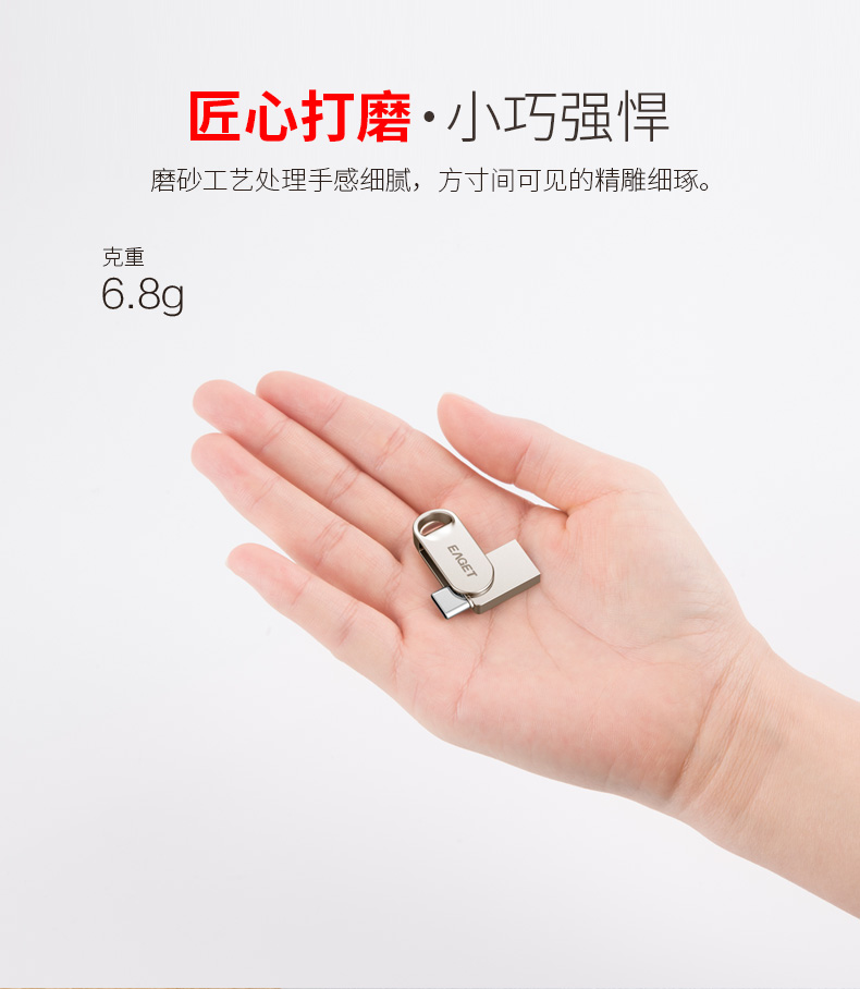 USB3.2 Type-c 双接口 全金属设计,质感超群 小巧便携,个性化设计 安全防水 防震性强 手机、电脑硬盘两用广泛兼容性 360°钢环挂钩,轻松切换 产品尺寸:约36.5*12.2*7.5mm 包装尺寸:11.3*9*cm 单品重量:6.8g