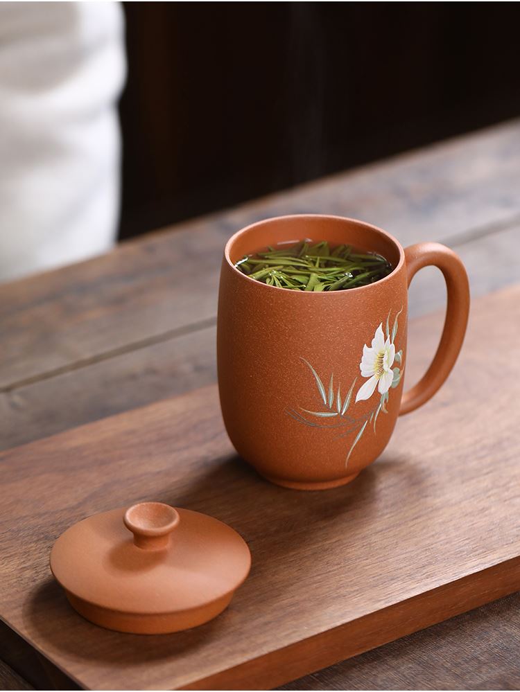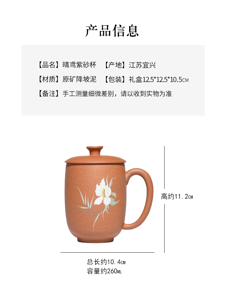 配置清单:茶杯*1 礼盒*1 容量:260ml 材质:紫砂降坡泥 宜兴原矿紫砂泥 权威检测 质量保证 手工泥绘鸢尾花图案 清新雅致 聚香凝香 双气孔 适茶广