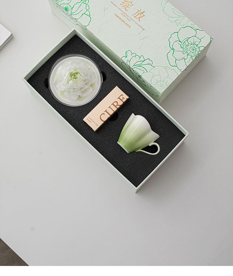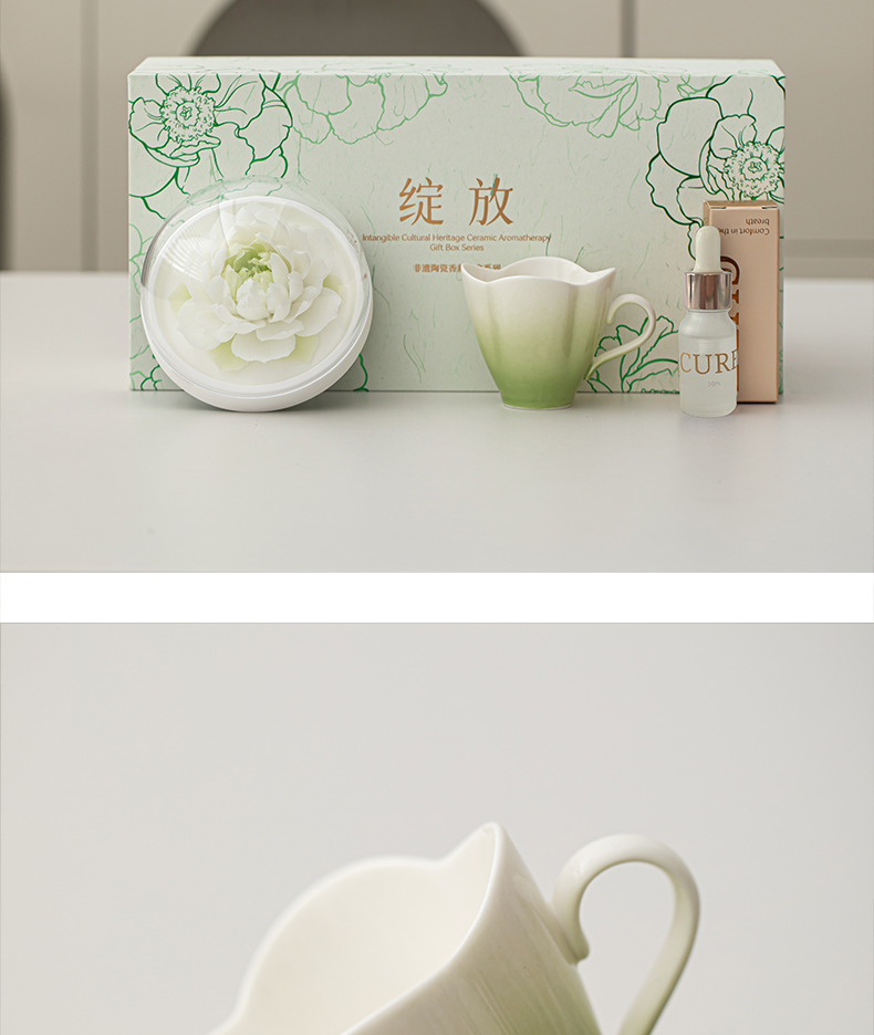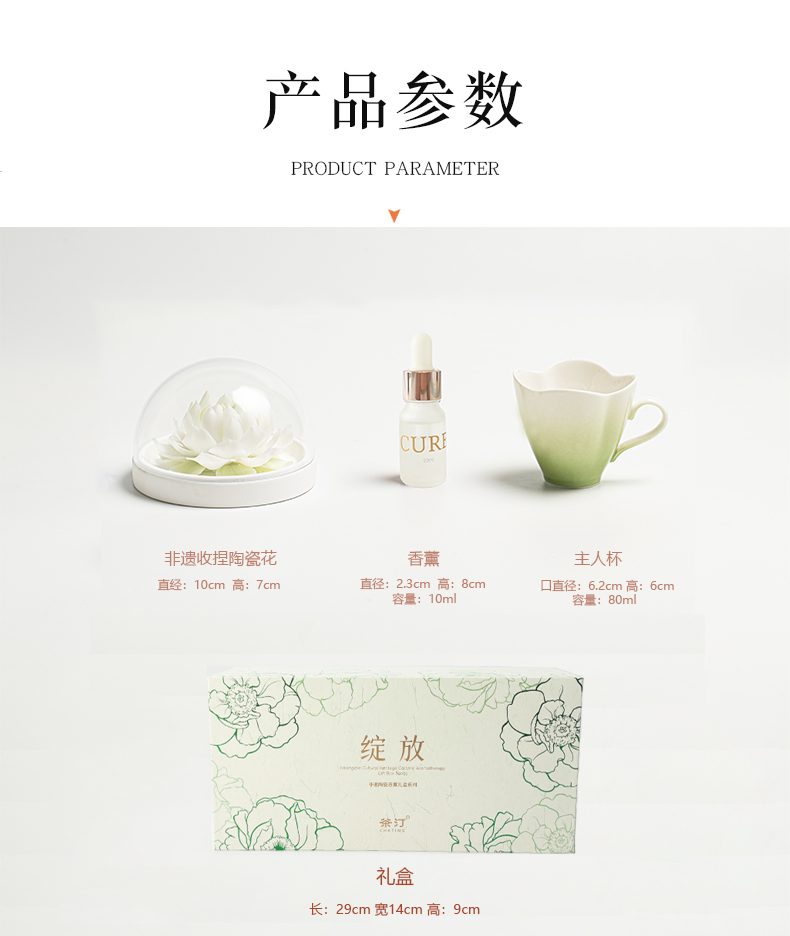 【产品配置】 非遗陶瓷手捏花*1 主人杯*1 香薰*1 礼盒*1 礼袋*1 【产品说明】 非遗工艺手捏陶瓷花香薰,每一朵都是栩栩如生的; 渐变釉主人杯,釉色如星河流动,品茶赏器两相宜; 天然香薰搭配陶瓷花,既是摆件又能散香,营造禅意空间; 精致礼盒包装,送人显品位,收藏有格调; 茶席、香道、家居装饰,随心搭配。