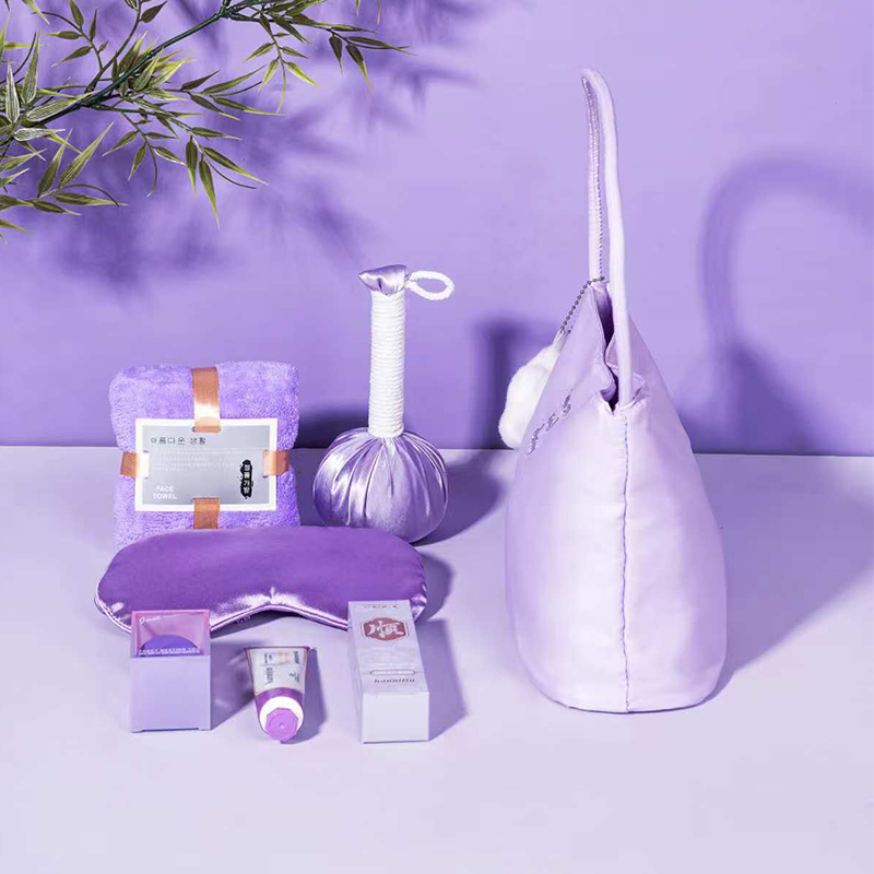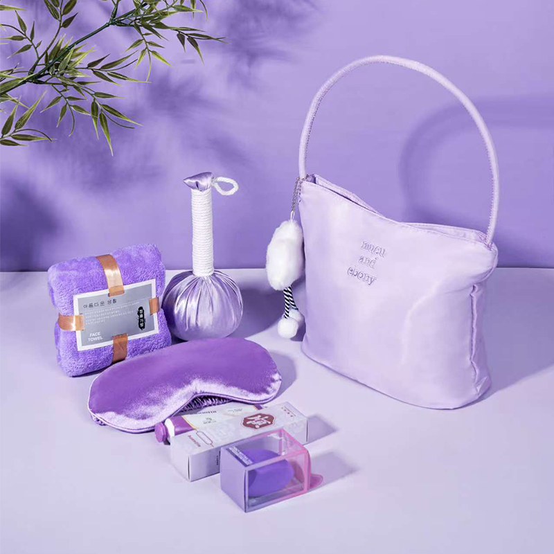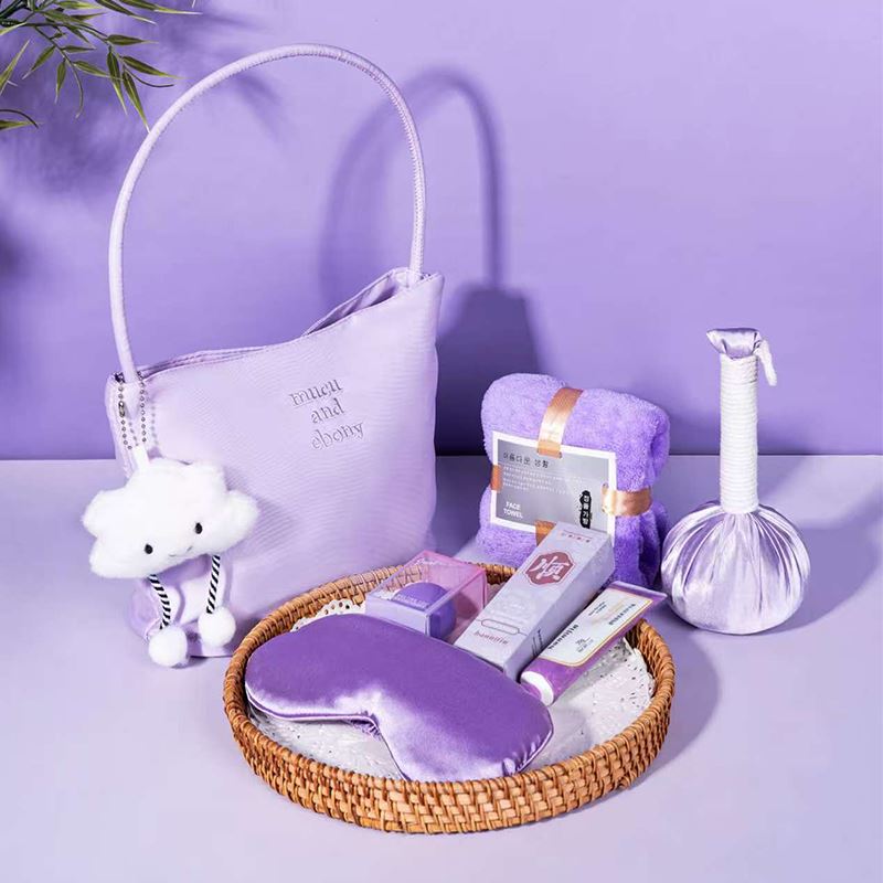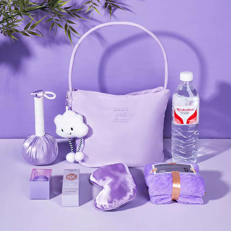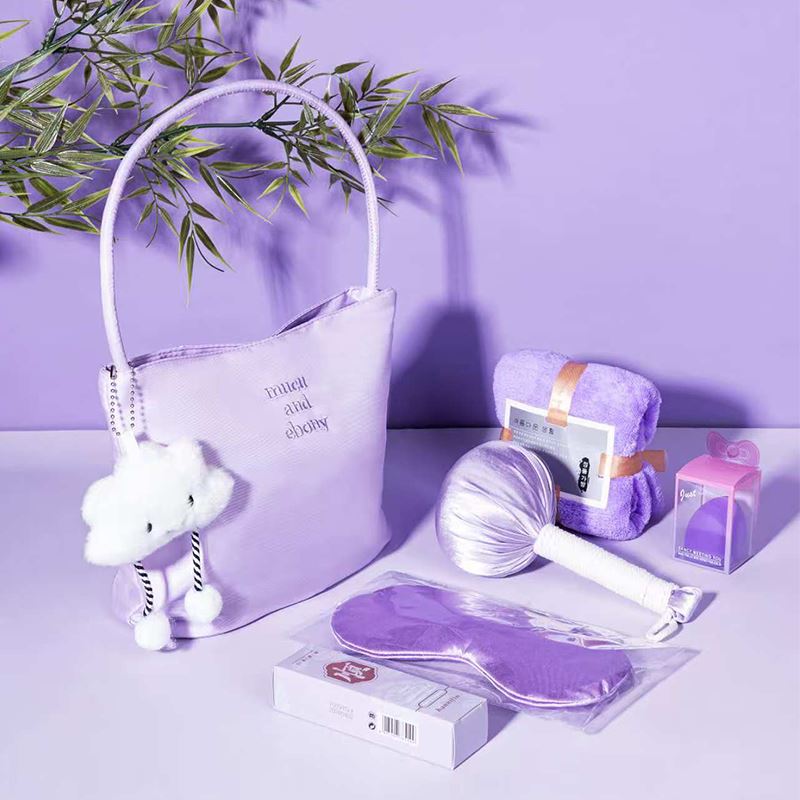 包包规格:260*190*95mm 产品配置:绝绝紫丝质养生锤18cm*1 珊瑚绒毛巾*1 美妆蛋*1 丝质遮光眼罩*1 香根鸢尾护手霜*1 绝绝紫托特包*1 云朵挂饰*1 1、绝绝紫托特包,高弹防水尼龙面料,精美刺绣,袋口磁吸扣,悬挂可爱云朵挂饰,腋下、手提都好看! 2、丝质养生锤,肩颈救星,敲舒服敲享瘦;丝质遮光眼罩,亲肤助眠,滑溜溜不压眼! 3、珊瑚绒毛巾,亲肤柔软,给您云朵般的爱;香根鸢尾护手霜,木质香,小手滋润不干燥;美妆蛋,干湿两用,气孔细腻上妆服帖。 4、绝绝紫同色系搭配套装,精致感拉满,更懂女生更懂爱!奢护之选,全套配齐,给自己的爱,不将就,送他人的礼,更有面儿。