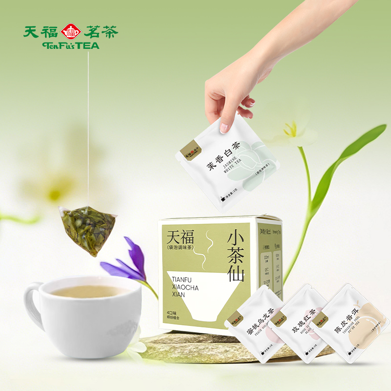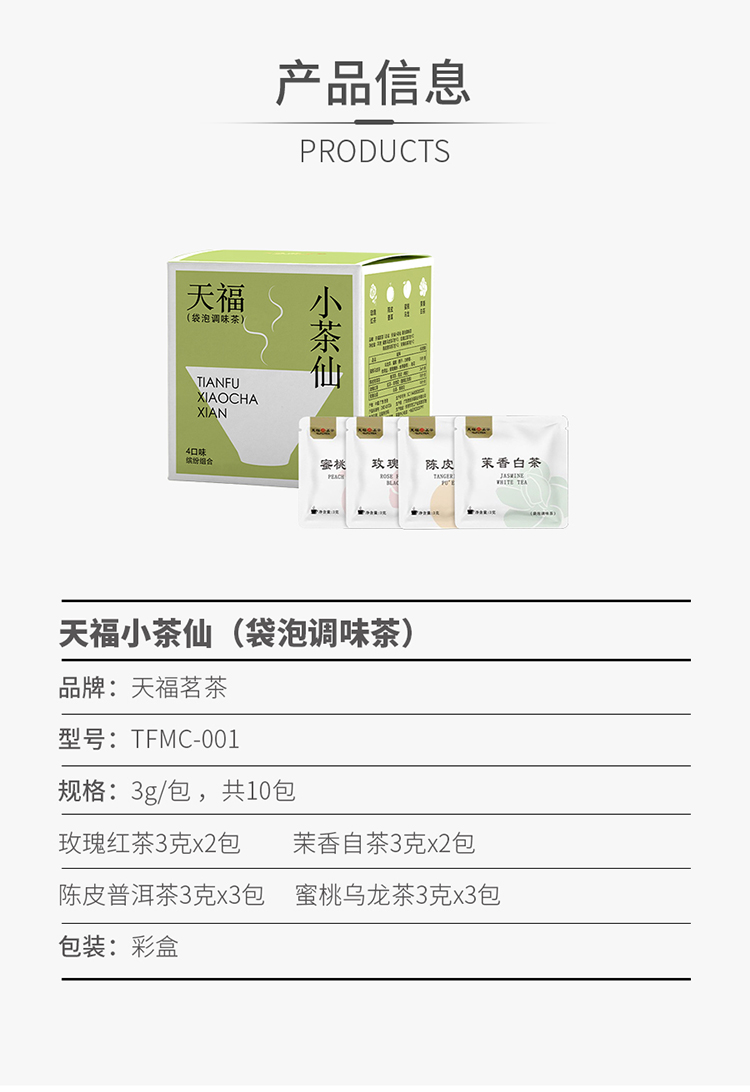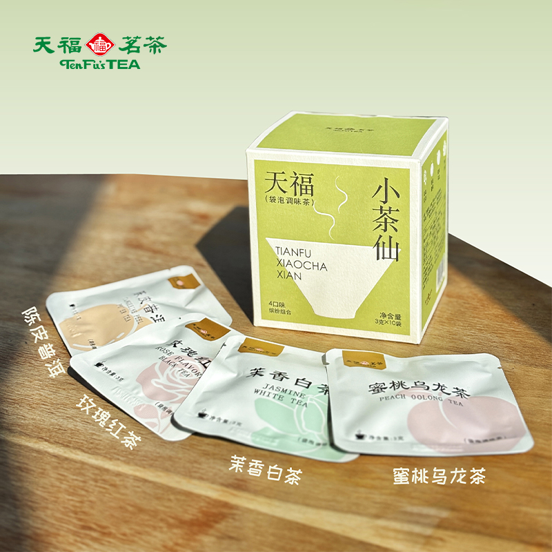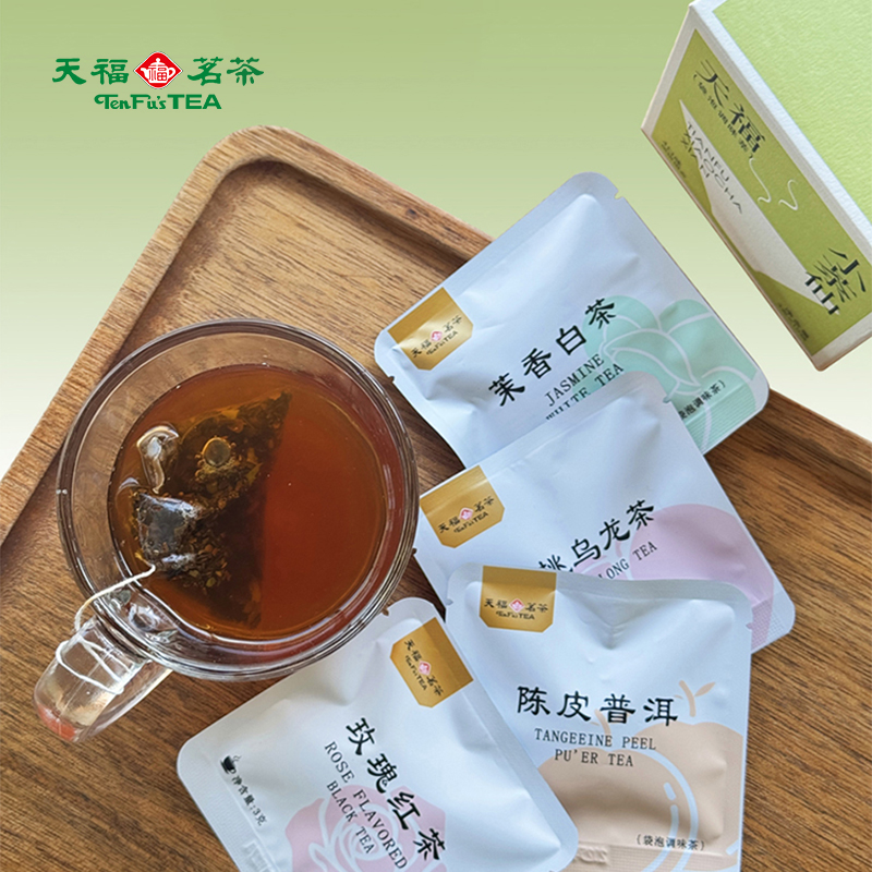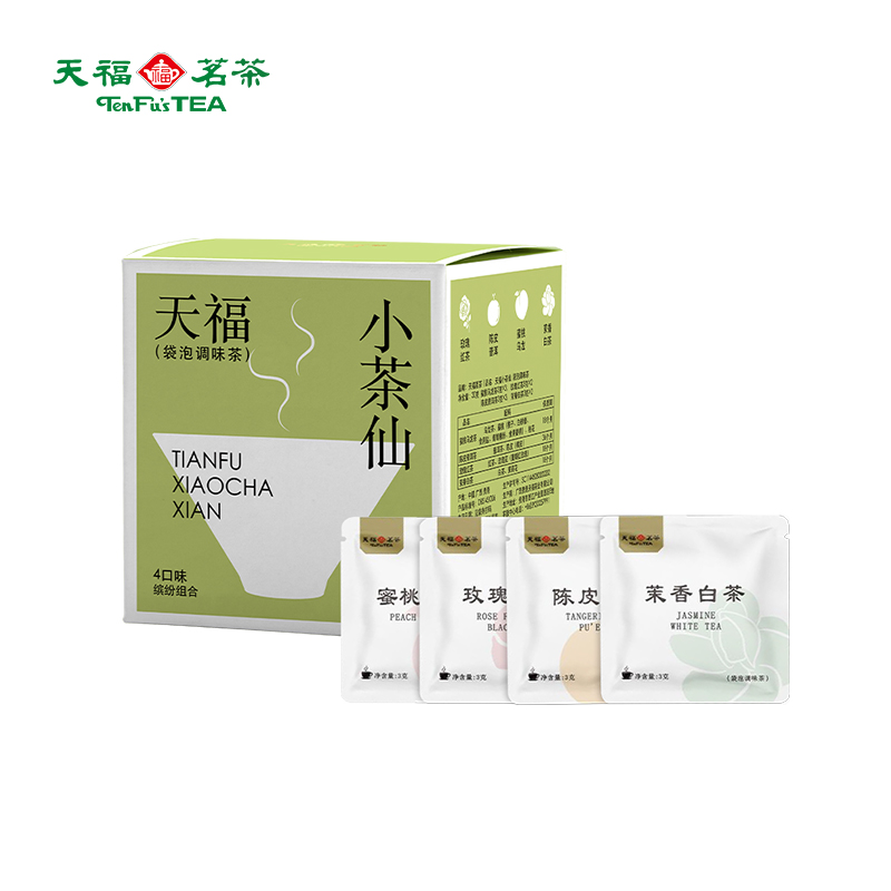 材质规格: 玫瑰红茶3克x2包 茉香自茶3克x2包 陈皮普洱茶3克x3包 蜜桃乌龙茶3克x3包 包装:彩盒 天福茗茶匠心制茶,主打“轻行东方茶”概念。 4款名茶原叶(蜜桃乌龙/茉香白茶/桂花红茶/陈皮普洱) 10袋锁鲜独立装,3秒注水即享大师级风味。 冷热双泡适配全天候场景,不同功效以茶养生。