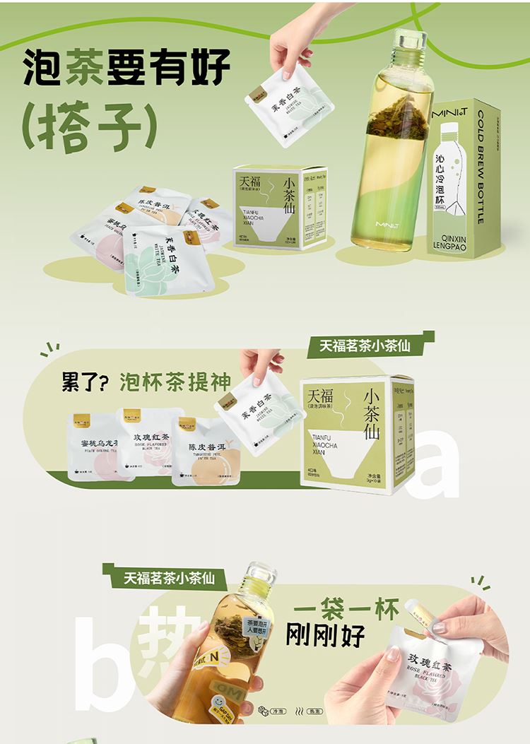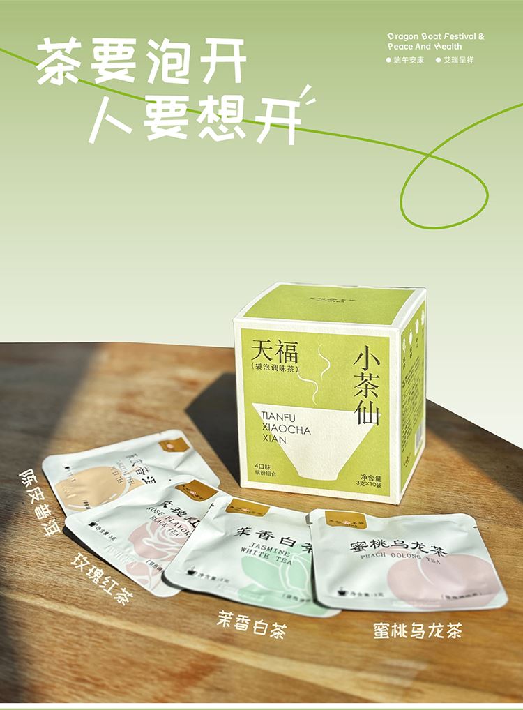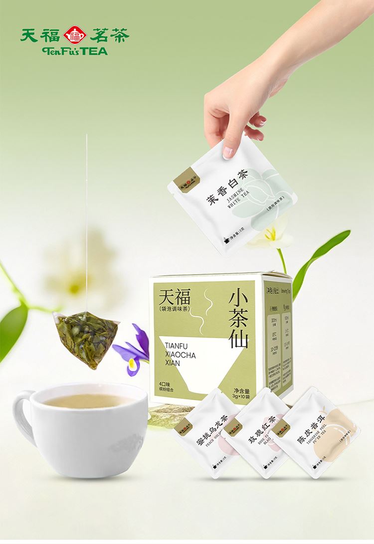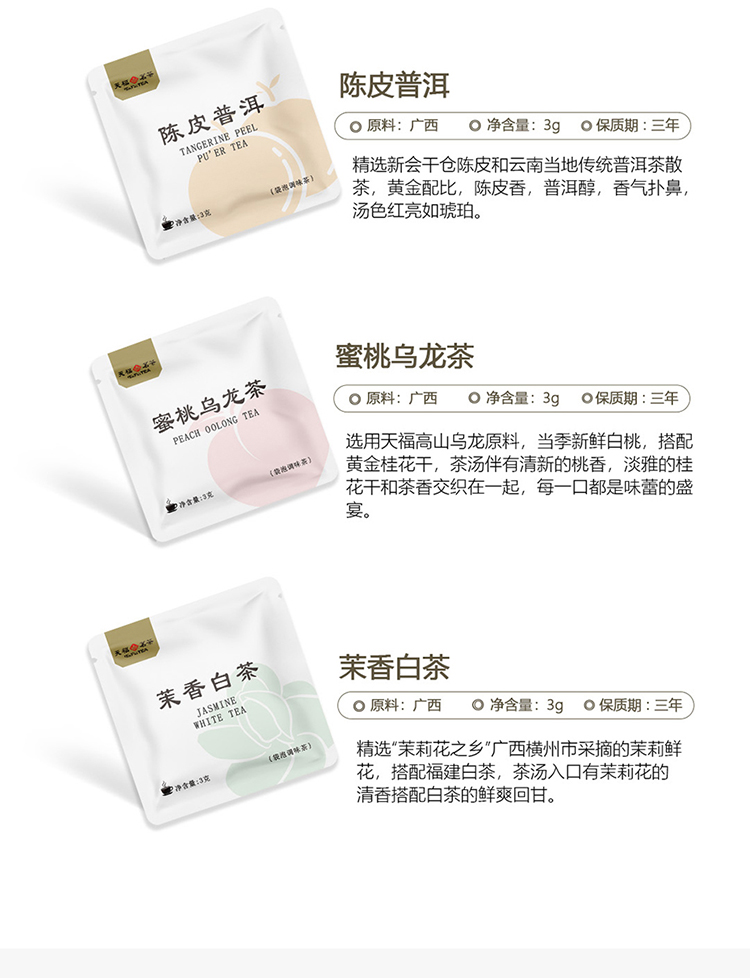 材质规格: 玫瑰红茶3克x2包 茉香自茶3克x2包 陈皮普洱茶3克x3包 蜜桃乌龙茶3克x3包 包装:彩盒 天福茗茶匠心制茶,主打“轻行东方茶”概念。 4款名茶原叶(蜜桃乌龙/茉香白茶/桂花红茶/陈皮普洱) 10袋锁鲜独立装,3秒注水即享大师级风味。 冷热双泡适配全天候场景,不同功效以茶养生。