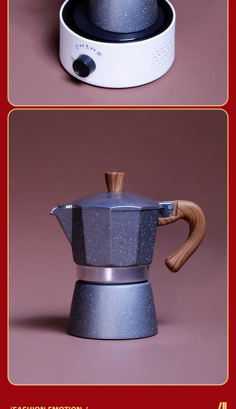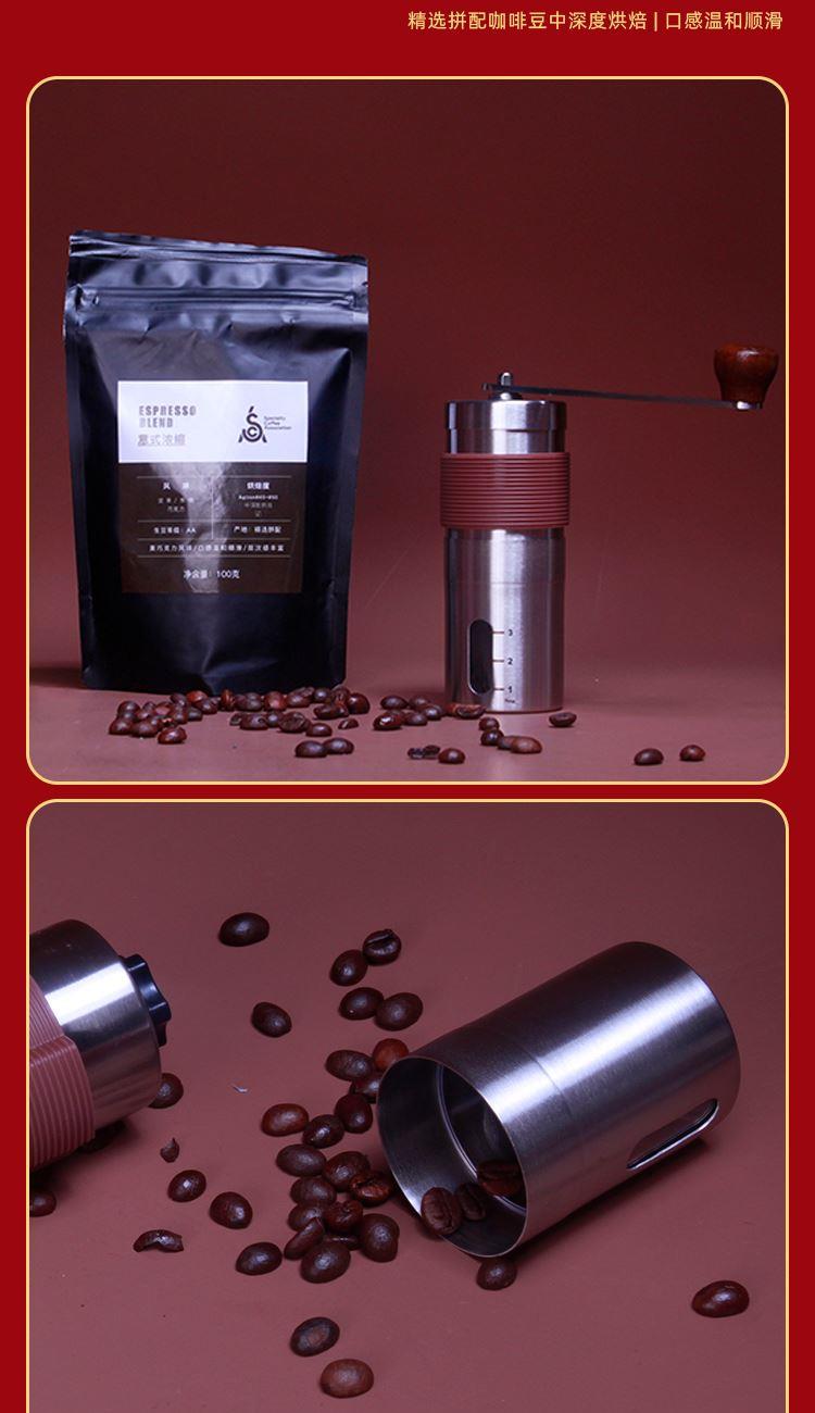 手磨咖啡机*1 意式拼配咖啡豆*1袋(100克) 星空灰色摩卡壶*1 150毫升 约3杯 红色咖啡杯*1说明书*1 600w摩卡壶加热炉*1 尺寸6*14cm 皮质手提礼盒*1